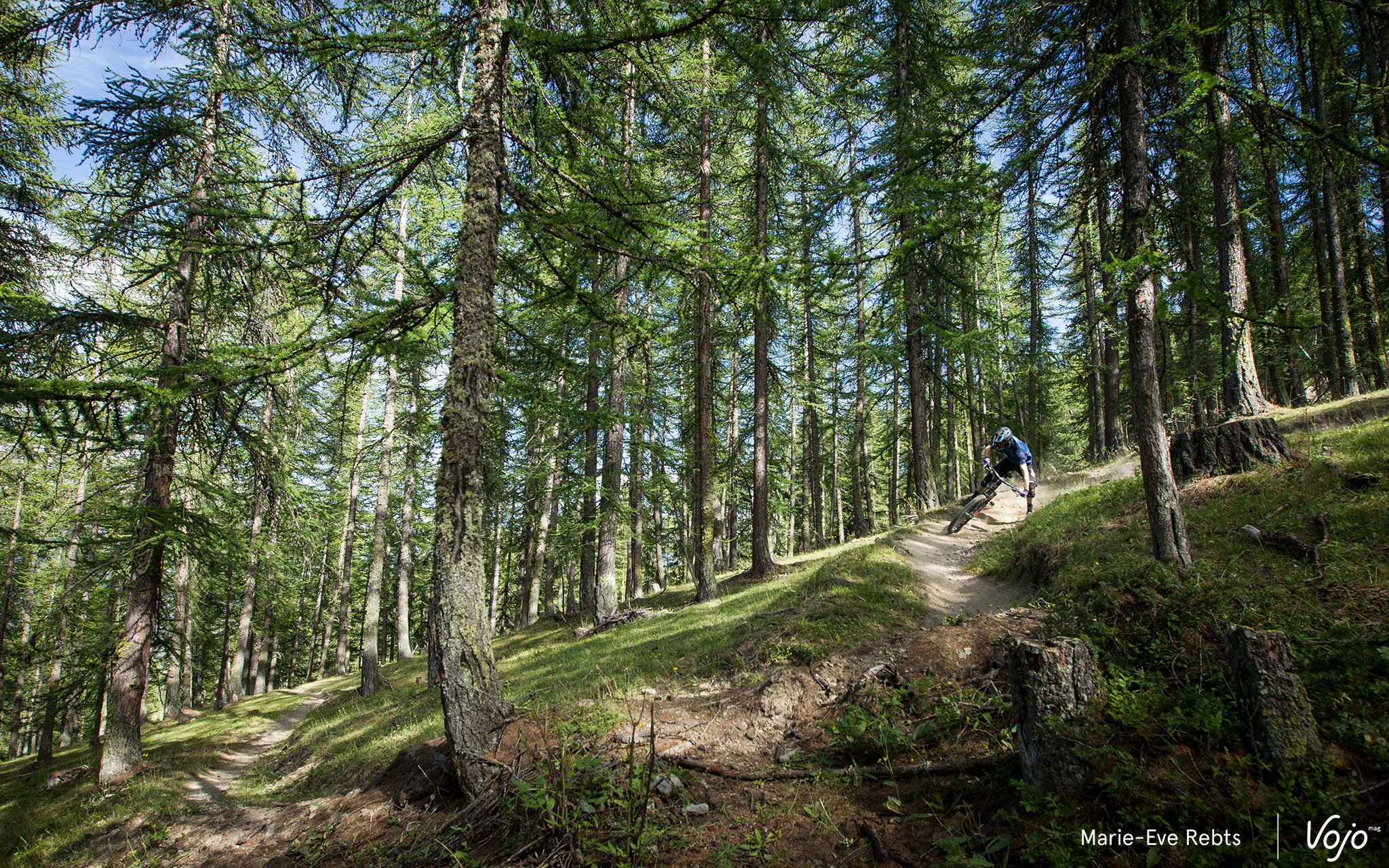 La similitude avec la géométrie de notre Nomad 3 le laissait présager : on est directement comme à la maison sur le HB.160. On baisse la potence pour pouvoir charger l’avant comme on aime, on procède à quelques ajustements par-ci par-là, et c’est parti pour quelques descentes sur le bike park de Serre-Chevalier ! Le bike se montre d’emblée très joueur et clairement fun à piloter. On le balance comme on veut et il se place facilement dans les virages, n’attendant ensuite qu’un petit kick pour décoller et se montrer très sain en l’air. Le lendemain, les choix en termes de géométrie prendront encore plus de sens une fois loin du bikepark, sur les sentiers étroits et sinueux que Guillaume Leon affectionne et où le HB.160 se montrera parfaitement dans son élément.