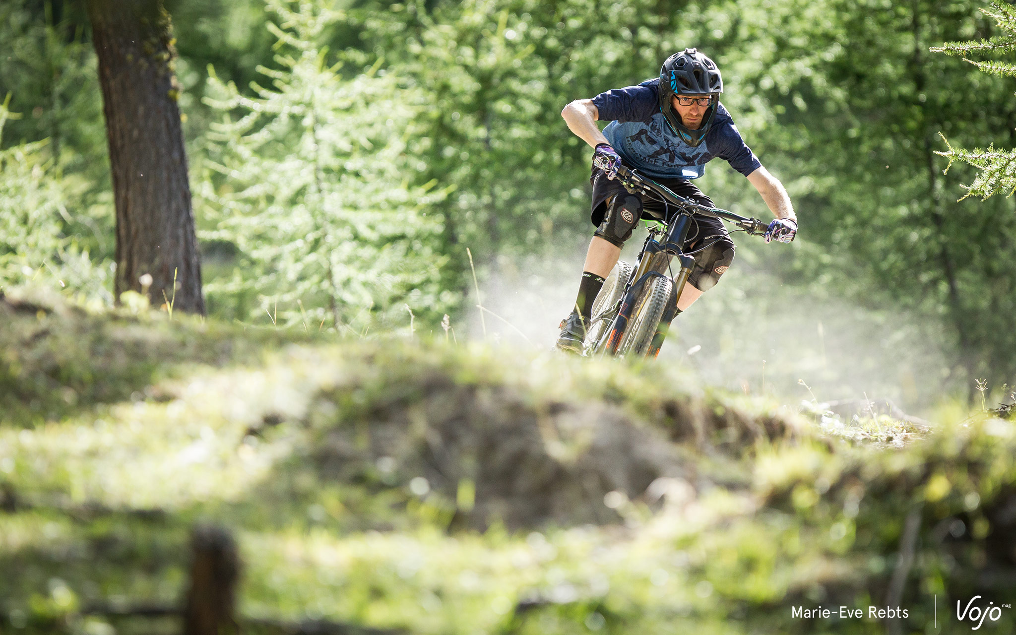 Une fois dans la pente, deux soucis apparaissent. Tout d’abord, on ne cracherait pas sur un disque de 200mm à l’avant, qui offrirait un surplus de mordant bienvenu face au 180mm d’origine, a fortiori avec les Tech 3 E4 hyper modulables mais moins puissants que les Tech 3 V4. Ensuite, c’est au niveau de la hauteur de selle que ça coince parfois. On ne l’a pas encore dit, mais c’est la différence qui saute au yeux quand on compare la géométrie de ce HB.160 avec notre bien connu Nomad 3 : en taille M par exemple, le Hope affiche un tube de selle 26mm plus haut que celui du Santa Cruz (445 vs 419).