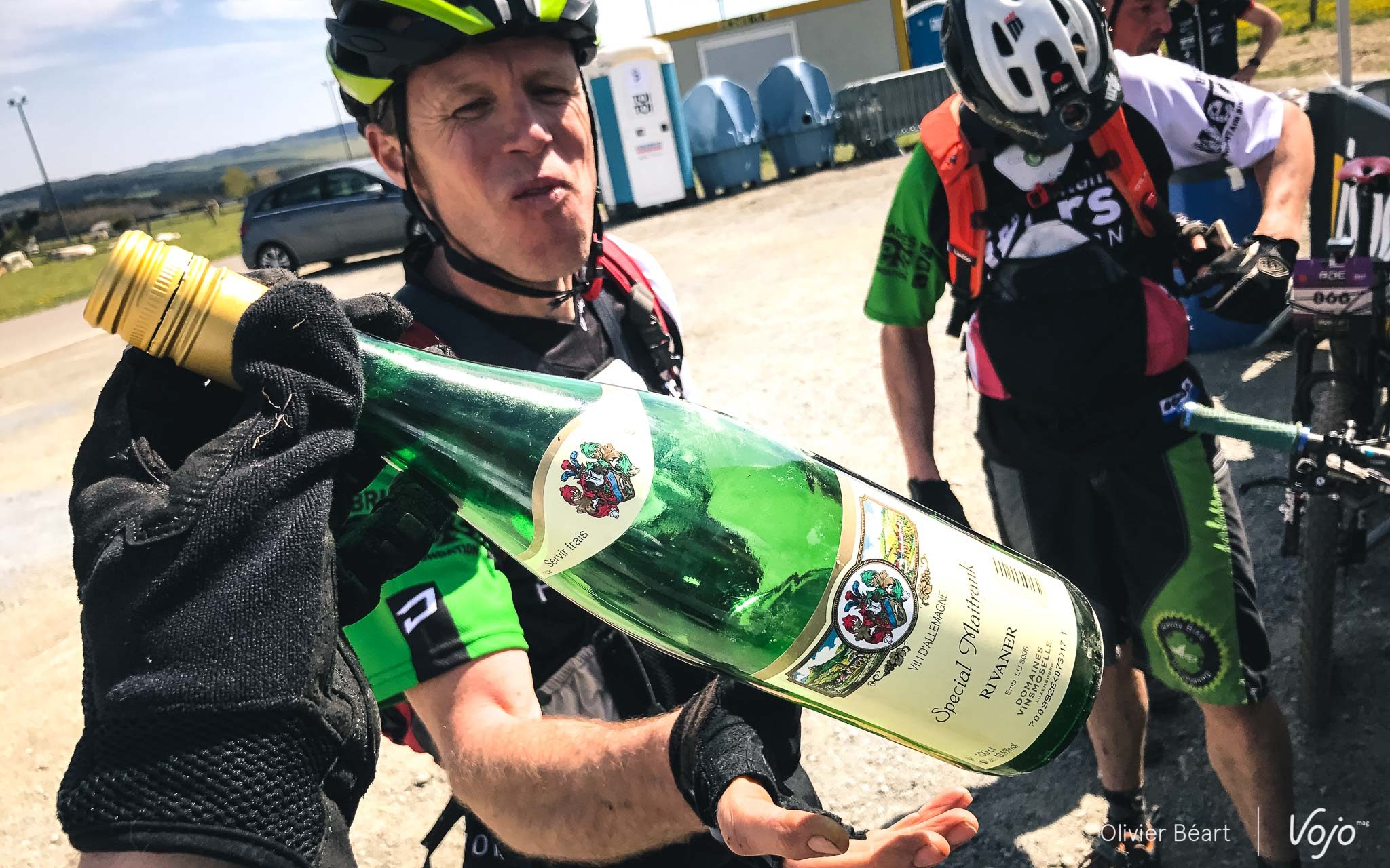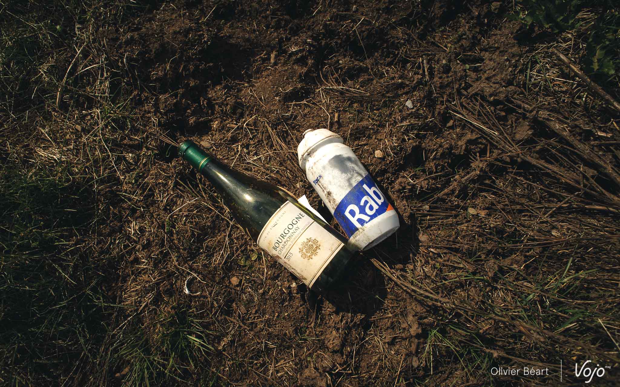 Plus sérieusement, si cette bouteille de vin nous a bien fait rigoler (et si nous l’avons ramenée dans notre sac), le bidon qui est à côté nous donne l’occasion de mettre le doigt sur une première pollution des vttistes sur ce genre d’événement. C’est très clairement une pollution involontaire car on ne connaît pas grand monde qui jetterait son bidon rempli en plein milieu d’un marathon, mais dans les descentes techniques, c’est bien souvent l’hécatombe.