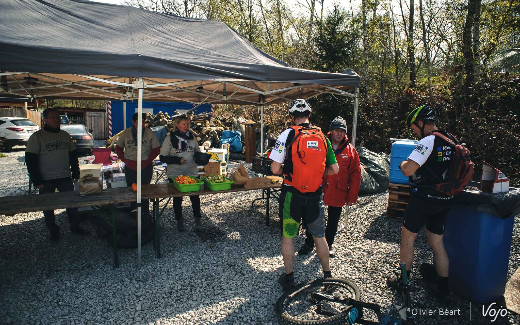 Nous voilà déjà au premier ravitaillement qui est en train d’être rangé tout doucement. Les bénévoles qui le tiennent sont vaguement au courant de notre passage et ils en profitent pour nous poser plein de questions sur ce que nous faisons. Leurs réactions sont enthousiastes, mais leurs yeux s’écarquillent quand ils voient tout ce qu’on sort de nos poches Can-Guru.
