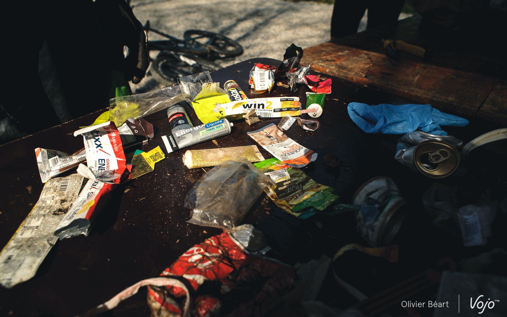 Sur une portion de route après environ 60km, c’est le carnage. Alors que les kilomètres qui précédaient étaient relativement propres (mais aussi assez cassants, donc c’était difficile de lâcher le cintre), cette zone plus calme invitait à reprendre des forces. Mais visiblement hélas aussi à jeter ses papiers. Ce n’est déjà pas une bonne idée à la base, mais là nous étions à la fois furieux et gênés car il y avait des maisons tout le long de cette route et plein d’emballages jusque dans les jardins des habitants ! Mettez-vous à leur place et demandez-vous quelle serait votre réaction en découvrant votre devanture souillée de la sorte ?