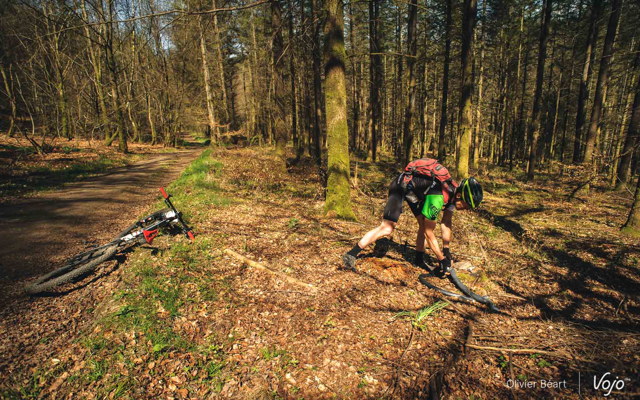 Peu avant 10h, les brigades vertes sont prêtes ! Nous sommes tous équipés d’un sac Can-Guru, une astucieuse poche ventrale qui peut servir tant en trail qu’en VTT pour emporter quelques petites choses avec soi, mais aussi pour ramasser les déchets qu’on trouve lors de ses balades (voir notre présentation ici). Lionel Van Eldom, son concepteur, est d’ailleurs avec nous ! Pour plus d’efficacité, nous allons nous diviser en deux équipes : l’une part sur le petit tracé de 25km et Lionel, Pascal (du club Bike4Life) ainsi que votre serviteur vont s’attaquer au marathon. La veille, trois des fondateurs de la MBF Belgium (Olivier, Bernard et Fabien) nous ont précédés sur les traces du Roc d’Ardenne. Les chemins étaient donc propres le samedi soir…