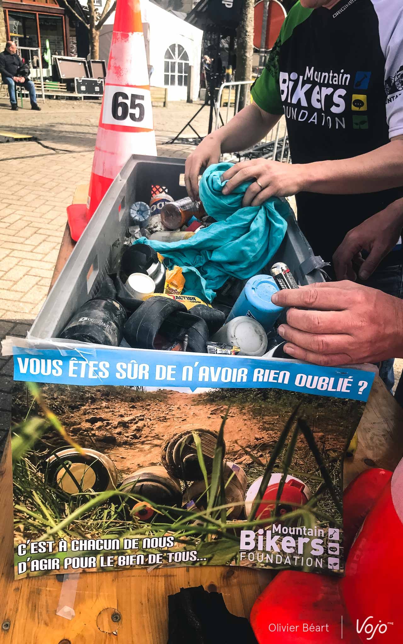 De retour sur le stand de la MBF Belgium, on fait le compte de ces deux journées passées sur les sentiers. Au-delà des objets insolites retrouvés (un t-shirt, des sacoches de selle, un jouet d’enfant, un gant, etc.) on en arrive tout de même au constat qu’il y a bien juste quelques gros c… qui polluent et qui sont responsables d’une grosse partie de la pollution sur les sentiers.