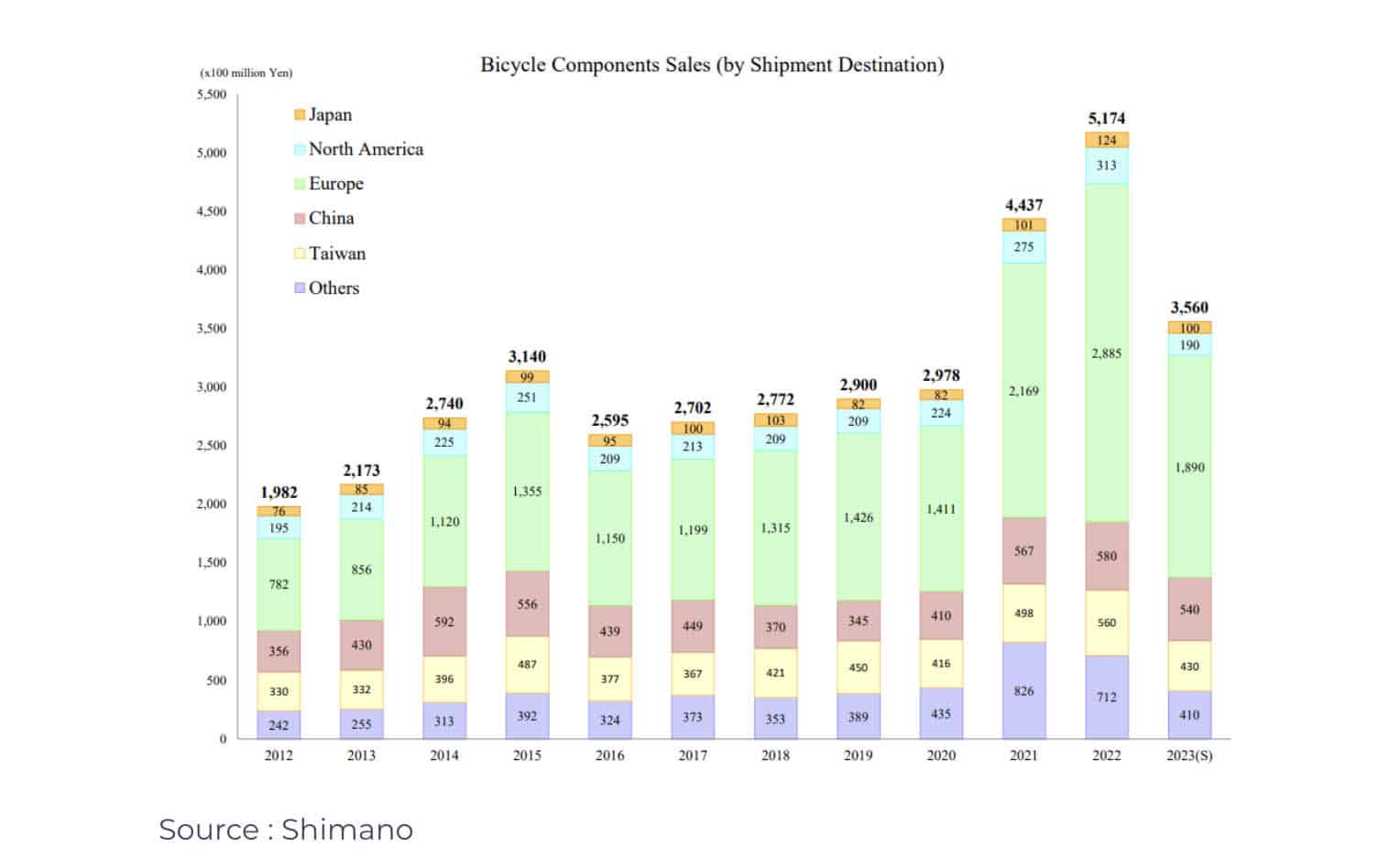 On peut tout de même trouver quelques éléments en cherchant, notamment au niveau des entreprises cotées en bourse, qui sont obligées de publier des résultats. Voici par exemple les derniers chiffres de Shimano pour ce qui est du chiffre d’affaires. Certes, il ne s’agit que d’une seule entreprise, mais Shimano est est un excellent baromètre global dans la mesure où il s’agit du plus grand équipementier mondial.