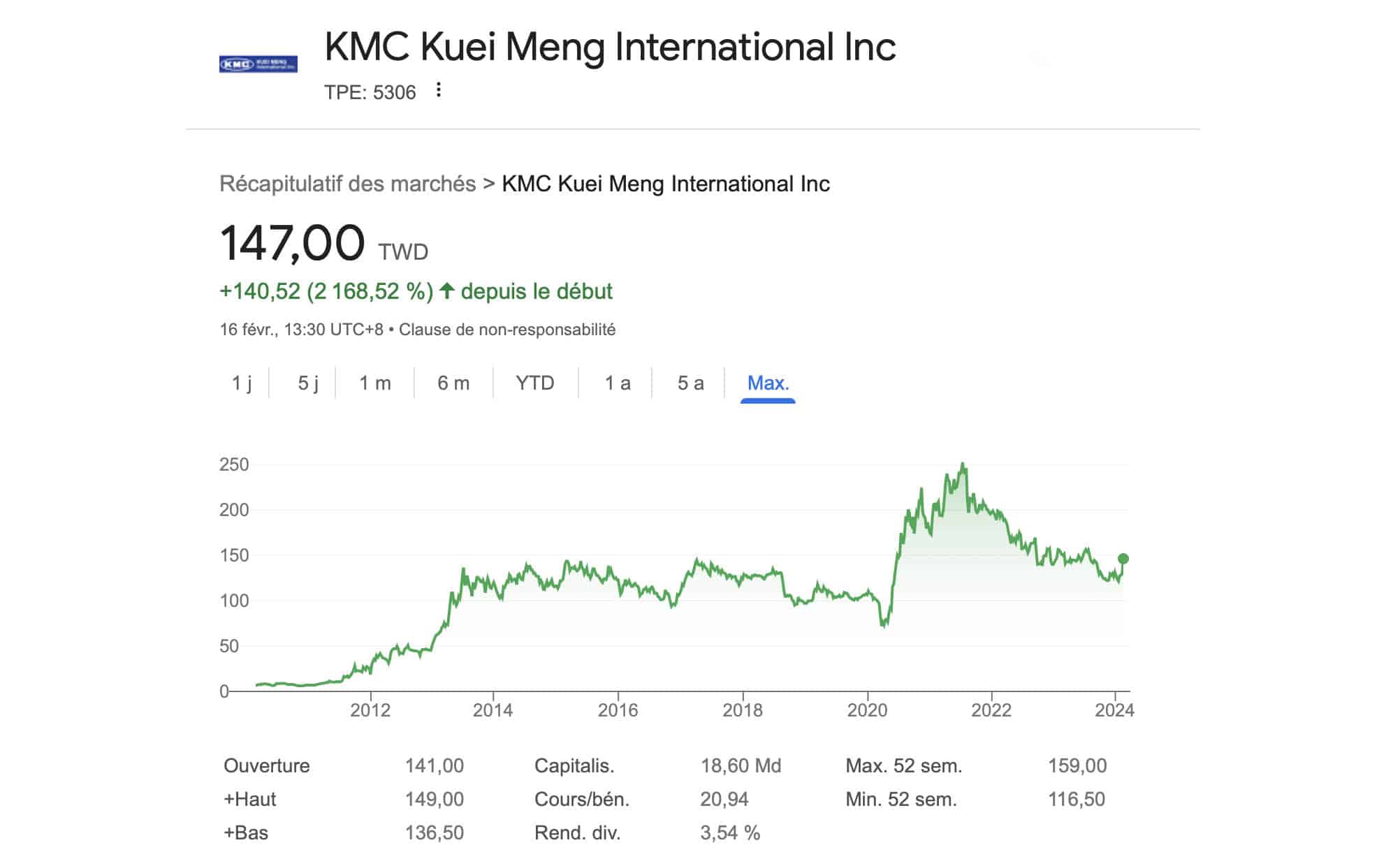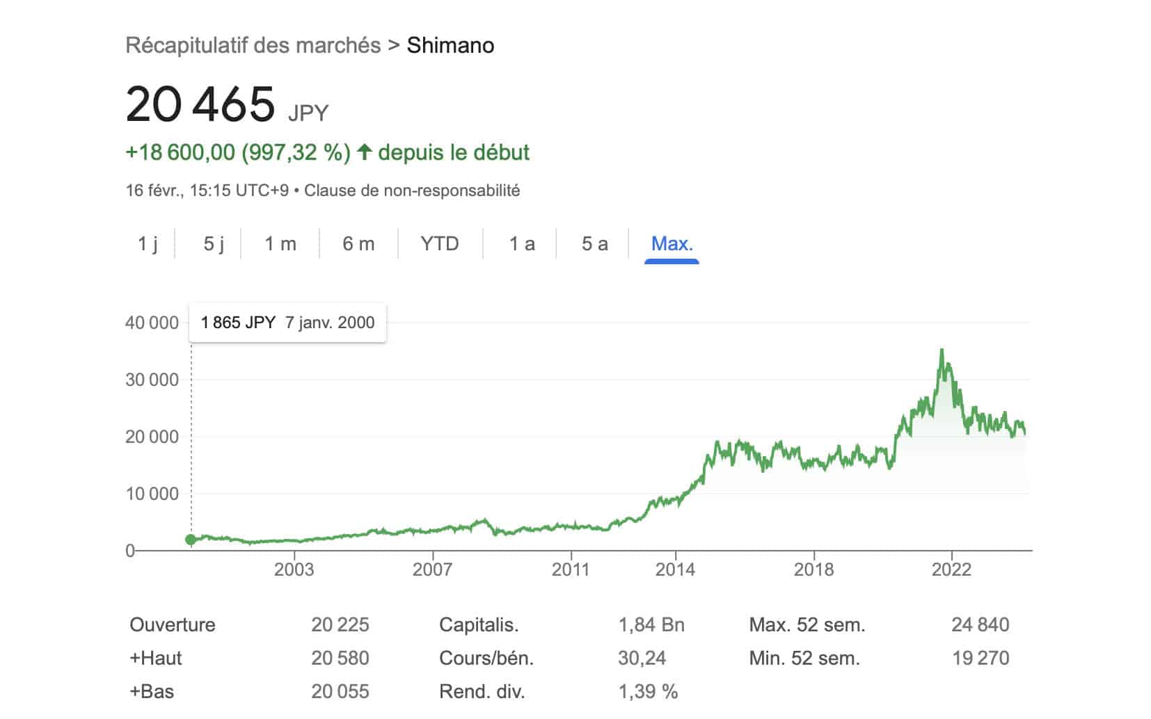 Regardez aussi l’évolution des cours des actions de quelques poids lourd du secteur du vélo, cotés en bourse. La tendance est partout la même, avec une croissance globale de la valeur de l’action qui ne se dément pas à long terme pour Shimano, Giant et KMC pris en exemples ci-dessus.