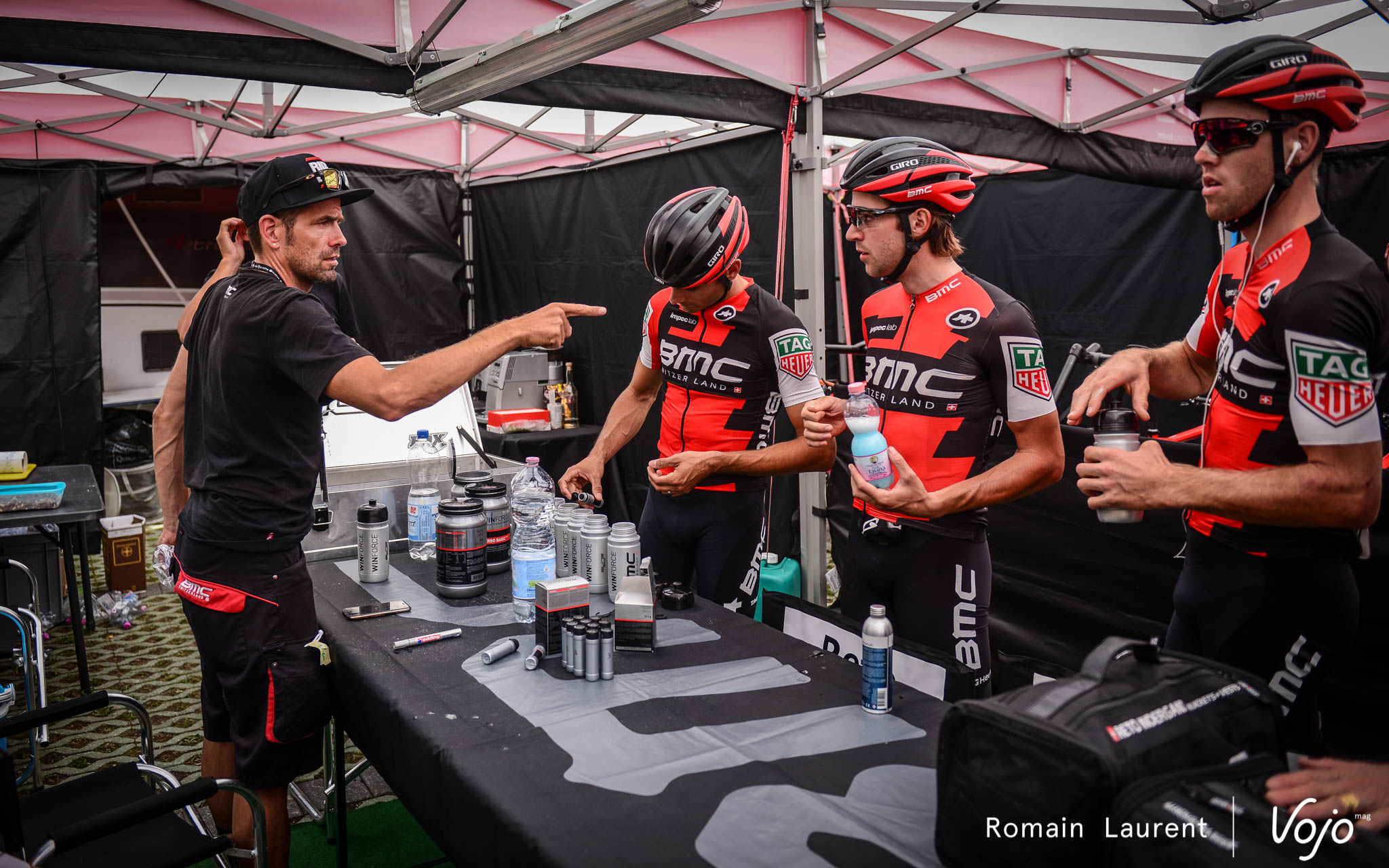 Un des rituels les plus importants avant la course est celui des bidons. Chaque coureur a ses propres gourdes qu’il prépare et marque lui-même avec un ordre bien précis afin d’être ravitaillé avec la bonne boisson et les bons gels à chaque tour. Chacun a ses préférences et ses dosages même si tous utilisent les produits Winforce, un des sponsors du team. Lukas Flückiger, blessé aux côtes, ajoute une petite séance de strapping. A le voir serrer les dents, on a mal pour lui. Et pourtant, pas question de ne pas courir !