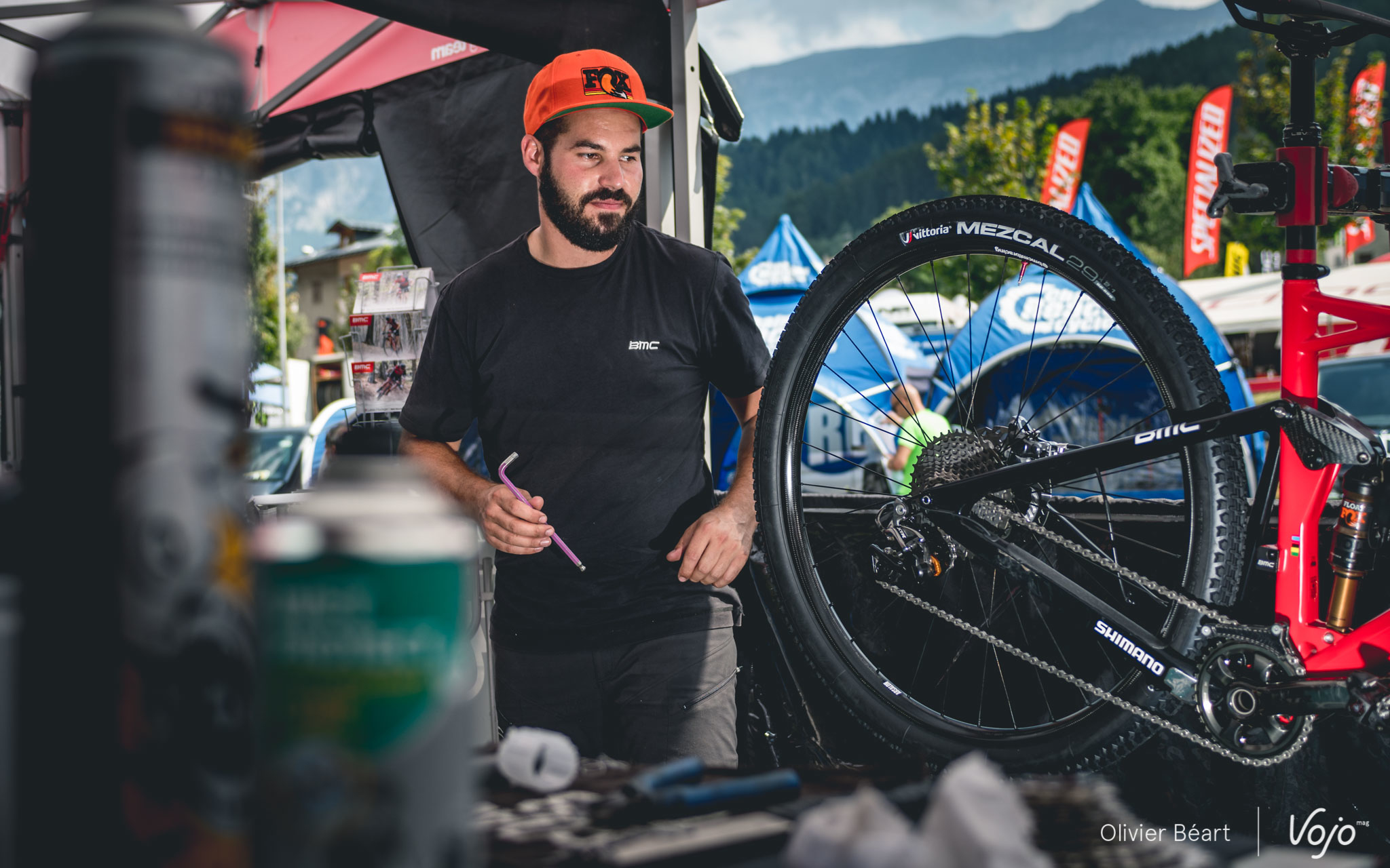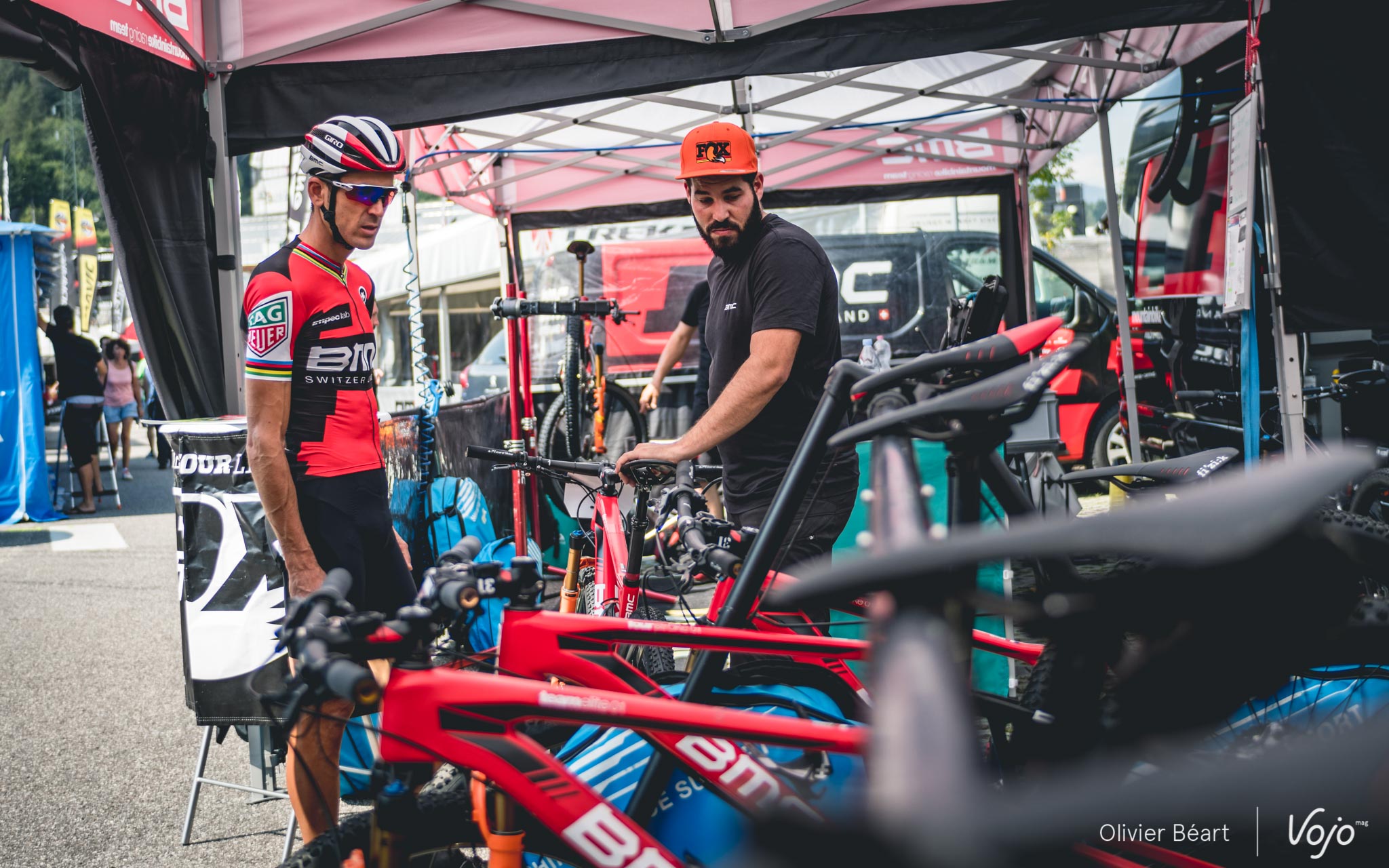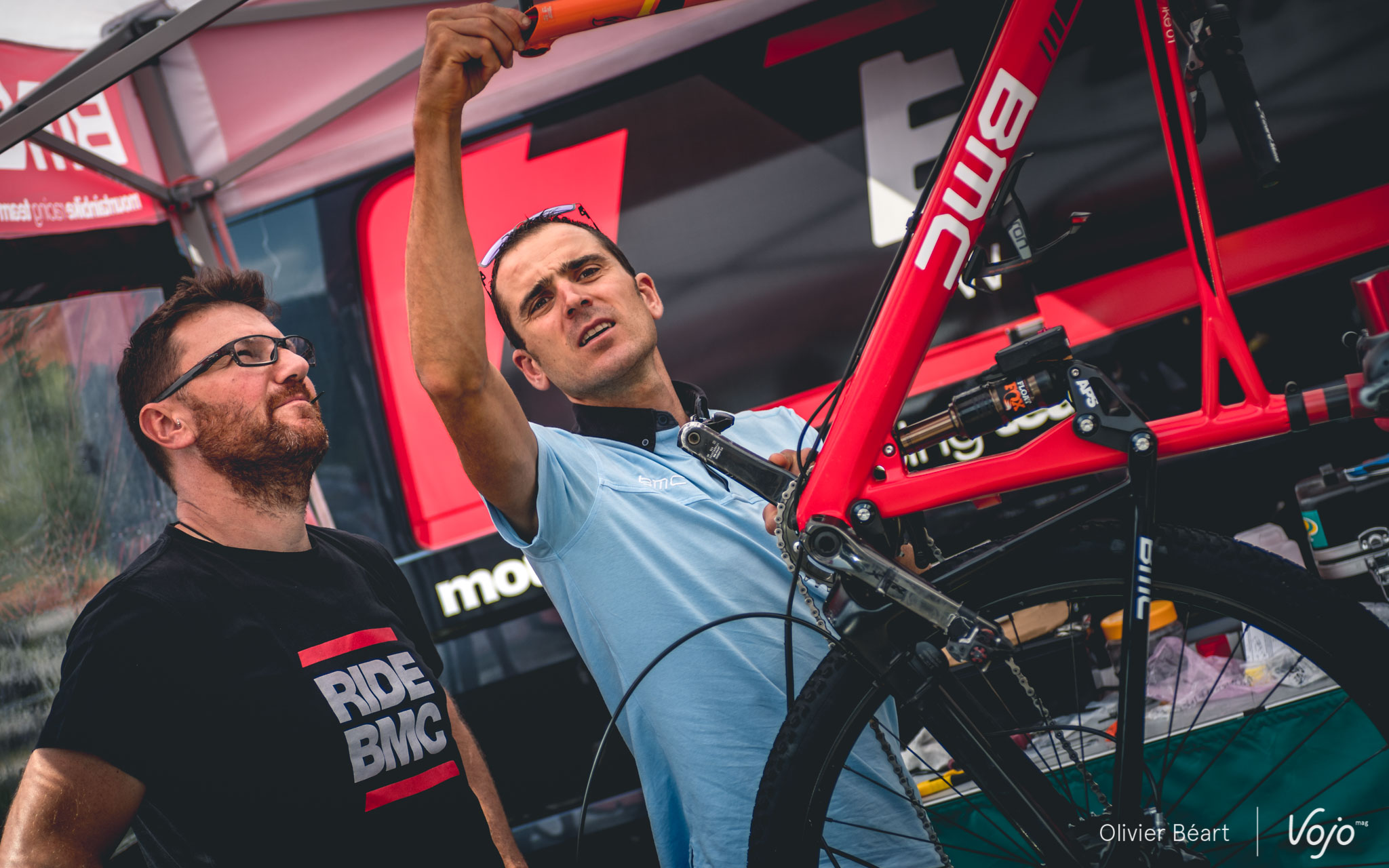 Peu après, vers 10h30, Julien Absalon arrive dans la tente. Après avoir posé ses affaires, il se dirige vers les vélos en compagnie de Benoît di Natale, le chef mécano de l’équipe. Le choix du vélo est facile pour Julien qui roule toujours sur le BMC Fourstroke full-suspendu et celui des pneus est figé lui aussi : ce sera du Vitoria Mezcal en 2.1 à l’avant comme à l’arrière.
