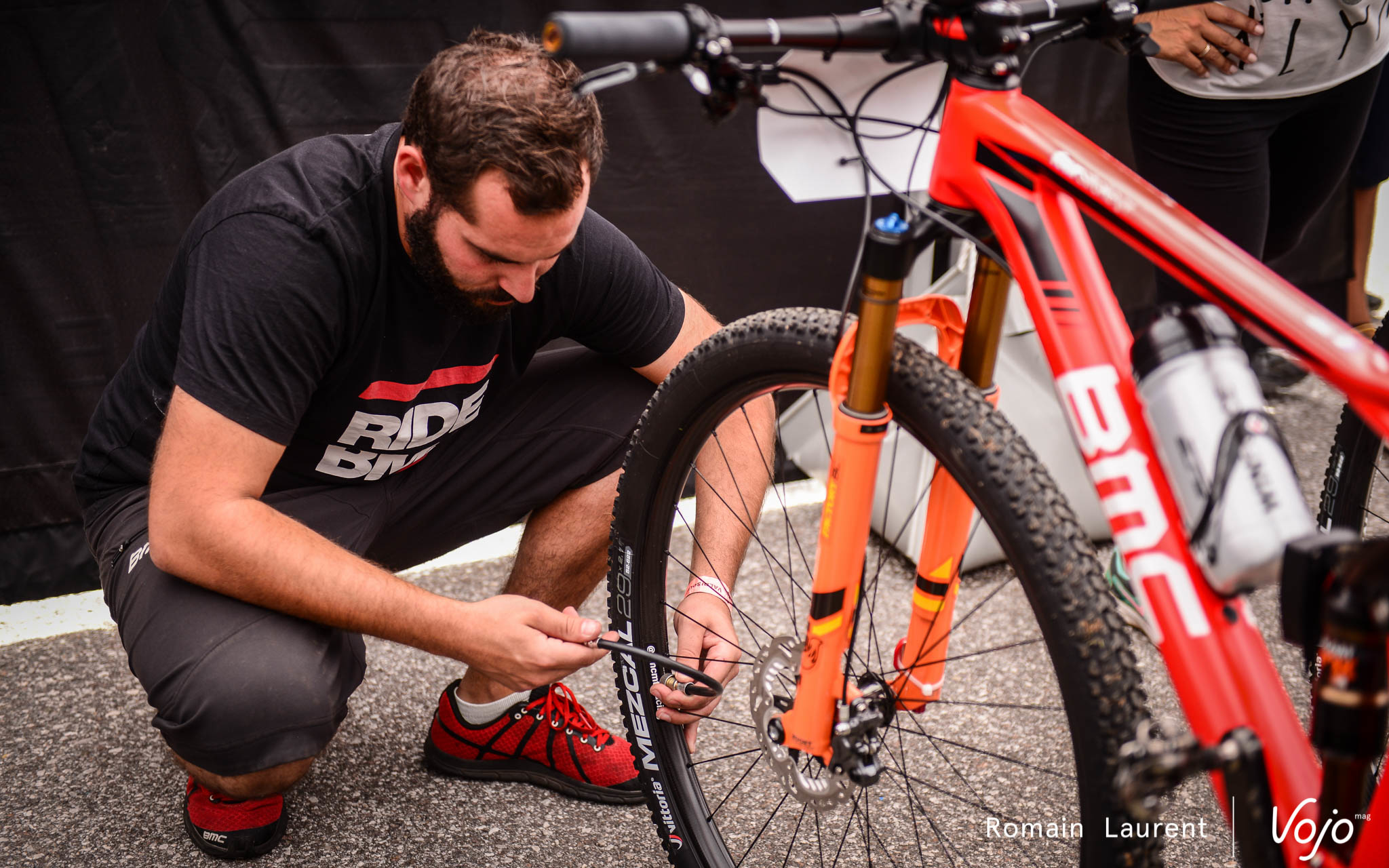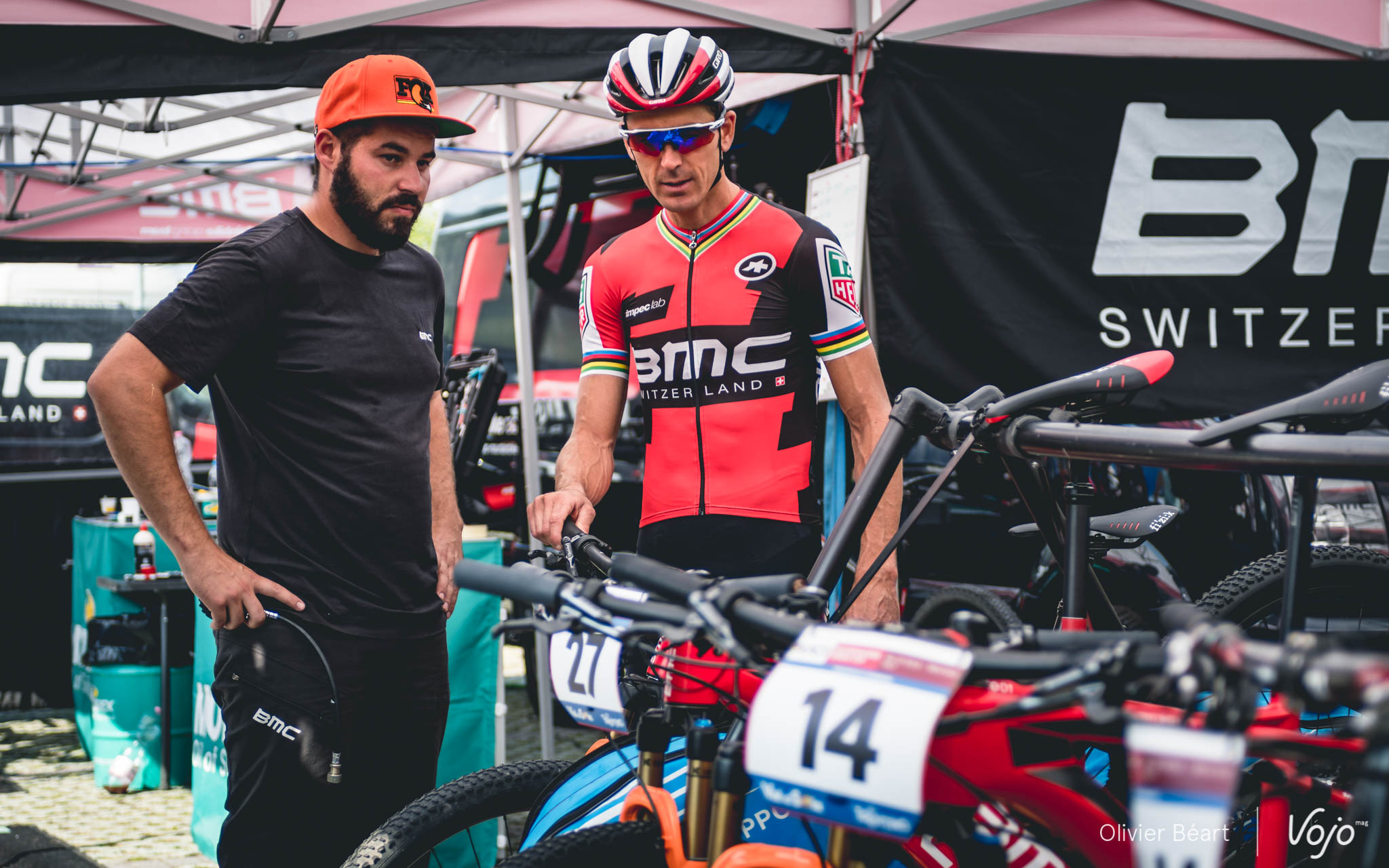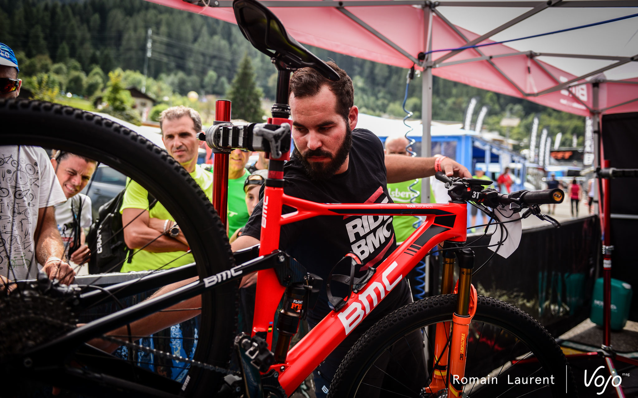 Peu après, vers 10h30, Julien Absalon arrive dans la tente. Après avoir posé ses affaires, il se dirige vers les vélos en compagnie de Benoît di Natale, le chef mécano de l’équipe. Le choix du vélo est facile pour Julien qui roule toujours sur le BMC Fourstroke full-suspendu et celui des pneus est figé lui aussi : ce sera du Vitoria Mezcal en 2.1 à l’avant comme à l’arrière.