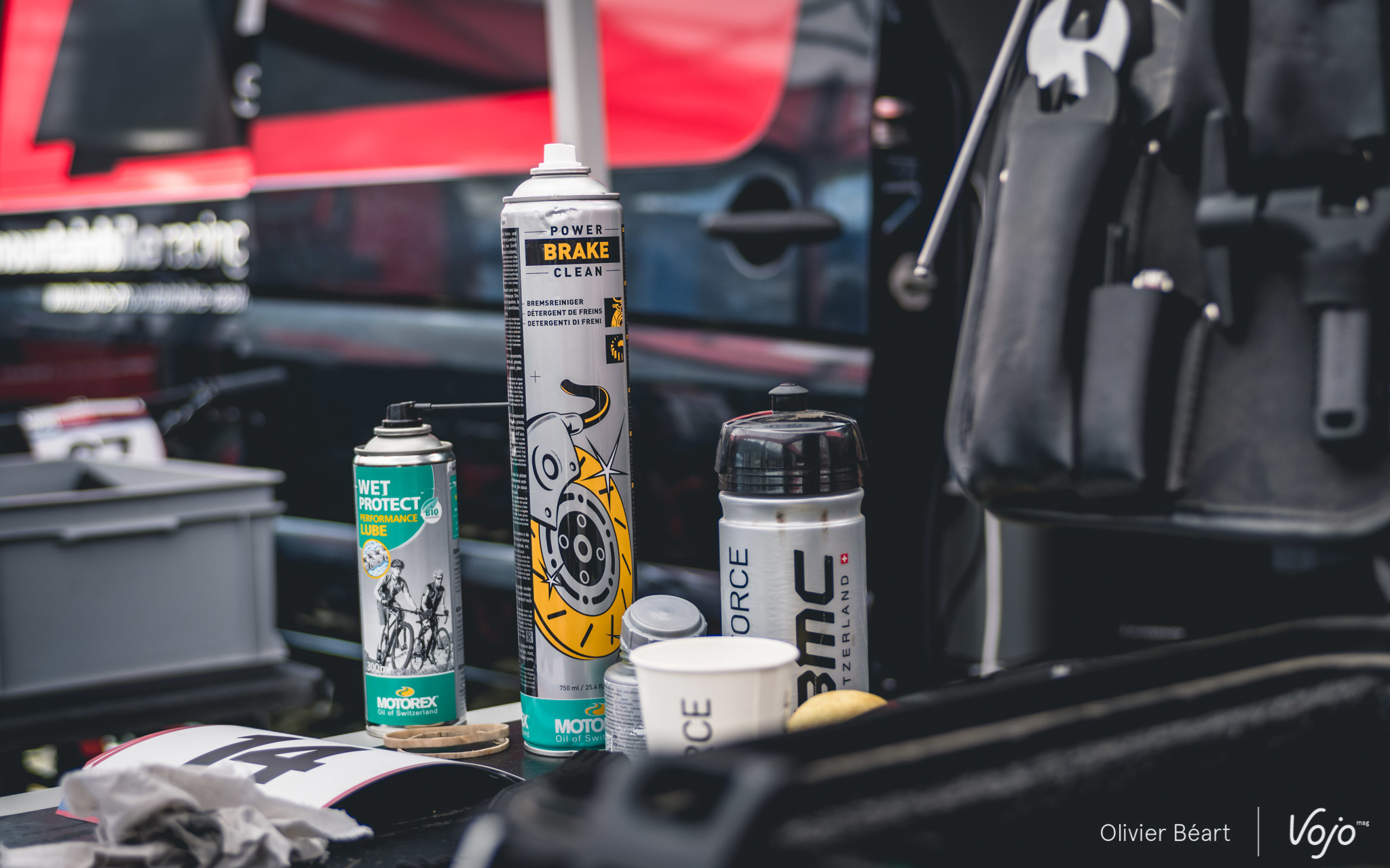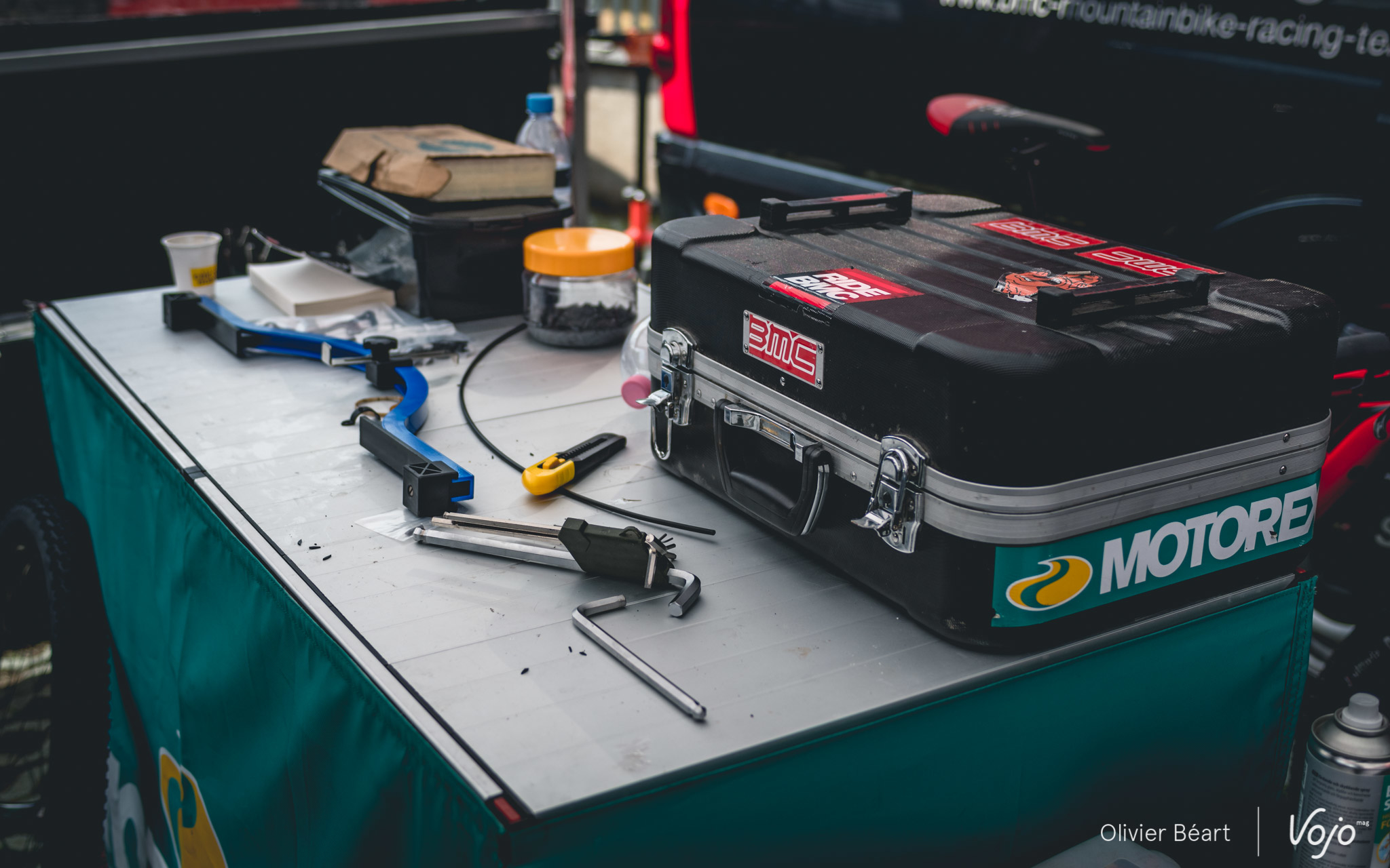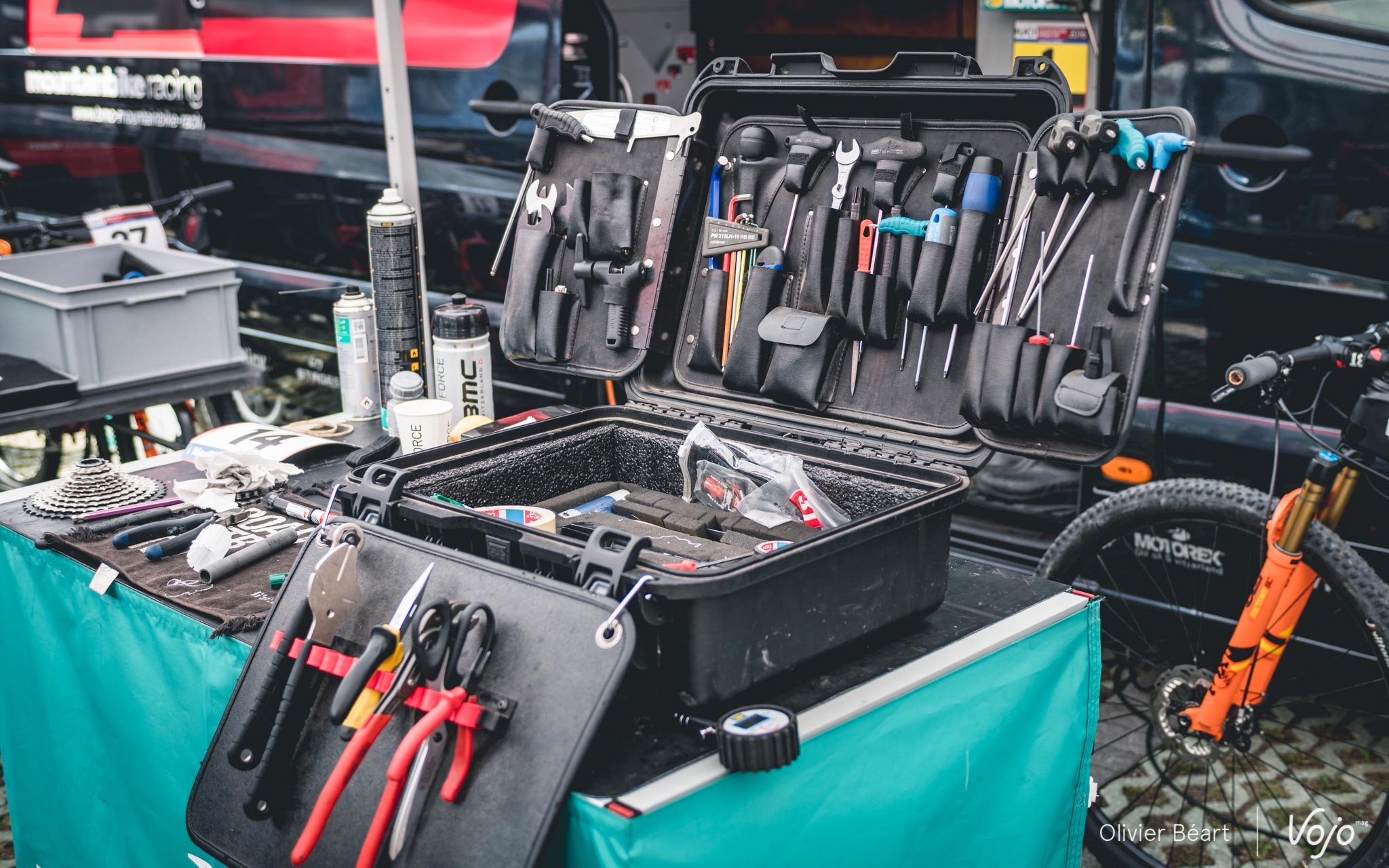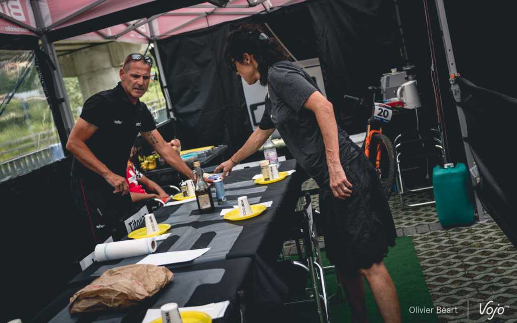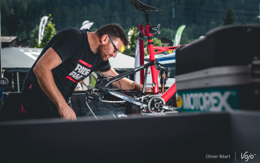 Les journées sont longues : elles commencent à 9h et se terminent rarement avant 19h. Il faut aussi s’occuper de monter le stand dès le mercredi et en journée, quand les pilotes roulent, les mécanos embarquent leur trousse à outil ainsi que des roues de réserve pour aller sur le bord du circuit afin de dépanner les pilotes en cas de souci et leur éviter de perdre du temps. « L’ambiance est bonne entre mécanos dans les zones techniques. En cas de besoin on se dépanne. Bien sûr, le vtt reste un sport mécanique et chacun est responsable de la préparation de sa machine, mais une course ne doit pas se gagner en laissant un autre dans la m… alors qu’on a l’outil qu’il lui faut à portée de main », explique Benoît.