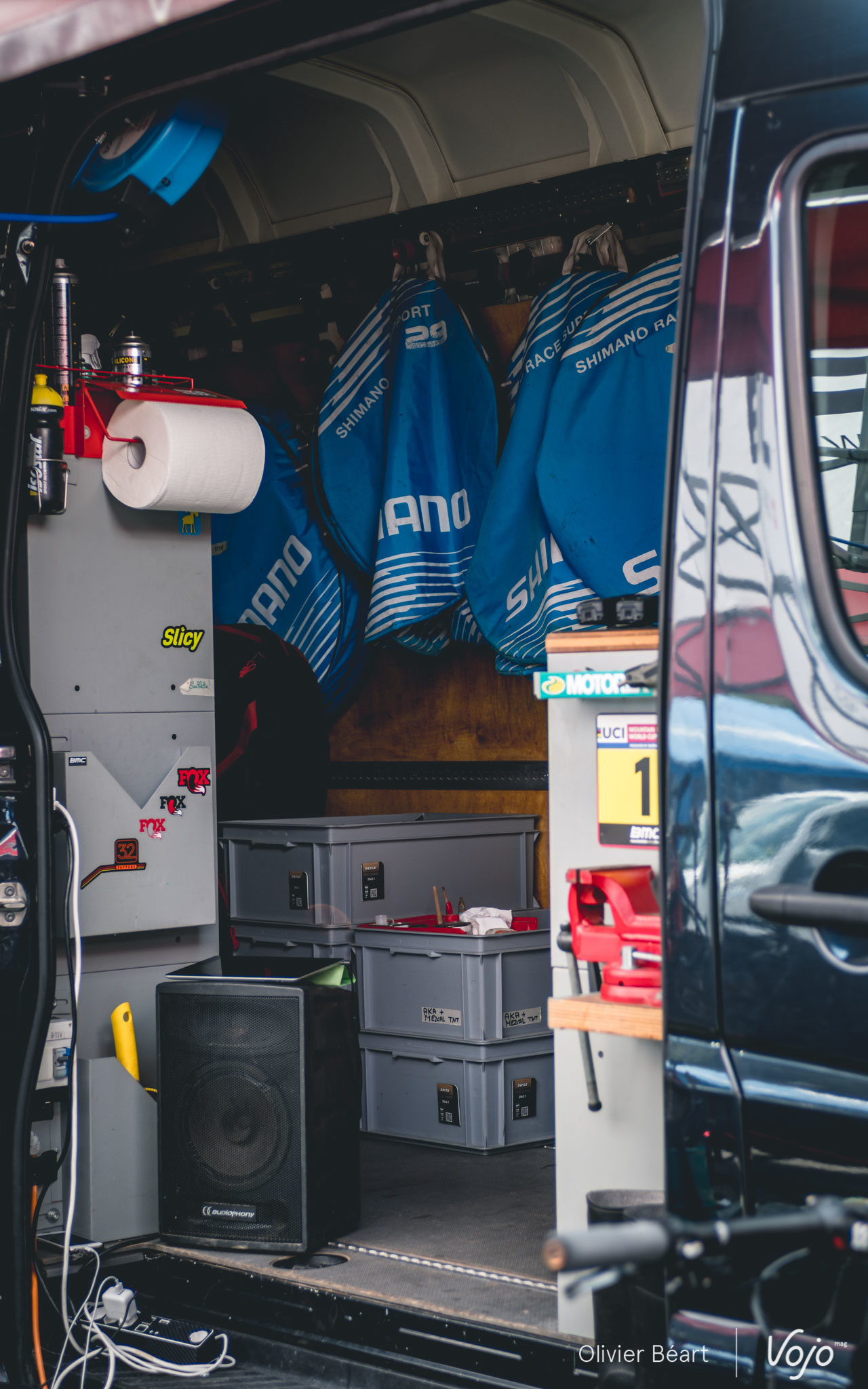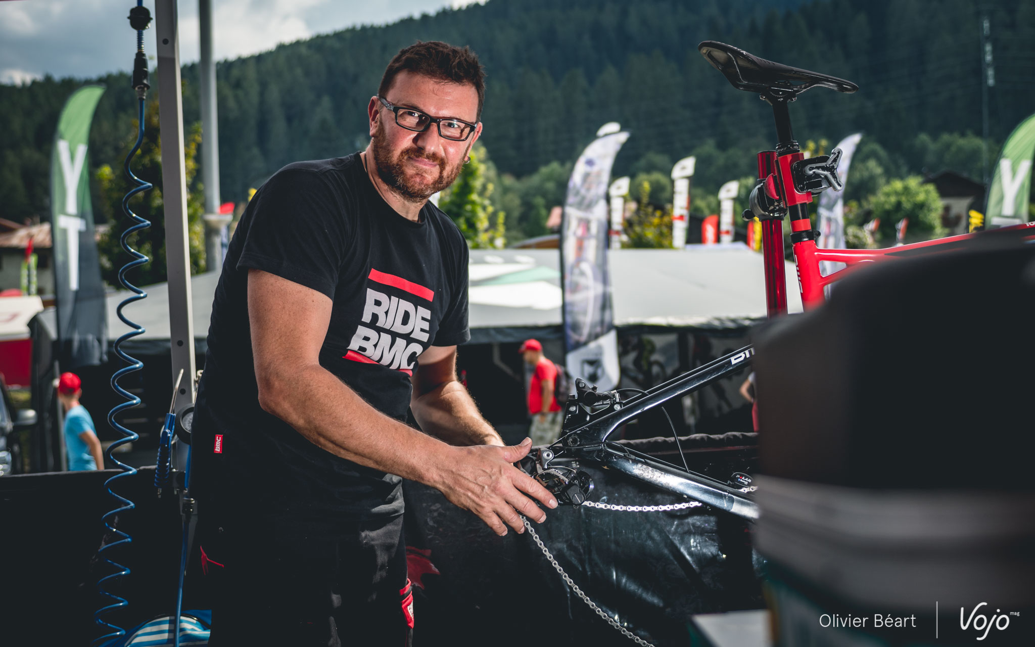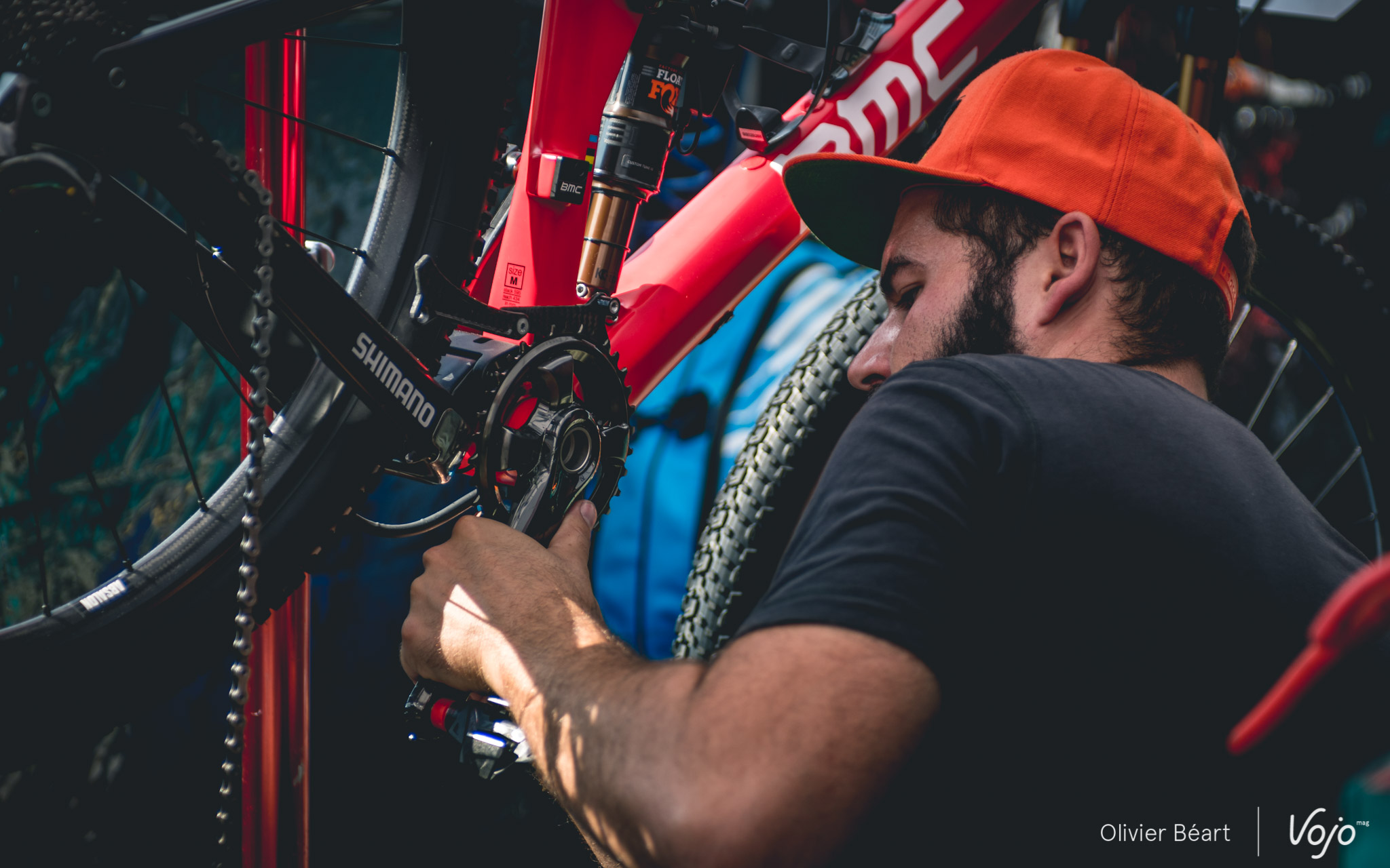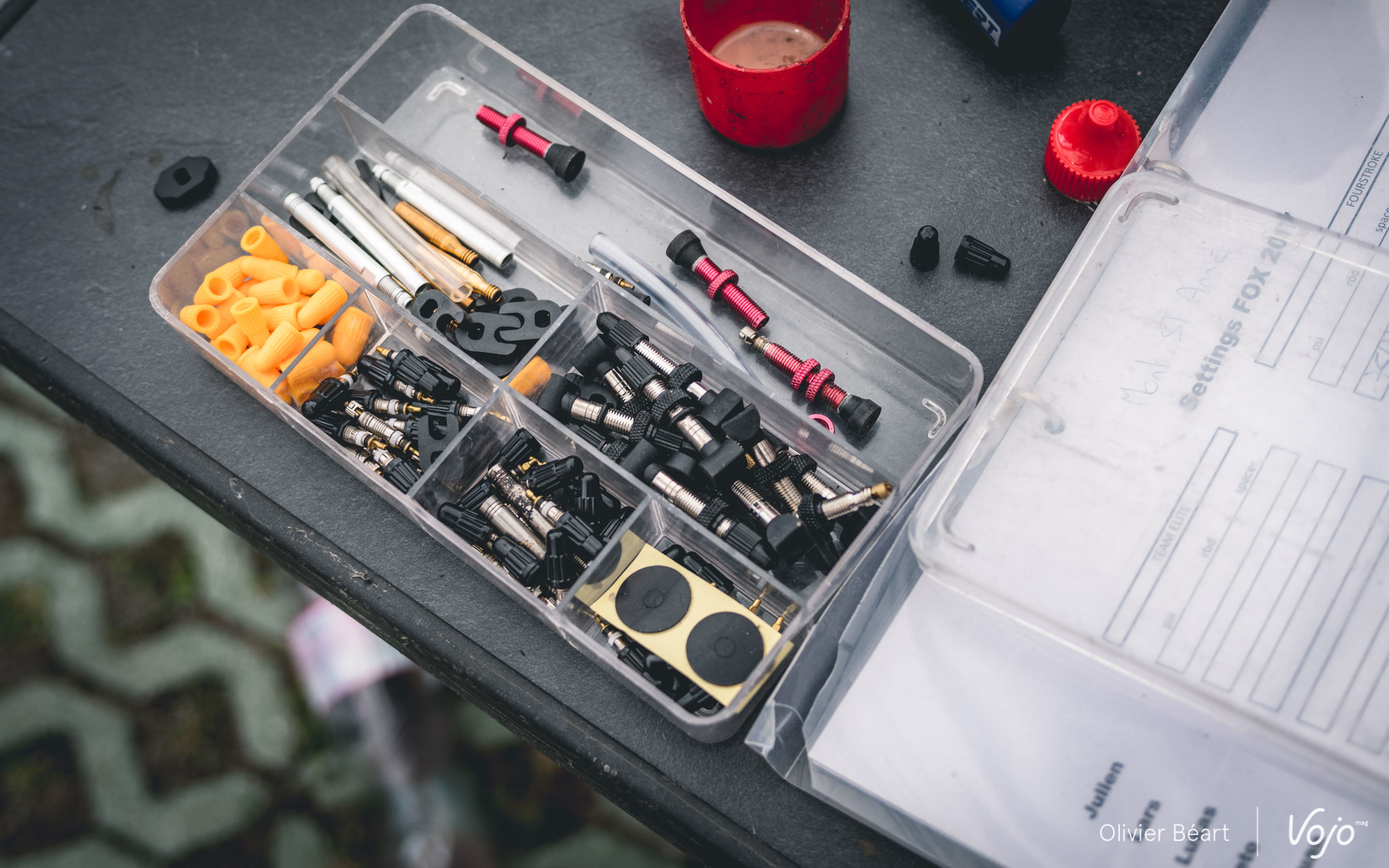 Les journées sont longues : elles commencent à 9h et se terminent rarement avant 19h. Il faut aussi s’occuper de monter le stand dès le mercredi et en journée, quand les pilotes roulent, les mécanos embarquent leur trousse à outil ainsi que des roues de réserve pour aller sur le bord du circuit afin de dépanner les pilotes en cas de souci et leur éviter de perdre du temps. « L’ambiance est bonne entre mécanos dans les zones techniques. En cas de besoin on se dépanne. Bien sûr, le vtt reste un sport mécanique et chacun est responsable de la préparation de sa machine, mais une course ne doit pas se gagner en laissant un autre dans la m… alors qu’on a l’outil qu’il lui faut à portée de main », explique Benoît.