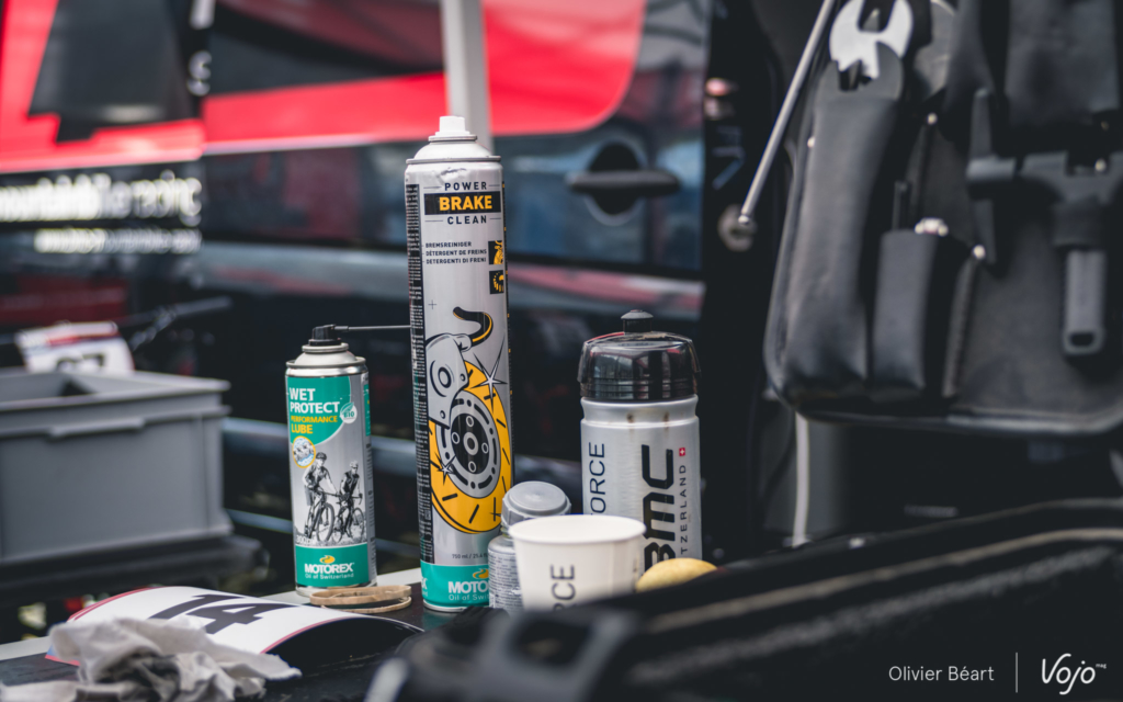 En effet, les vélos paraissent comme neufs à peine une heure après le retour des pilotes de leur entraînement. Mais ce n’est pas encore suffisant et quand nous approchons de Fred, il nous explique : « Je vais démonter le pédalier et la fourche pour contrôler les roulements. Je vais aussi vérifier les roues. Mais depuis que nous sommes passés sur des jantes carbone, je dois dire que cela va beaucoup mieux. Avant, avec les alu super légères, on avait souvent du voile ou des pocs mais ici ça ne bouge pas. »