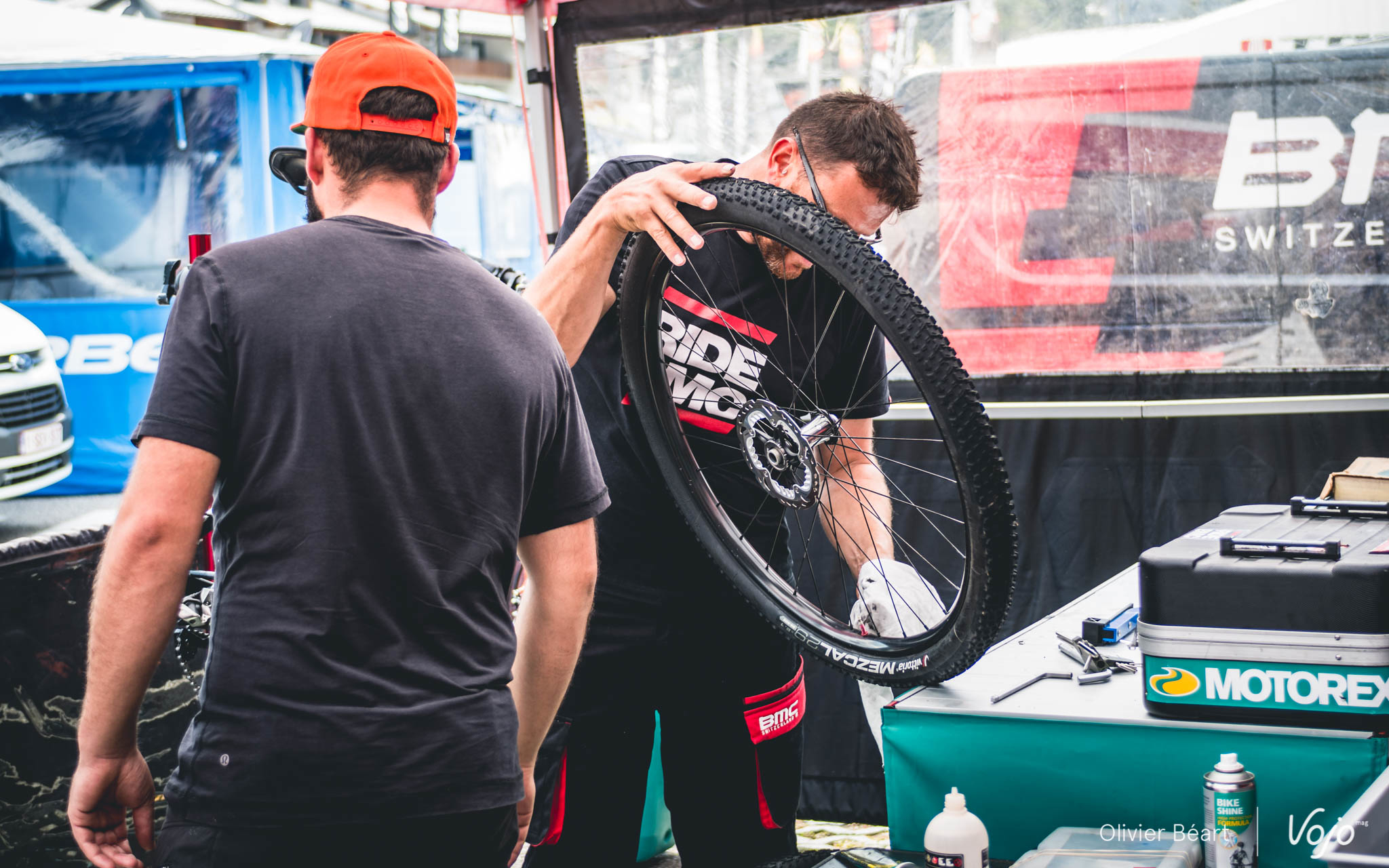 D’un côté, il y a Benoît di Natale, le chef mécano dont nous avons déjà fait connaissance (à gauche), et de l’autre, il y a Fred Gerber, qui a abandonné son magasin de vélos en Suisse il y a quelques années pour rejoindre l’équipe BMC sur l’ensemble de la saison de Coupe du Monde.