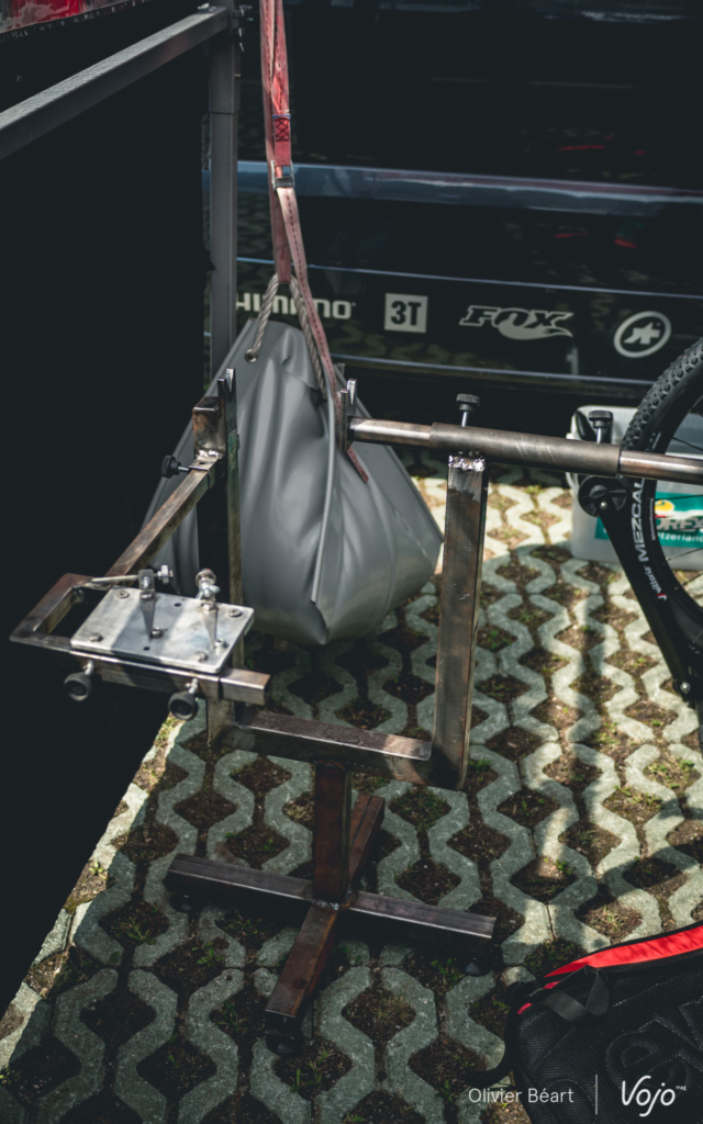 Fred a simplement une compétence particulière : le montage des roues. Comme Shimano, sponsor de l’équipe, laisse le choix des jantes aux coureurs et demande seulement qu’ils utilisent les moyeux de la marque, cette compétence a une grand importance. Fred a d’ailleurs son banc de montage custom qui n’est jamais bien loin et qui trône dans un coin du stand au cas où. « C’est une réplique d’un banc qui se trouvait dans un magasin où j’ai travaillé et que j’adorais… mais je n’ai jamais retrouvé ce modèle. Alors je me le suis fait fabriquer sur mesure. »