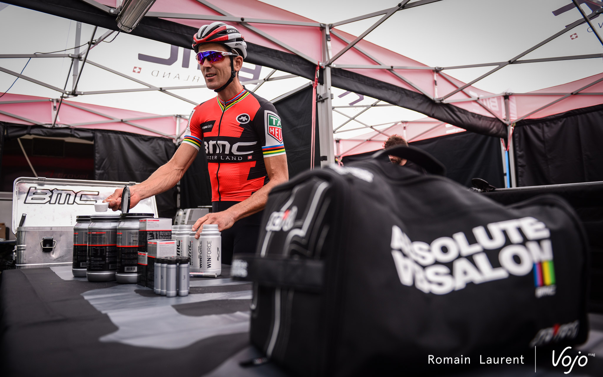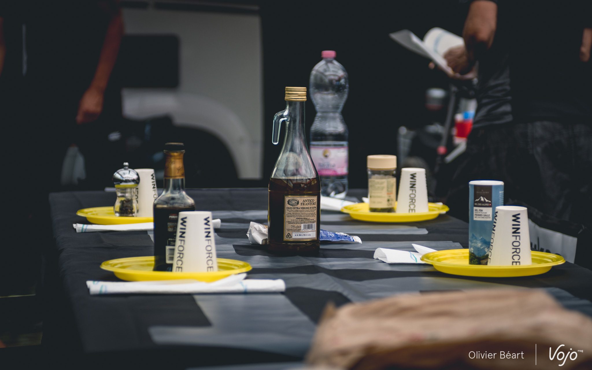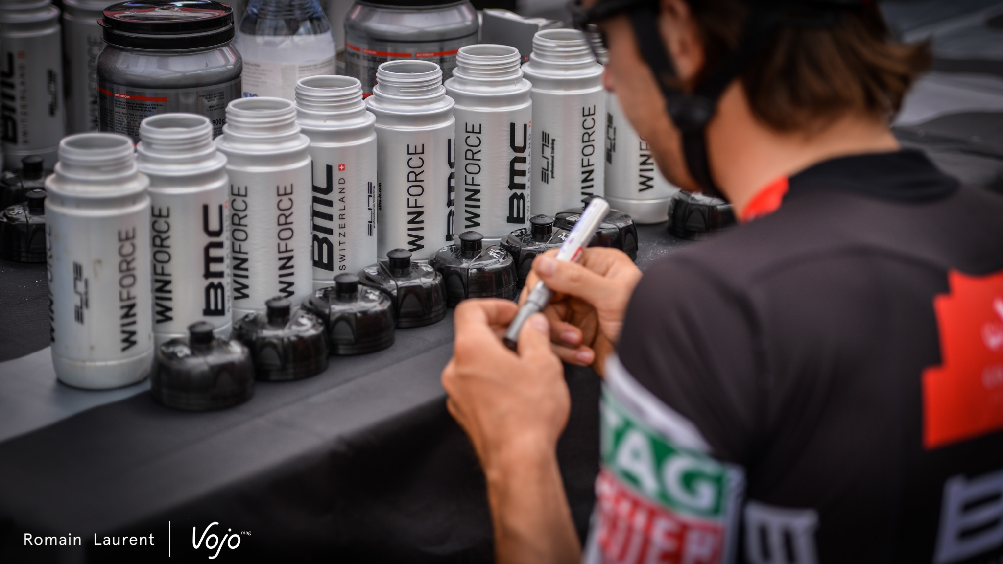 Un des rituels les plus importants avant la course est celui des bidons. Chaque coureur a ses propres gourdes qu’il prépare et marque lui-même avec un ordre bien précis afin d’être ravitaillé avec la bonne boisson et les bons gels à chaque tour. Chacun a ses préférences et ses dosages même si tous utilisent les produits Winforce, un des sponsors du team. Lukas Flückiger, blessé aux côtes, ajoute une petite séance de strapping. A le voir serrer les dents, on a mal pour lui. Et pourtant, pas question de ne pas courir !