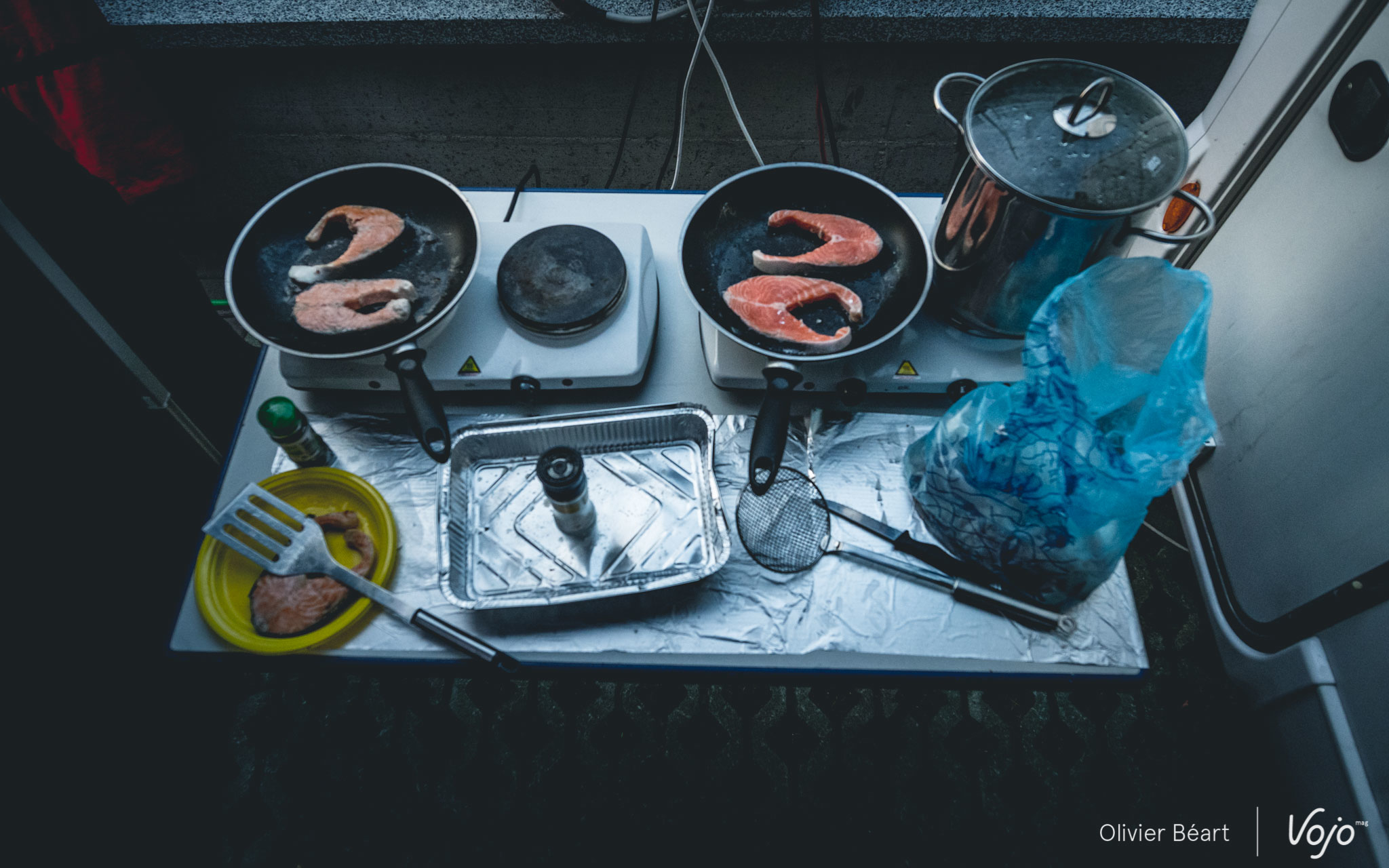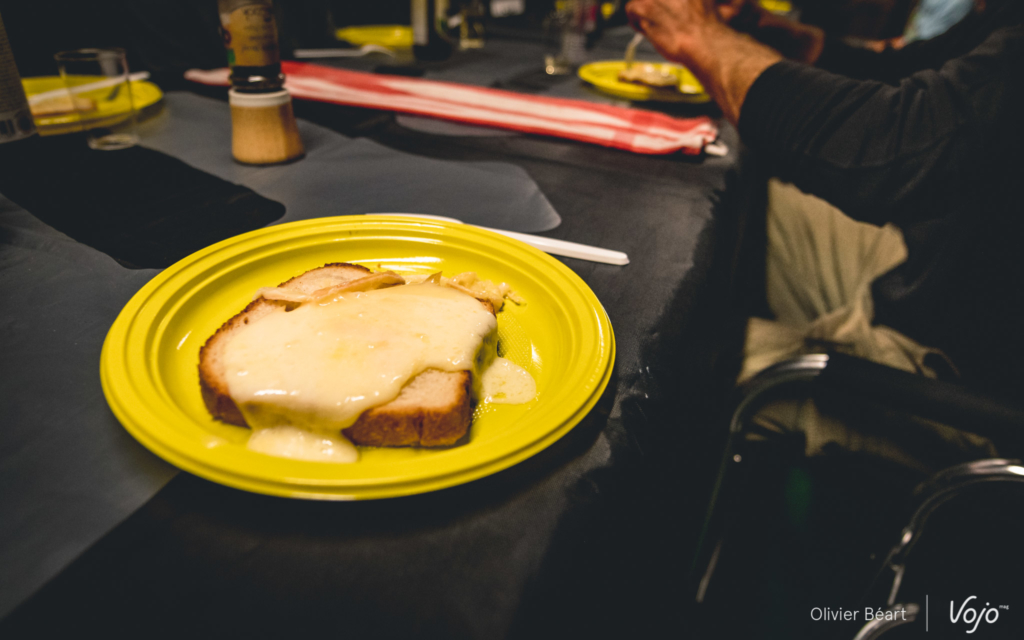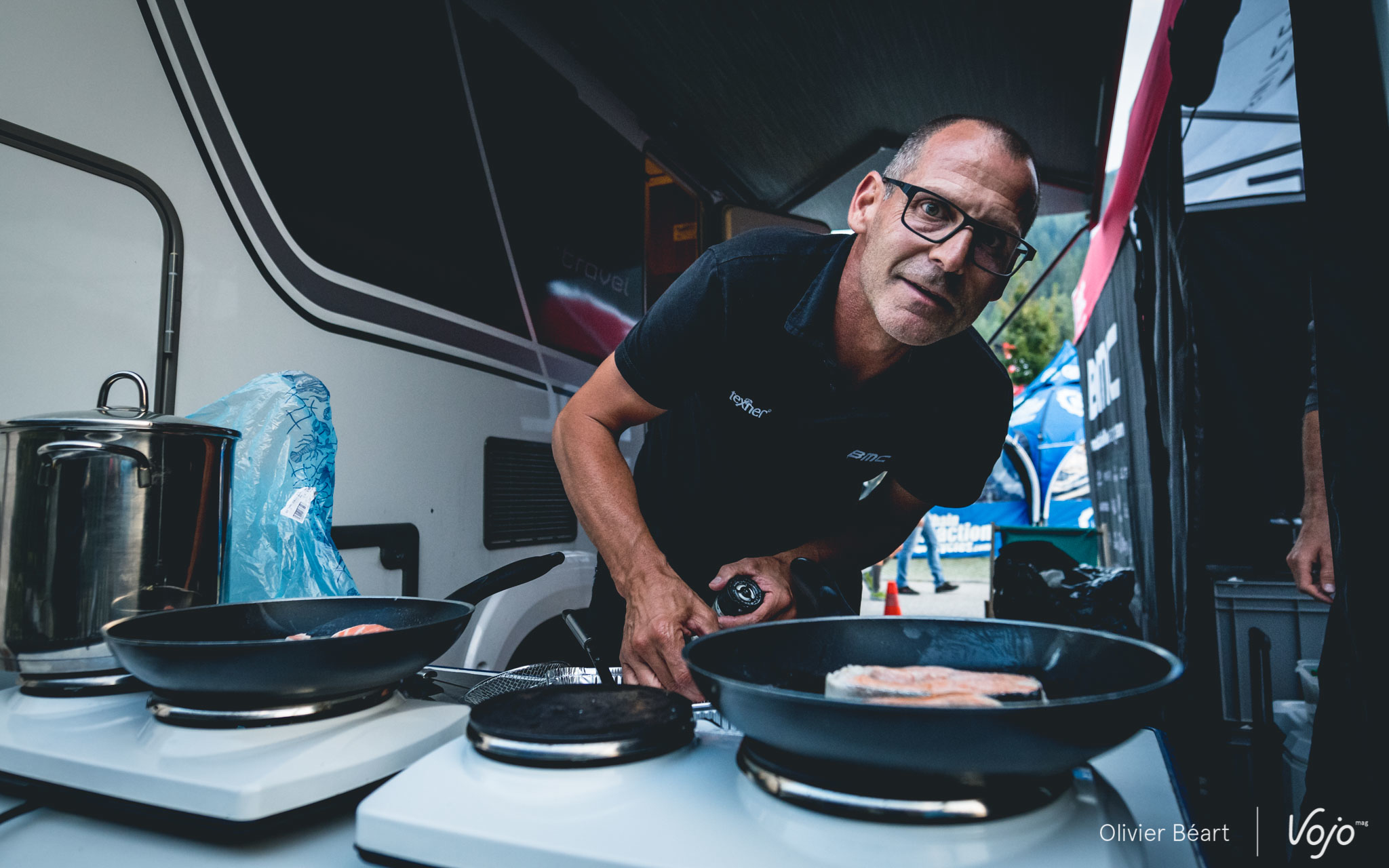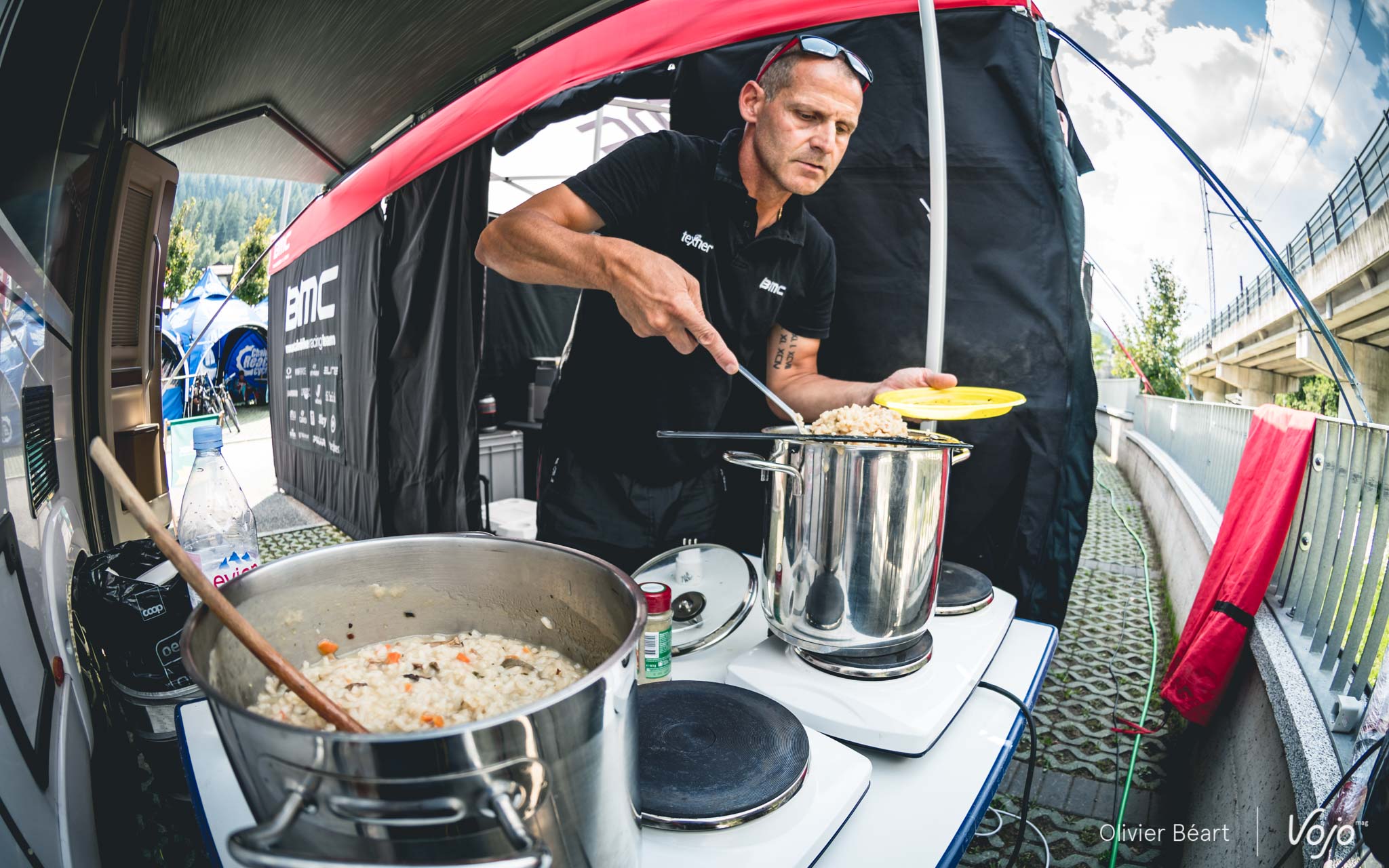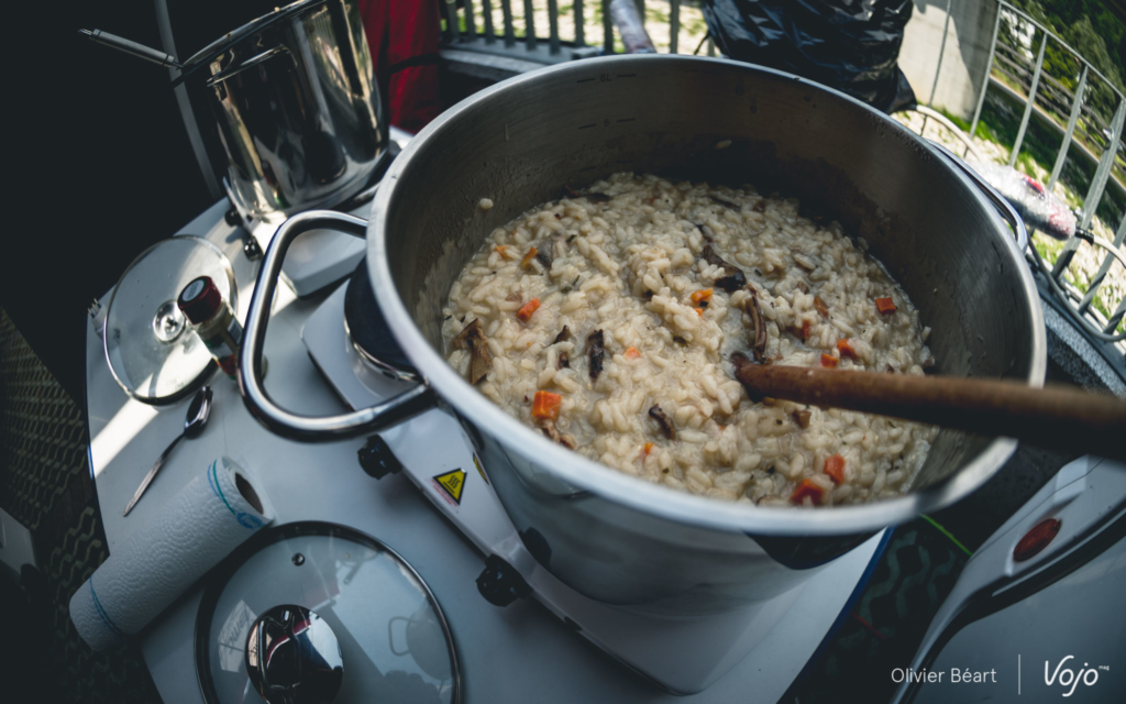 Au menu, on s’en doute, il n’y a que des choses saines. Mais ne croyez pas que ce n’est pas bon ou que cela n’a pas de goût ! « Il faut absolument que ce soit bon ! Les coureurs doivent avoir du plaisir à manger », martèle Philippe en s’occupant amoureusement de son risotto, qui fera office de plat entre une bonne assiette de salade et quelques fruits. D’ailleurs, on a goûté et c’est vrai que c’était très bon ! « On essaie de varier aussi, de faire des choses un peu locales quand c’est possible. »