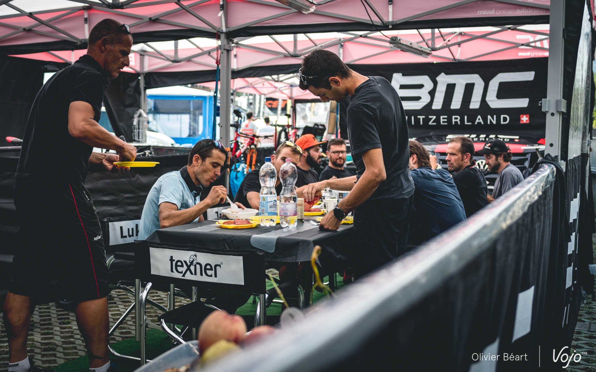 Peu avant 13h, alors que Julien Absalon et Titouan Carod se rafraichissent en vitesse après leur entraînement sur le circuit, Lars Forster et Reto Indergand arrivent. Lukas Flückiger suivra un peu plus tard. Le repas, c’est le moment que toute l’équipe partage ensemble. Mécanos, staff, team manager, coureurs : tout le monde se retrouve autour d’une grande table placée à l’arrière du stand.