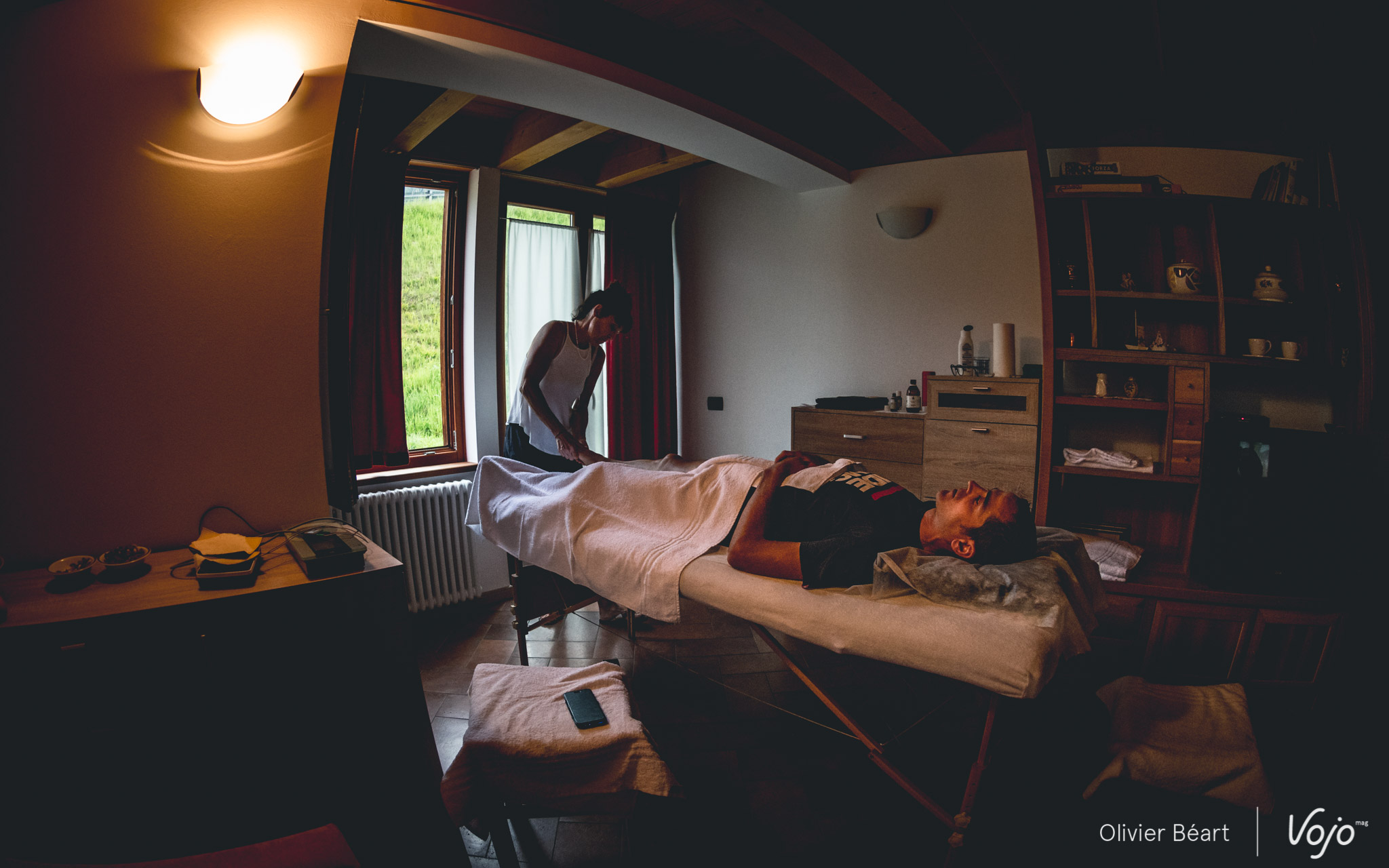 Pendant que leurs vélos sont soignés aux petits oignons, les coureurs ne sont pas non plus négligés et ils ont droit au très important massage dispensé par les mains expertes d’Anne-Valérie Thalmann. Cela se passe à l’hôtel, dans la grande chambre/appartement occupée par le staff. Julien Absalon vient de s’installer au moment de notre arrivée. Il a encore son smartphone entre les mains, mais il va bientôt le lâcher pour se relâcher corps et âme et profiter ainsi pleinement de ce moment privilégié. Clic-clac : les déclenchements de notre appareil photo s’ajoutent à la douce mélodie de la musique relaxante qu’Anne-Valérie a pris le soin de mettre dans la pièce. C’est dans la boîte, nous ne les dérangeons pas plus longtemps !