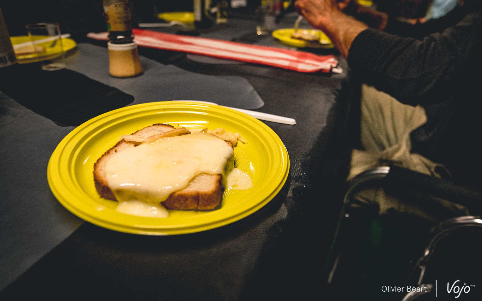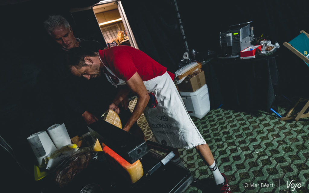 Enfin, la journée du samedi se conclut traditionnellement par… une raclette ou une fondue ! Bien entendu, les pilotes ne sont pas de la partie, ce serait un peu trop copieux et pas vraiment indiqué une veille de course. Mais c’est le petit plaisir du staff, qui en profite aussi pour recevoir quelques invités et proches du team. Ici, c’est même eux qui sont venus directement de Suisse avec la roue de fromage. Et, aux fourneaux, c’est cette fois le boss lui-même qu’on retrouve pour servir les assiettes… ainsi que la petite absinthe artisanale en guise de touche finale !