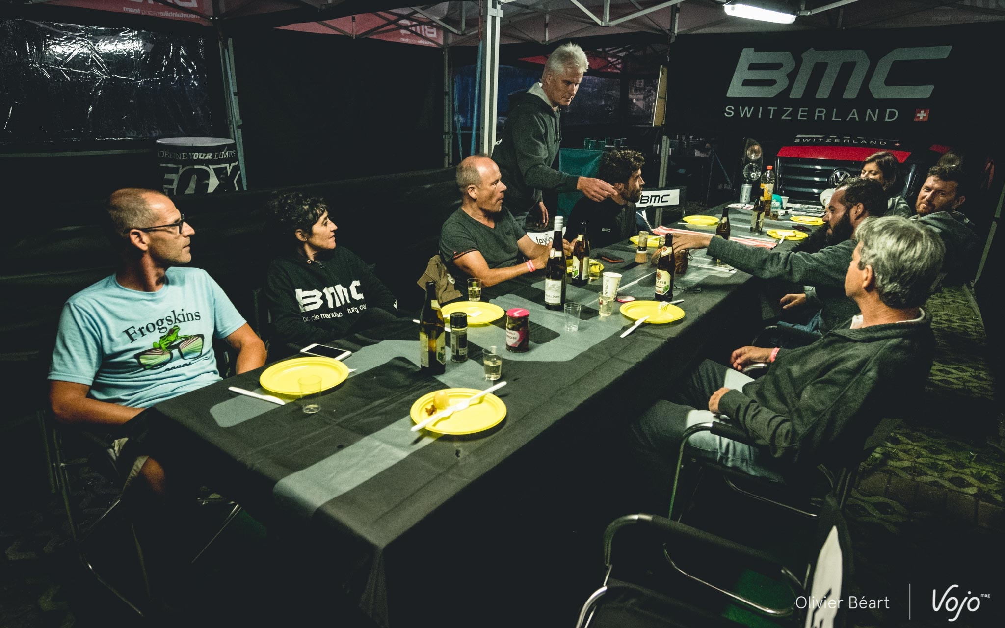 Le soir, c’est le même rituel : toute l’équipe revient de l’hôtel ou de l’appartement loué par le team et se dirige vers la tente pour prendre le repas tous ensemble. Cette fois, il y a du saumon au menu, ainsi qu’une soupe de courgettes et des légumes. Lukas Flückiger en raffole et vient pour une petite repasse. Par contre il y a de moins en moins de féculents le soir. A table, les discussions vont bon train. Ca plaisante et ça parle de plein de choses autres que de vélo… mais à un moment, la conversation glisse vers un sujet très important ce week-end : la victoire au classement des teams, que l’équipe peut glaner pour la 5e année consécutive ! Alex Moos et Mélanie Leveau, la responsable com’ (et bien plus encore), ont fait les comptes. Même si l’équipe n’est pas en tête actuellement (c’est l’équipe Scott de Nino Schurter qui occupe la 1ere place provisoire), tout reste possible si l’ensemble de l’équipe donne le meilleur.