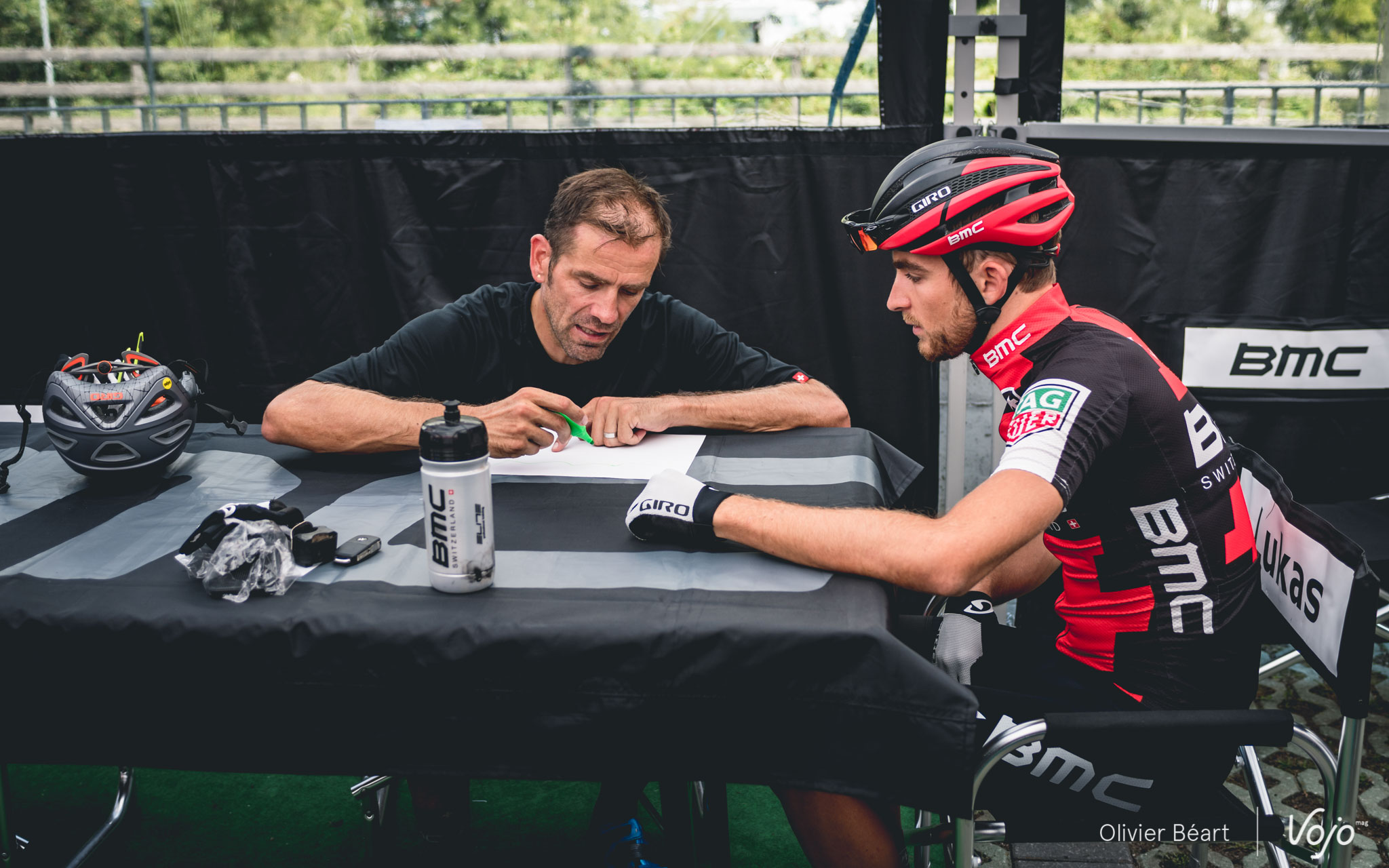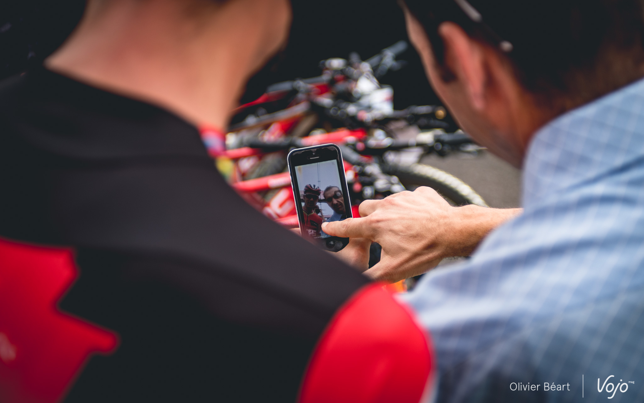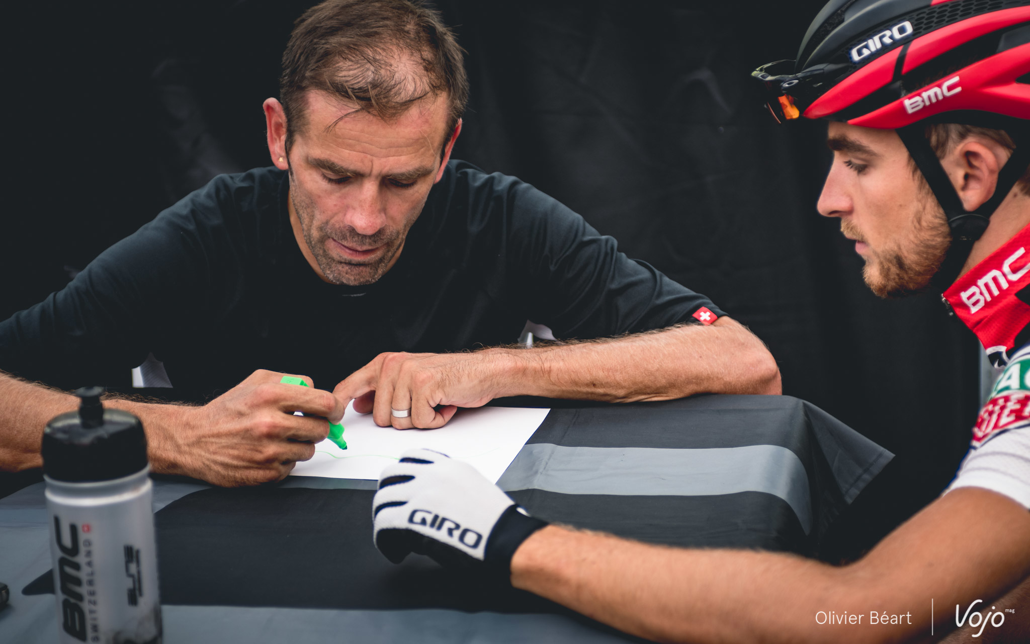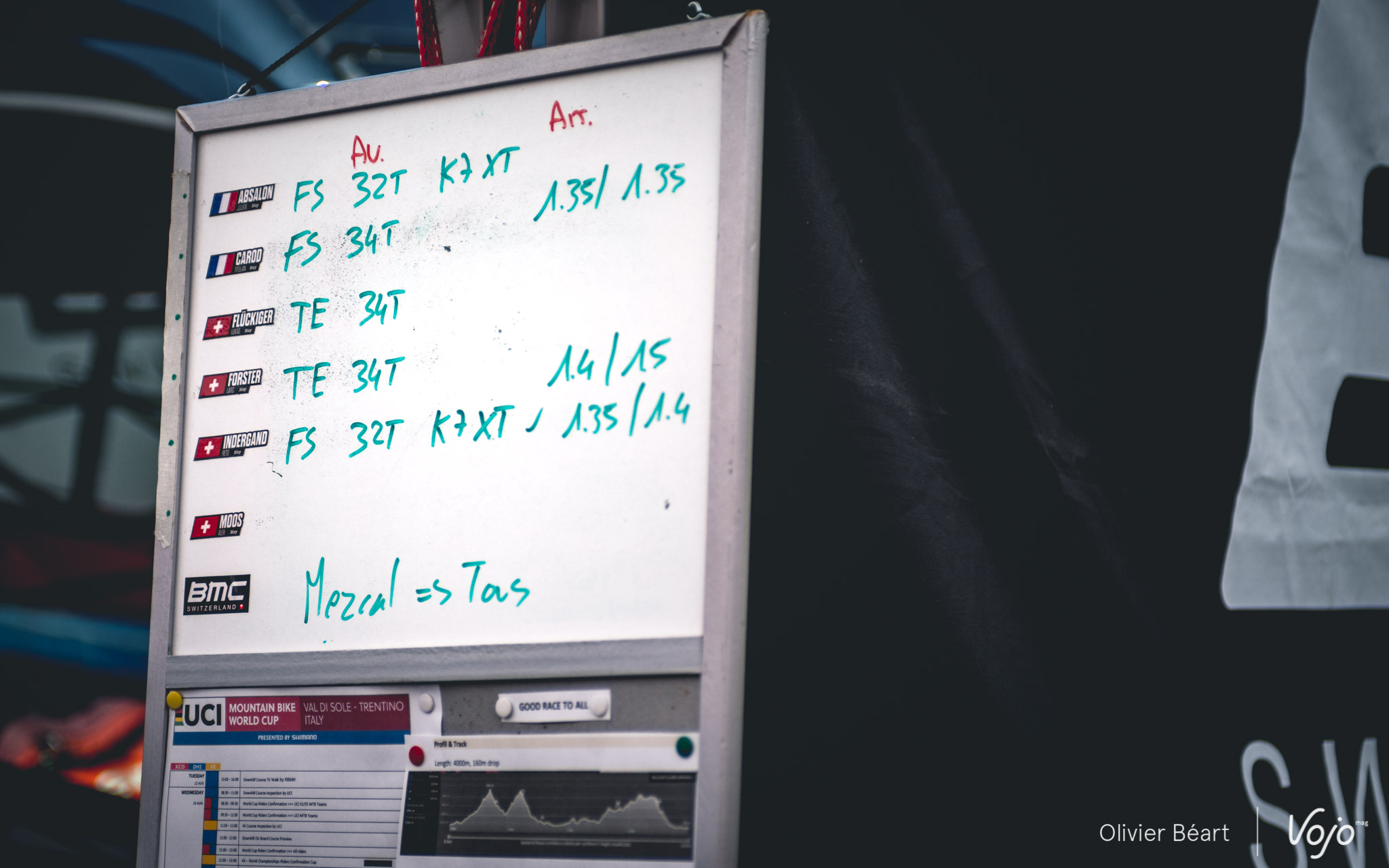 Alors que Julien Absalon termine de se préparer pour aller rouler, Titouan Carod est en pleine discussion avec Alex Moos, le big boss de l’équipe qui est lui-même un ancien coureur de haut niveau. De bon matin, il a fait 3 tours sur le circuit et il échange quelques conseils avec Titouan, le tout avec un accent suisse bien chantant : « Quand tu es après le pierrier, essaie les bosses à droite, ça passe plus vite. Et là, dans le dévers, j’ai vu qu’il y a un appui qui s’est creusé avec les passages, essaie de voir si c’est intéressant de le prendre. »