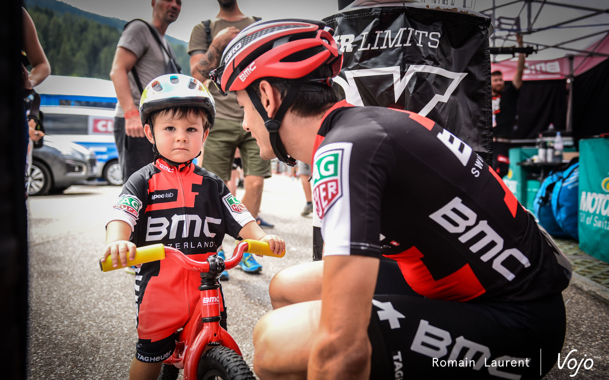 Enfin, avant de partir pour l’échauffement, place à un petit moment de prise d’inspiration et de motivation où les coureurs et le team s’encouragent mutuellement, mais aussi où certains conjoints viennent faire un dernier petit bisou avant la course. Cette fois, c’est Lucie Urruty qui vient à la rencontre de Titouan Carod, alors que Reto Indergand est encouragé par son petit garçon et son épouse.