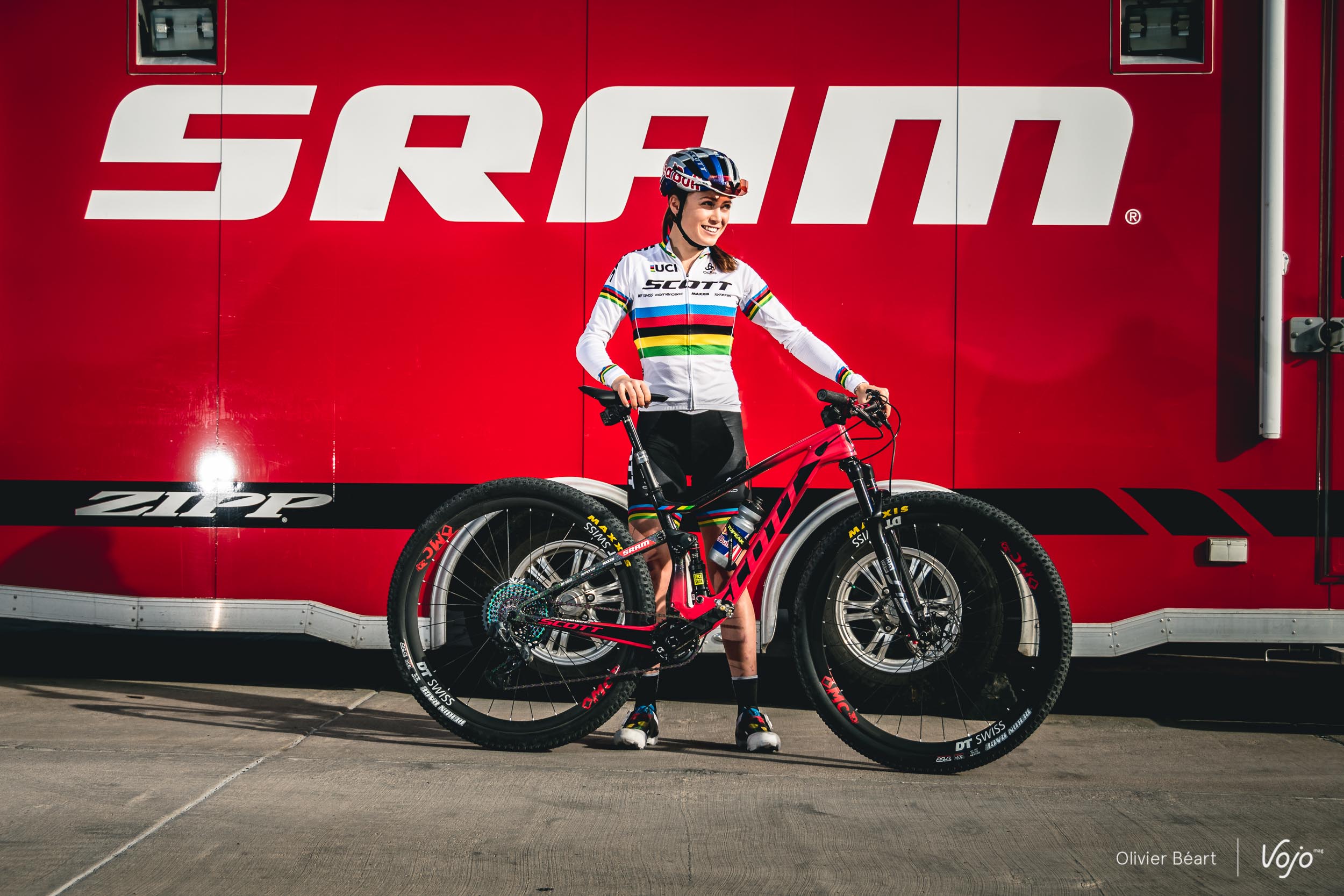 Vojo : Kate, pour commencer, comment ne pas vouloir revenir sur cette incroyable journée du 8 septembre 2018, où tu as décroché le titre de championne du monde pour cette première année dans la catégorie Elite. As-tu réalisé de suite ? Kate Courtney : « Clairement, cela m’a pris du temps de réaliser. J’étais surtout heureuse parce que ma famille avait fait le déplacement et réussir à gagner mon premier titre majeur devant eux, c’était quelque chose de très spécial. D’autant que l’ambiance à Lenzerheide était probablement la plus incroyable jamais vue sur une course de VTT, avec une assistance record. Mais ensuite, la saison était finie et je n’ai pas encore eu l’occasion de porter le maillot en course. Là, j’imagine que cela me fera encore un petit effet supplémentaire, je suis assez impatiente que cela arrive. Par contre, quand je suis sortie pour la première fois en le portant, simplement sur route pour monter le Stelvio, là, j’ai repensé et un peu pris conscience que j’avais bien gagné le titre de championne du monde Elite. » C’est vrai que chez les U23, j’ai progressé petit à petit en faisant 8e du général en 2014 pour ma première année, puis 4e en 2015, 2e en 2016 avant de remporter le général en 2017 pour ma dernière saison dans la catégorie. La transition vers le niveau Elite s’est faite assez naturellement et j’ai vu que j’étais d’emblée compétitive face aux références de la catégorie. Par contre, jusque là, je n’avais jamais eu de réussite sur les championnats du monde (elle n’a jamais conquis le maillot irisé en U23) et je voulais que cela change. J’avais été blessée au genou en juin et j’ai dû faire une petite pause. Mais cela m’a surtout permis de vraiment axer toute ma deuxième partie de saison sur un seul objectif, les championnats du monde, et d’arriver avec un vrai pic de forme à ce moment là. On peut ajouter que le parcours de Lenzerheide me convient bien, et au final, tout s’est parfaitement bien déroulé ! Non, pas vraiment. Par contre c’est en effet quelqu’un dont je connais bien la façon de rouler. Je savais qu’elle était forte, mais je savais aussi surtout que je pouvais la battre. Quand j’ai vu que je revenais sur elle, j’ai pris confiance. Mais j’ai l’habitude de me concentrer surtout sur ma course la tactique globale, mais moins sur mes rivales, quelles qu’elles soient. Oui, c’est vrai que ce sera un de mes objectifs l’an prochain. Cela montrera que ce titre de championne du monde est juste mon premier titre, mais que ce n’est pas juste un hasard ou un coup d’éclat isolé. J’ai veux donc décrocher une, et même plusieurs victoires en coupe du monde aussi, dès l’an prochain. Avoir le maillot irisé sur les épaules change aussi les choses, on est beaucoup plus regardé. L’an dernier j’ai été régulière dans le top 10 et j’ai réussi à passer un gros cran en fin de saison. Là je veux m’installer dans la durée, et montrer mon arc-en-ciel sur les podiums. Comme on le disait tout à l’heure, la régularité a toujours été une de mes caractéristiques dans la catégorie U23, je vais faire en sorte que cela le soit aussi en Elite. Mais le niveau est très élevé, beaucoup plus serré et il y a beaucoup plus de candidates à la victoire en Elite. Ce sera donc dur mais j’ai mis tous les atout de mon côté pour y arriver. Oui. C’est un pas important pour moi. J’ai grandi avec Specialized et je les en remercie. Mais là, avoir l’opportunité d’apprendre aux côtés des meilleurs, avec Nino comme équipier et Frischi comme team manager, c’est juste exceptionnel. L’équipement joue aussi un rôle et ici c’est non seulement le team d’une marque de vélo, mais aussi celui de Sram, qui compte beaucoup sur les coureurs pour tester de nouvelles solutions et développer le matériel. C’est important pour moi et l’assurance d’avoir toujours ce qui se fait de plus pointu. Pour revenir au côté sportif, c’est un vrai team de champions du monde et je sais qu’en les rejoignant, je mets toutes les chances de mon côté pour réussir à atteindre mes objectifs futurs, en coupe du monde, mais aussi aux jeux olympiques. La décision de changer d’équipe remonte à bien avant les championnats du monde ? J’y pensais, en effet, et les conversations ont commencé avant. Firschi vient toujours voir la course des filles, et il n’a pas arrêté même quand Jenny Rissveds n’était plus là. Nous avons parlé plusieurs fois ensemble, et même quand il n’était pas question que je le rejoigne chez Scott-Sram, il m’avait déjà donné quelques conseils. J’ai perçu que c’est un authentique leader, un vrai mentor avec une expérience unique qui peut vraiment m’aider. Il a aussi un vrai souci de transmission que j’apprécie. Oui, Brad Copeland est plus qu’un mécano pour moi, c’est un ami proche. En changeant de vélo, je voulais garder une certaine continuité en le gardant à mes côtés. Il échange beaucoup avec Yannick, le mécano de Nino, et cela m’aide à trouver plus vite mes réglages sur le nouveau vélo. Dans l’ensemble, le staff de l’équipe est très fort pour cela car niveau postural et suspensions, j’ai trouvé très vite mes repères sur mon nouveau Scott Spark RC, pourtant fort différent de mon vélo précédent. Cela m’évite de perdre du temps et cela va me permettre, je l’espère, d’être compétitive directement en 2019.