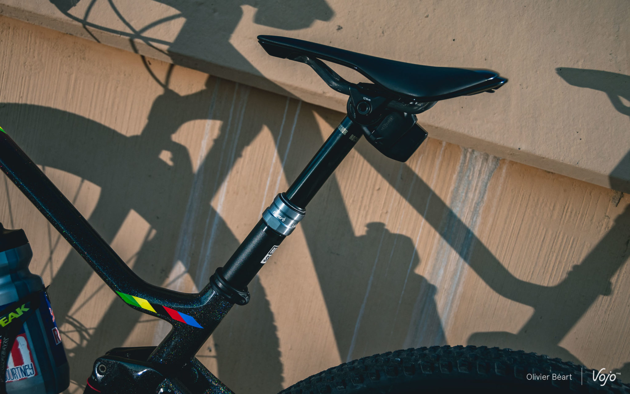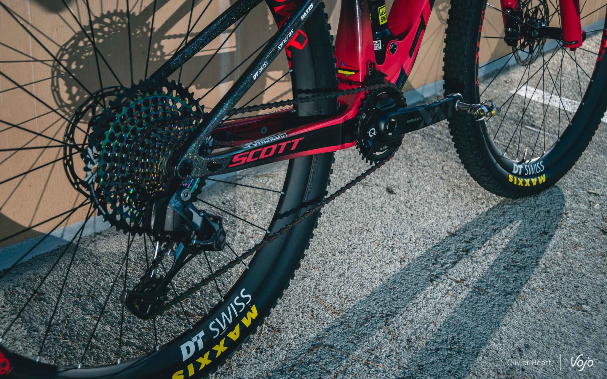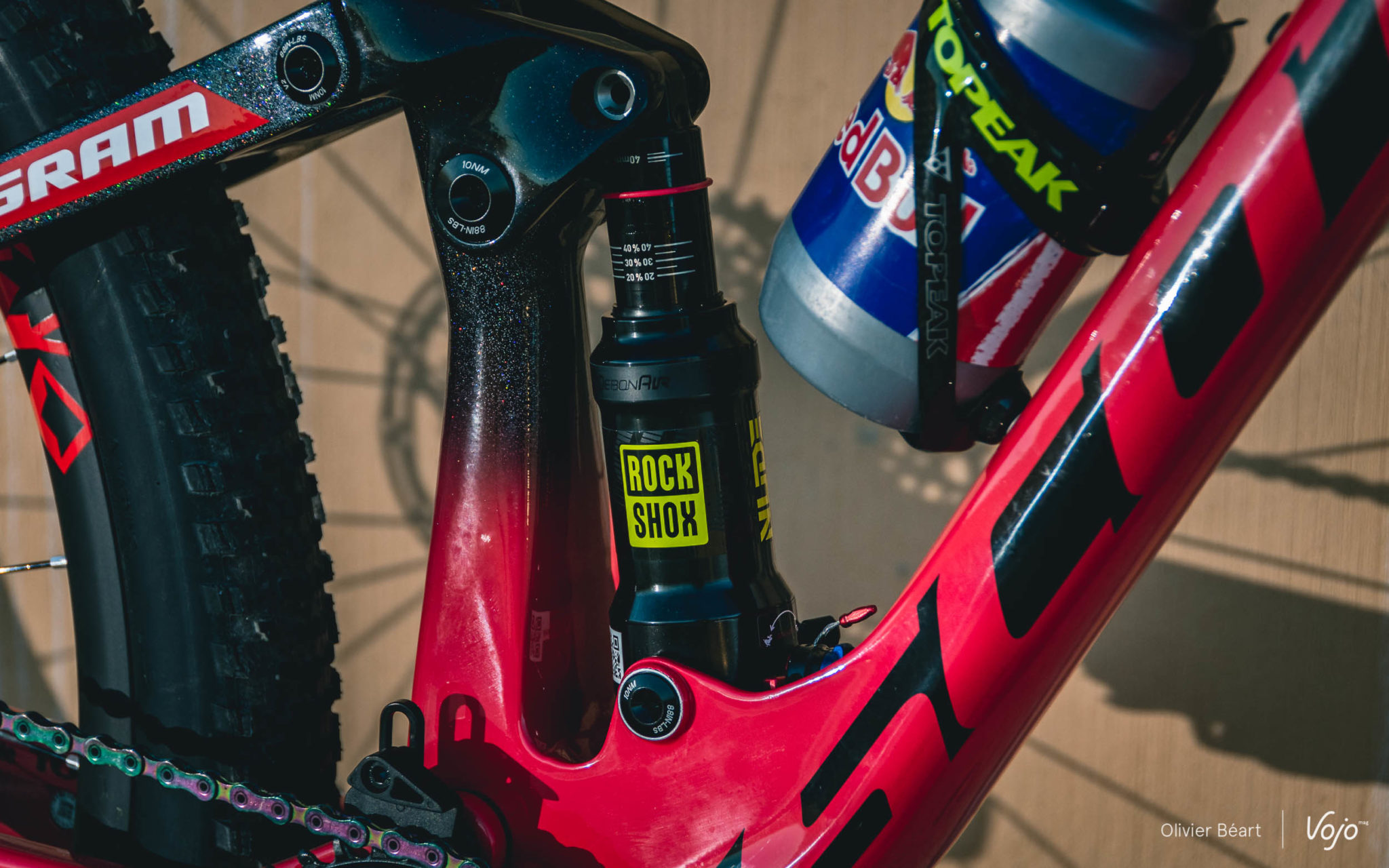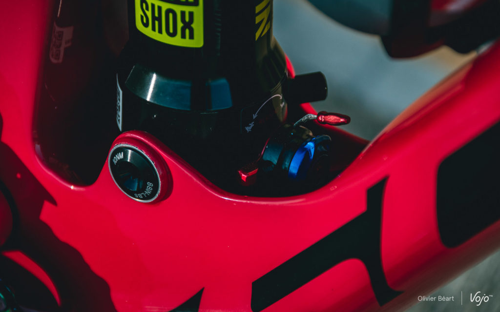 A l’arrière, jusqu’à la saison dernière et malgré quelques tests effectués par Nino Schurter, le team Scott-Sram roulait encore discrètement avec l’amortisseur Fox Nude 3 positions développé spécialement pour le Spark et présent sur les vélos de série. Mais maintenant, RockShox dispose également d’une version dédiée au Spark avec ses 3 positions. La panoplie est donc complète !