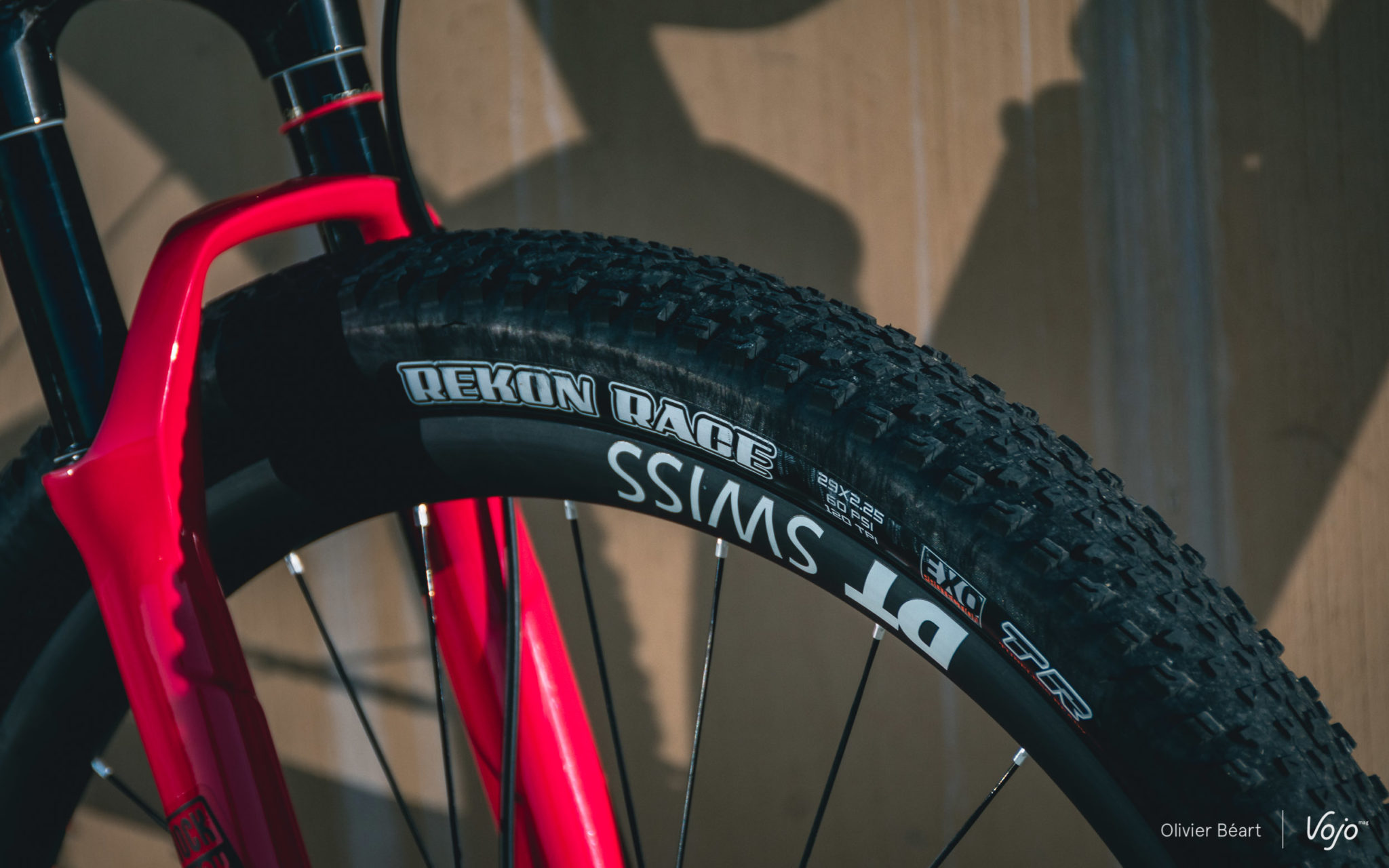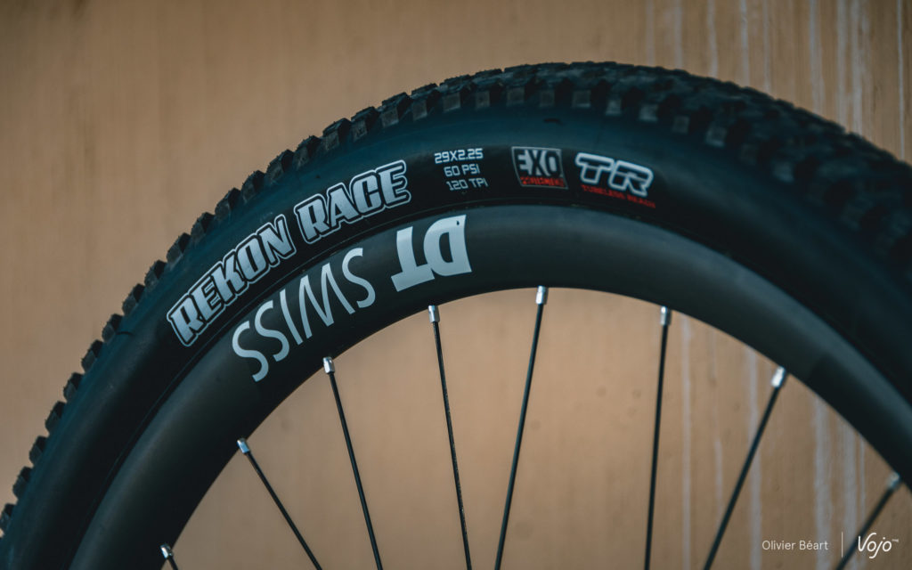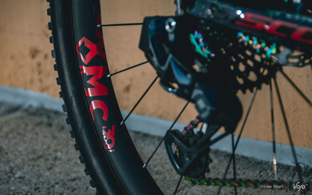 Le team Scott-Sram est sponsorisé par DT Swiss. Kate Courtney teste actuellement plusieurs options, et c’est ici les DT Swiss XMC 1200 avec leurs jantes très larges de 30mm qu’elle teste. Le team dispose aussi de jantes en 25mm de large, que Nino Schurter utilise sur son Spark, réservant habituellement les 30mm à son Scale semi-rigide. La championne du monde se familiarise aussi avec les pneus Maxxis et elle testait les Rekon Race lors de notre rencontre en Arizona. Elle semble les apprécier beaucoup et il y a de grandes chance que ce soit sa monte de base pour la saison 2019, quand Nino préfère les Aspen.