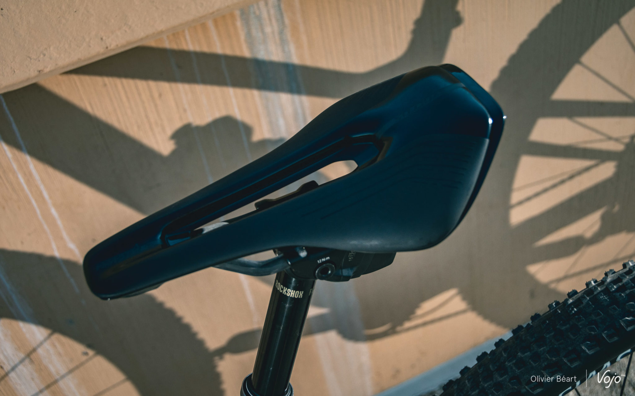 Au-dessus de la tige de selle RockShox Reverb AXS (en 100mm de débattement), on trouve une selle Syncros Belcarra, qui est un modèle repris dans la gamme triathlon de Syncros et dont le dessin court et large, avec une ouverture centrale, n’est pas sans rappeler la Specialized Power que Kate Courtney a utilisée par le passé.
