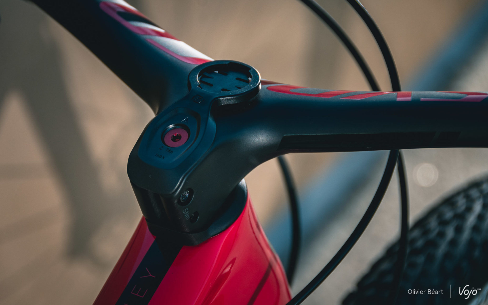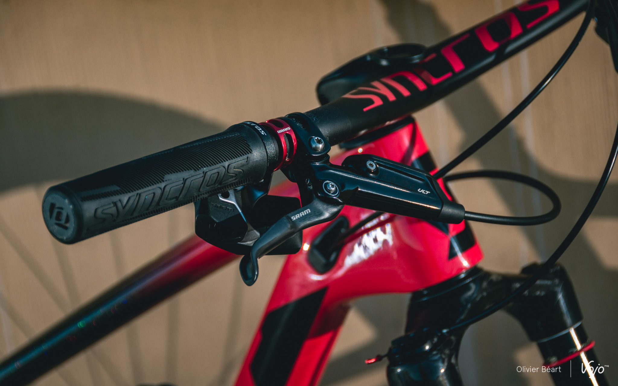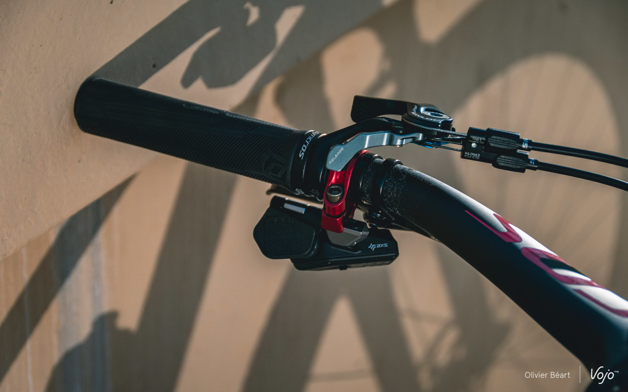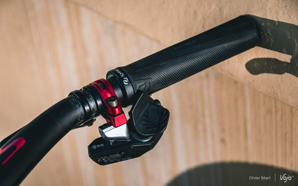 Le Twinlock Scott, qui permet de régler les deux suspensions sur trois modes (ouvert, intermédiaire et fermé) est donc un modèle haut, pas très gracieux, mais l’ergonomie de l’ensemble fonctionne bien malgré tout. Le collier de serrage du Tinlock est commun avec les grips Syncros, qui devraient être remplacés pour les courses par des modèles en silicone.