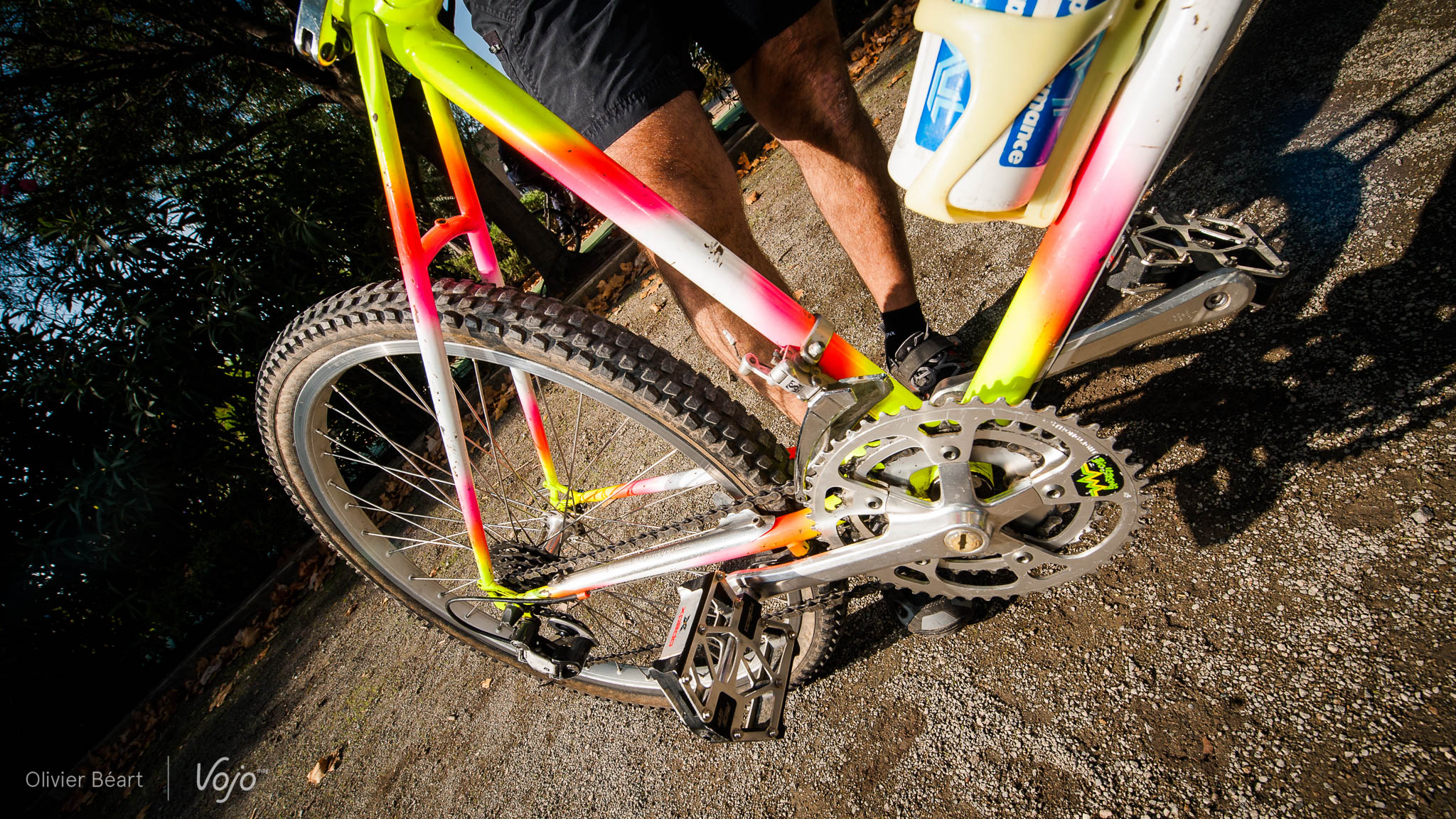 RC: C’est un vélo que j’ai construit moi-même, sous ma marque, Mécacycle. Je l’ai baptisé « Vercors ». C’est un des premiers VTT européens et sans doute le premier VTT français. Je l’ai soudé avec des tubes en acier haut-de-gamme en 0,3mm d’épaisseur. Le cadre fait à peine plus de 2kg, et il tient toujours ! A l’époque, le plus dur était de trouver des composants. Les dérailleurs sont des Sachs, avec 7 vitesses à l’arrière, et le pédalier est un Stronglight avec plateaux Biopace ovales. Cela m’amuse d’ailleurs de voir que ce genre de plateaux revient sur certains vélos aujourd’hui. Quant aux jantes, ce sont des Rigida, montées sur moyeux Mavic.