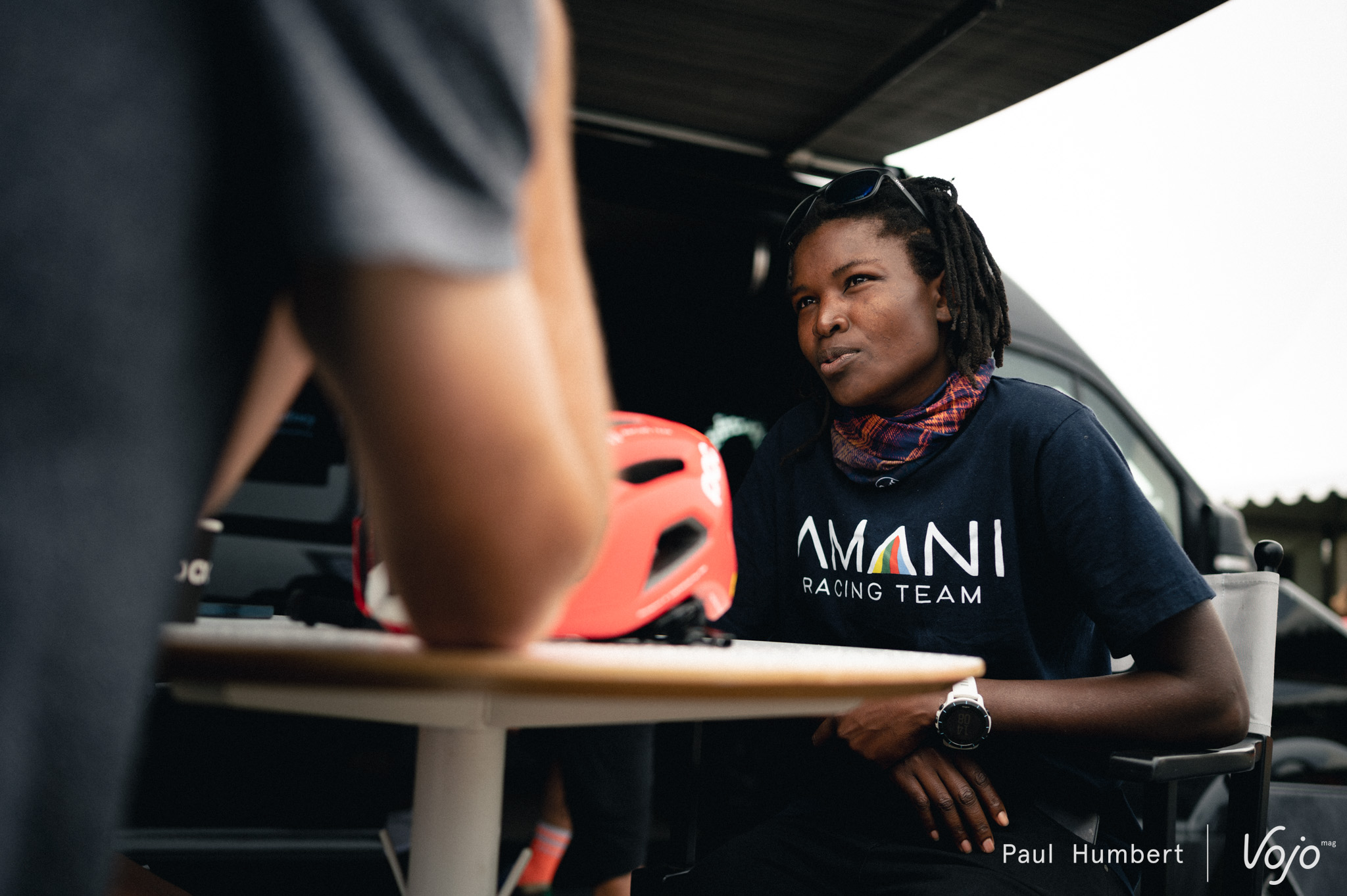 Vojo : Bonjour Nancy ! Tu nous disais à l’instant que c’est la première fois que tu viens sur le Roc d’Azur, tu roules tout le week-end ? Nancy : Non, je devais faire la course à étapes [le Roc Trophy] mais j’ai seulement fait le marathon hier et aujourd’hui j’ai fait le Roc Light pour récupérer, pour le plaisir et pour m’entraîner… Vojo : Tu cours pour récupérer ? Nancy : (rires) Oui, hier j’étais à fond sur le marathon. Aujourd’hui, je gardais les jambes tranquilles. Vojo : C’est la première fois que tu viens en France ? Nancy : Non, non. J’étais en France une fois pour La Bresse, la coupe du monde en 2018. Il avait plu et c’était super boueux, mais l’ambiance était juste… Je n’ai jamais vu ça, même en Suisse à Lenzerheide aux championnats du monde, pour moi à La Bresse l’ambiance était meilleure. Vojo : Comment as-tu commencé à faire du vélo ? Nancy : Pour moi, avant, je ne savais même pas que le vélo était un sport, au Kenya ce n’est pas comme ici. Je suis montée sur le vélo de mon père, il est super grand, je suis partie avec mes frères et ils m’ont appris à rouler. Après une journée je savais faire du vélo… sauf que je ne savais pas comment utiliser les freins ! Mais je jouais juste avec le vélo de mon père. Dans ma famille, on ne nous achetait pas de vélos, c’était seulement pour les riches. Alors je prenais le vélo de mon père, tellement grand que je devais m’asseoir sur le tube supérieur pour atteindre les pédales. Mais c’était bien, c’est fun. Je ne faisais du vélo que pour le plaisir, je ne connaissais pas le cyclisme en tant que sport et j’aimais vraiment ça pour le plaisir. « Je ne faisais du vélo que pour le plaisir, je ne connaissais pas le cyclisme en tant que sport. » Plus tard, lorsque j’ai commencé l’université, je voulais arrêter le football ou le hockey parce que je voulais un sport où je pouvais m’entraîner seule. Je cherche, je vois du badminton, du tennis, mais il faut quelqu’un pour ça et je voulais quelque chose de plus indépendant. Je finis par penser « et le vélo ? » et je commence à chercher en ligne s’il y a du vélo au Kenya. Et je vois un groupe à Nairobi. J’étais super contente, je les contacte et je commence. Mais au début, c’était très dur pour moi, j’étais faible sur le vélo, très faible. A ce moment, j’étais très en forme pour travailler mais quand je faisais du vélo j’avais l’impression d’être une vieille femme. C’est une forme physique différente, j’ai failli arrêter. J’ai fait six mois comme ça, tout le monde disait que j’étais trop faible pour faire du vélo, que je n’étais pas assez forte… Mais j’ai continué à travailler et c’est comme ça que je me suis mise au vélo. Nancy : C’est drôle parce qu’au tout début, j’étais sur un VTT et à cette époque, au Kenya, la plupart des gens faisaient du VTT. Mais pas du vrai VTT, juste sur des routes de terre et dans les champs. Presque tout le monde était sur un VTT, très peu de gens étaient sur des vélos de route parce que la plupart des gens n’ont qu’un seul vélo, alors ils font du VTT. C’est plus du gravel en fait. Et puis, après un certain temps, je ne sais pas ce qui s’est passé, le sport a changé, ils ont commencé à organiser beaucoup de courses sur route. Alors presque tout le monde s’est débarrassé de son VTT, a arrêté de courir ou d’organiser des marathons et a acheté un vélo de route. La tendance a changé très vite et la route a pris le dessus en deux ans. Mais j’ai toujours un VTT, j’ai de la chance, et un vélo de route. Donc le soir, si je n’ai pas vraiment le temps de m’entraîner, je vais faire un tour sur mon VTT. J’aime beaucoup ça, mais je fais encore beaucoup de route parce que… Les gens préfèrent ça, ce n’est pas trop technique. La plupart des gens, quand ils commencent, ils sortent juste pour rouler et aller vite, mais la technique n’est pas encore là. Le VTT c’est dur, c’est différent. Il n’y a pas non plus de pistes ou sentiers adaptés. Si tu dois t’entraîner à sauter comme en XCO par exemple, il n’y a rien au Kenya. Si tu veux rouler sur des choses comme ça, tu dois les construire avant. Tu vois, aujourd’hui, il n’y a toujours pas de pumptrack au Kenya. Enfin, il y en a une, mais elle est privée. Maintenant ça commence à bouger, l’équipe va en construire une. Ce n’est pas comme ici [en France], tu n’as pas de piste de BMX sur laquelle tu peux t’entraîner ou autre. C’est encore très jeune, c’est différent. Vojo : J’allais te poser une question sur la scène cycliste au Kenya mais tu viens plus ou moins d’y répondre. Nancy : Tu sais, avant, quand je grandissais, je ne voyais aucun cycliste. Du genre avec un casque, la tenue lycra… Rien, zéro. C’était comme une communauté de niche, peu de gens savaient que ça existait. Maintenant à Nairobi, oui, ça grandit, on voit des gens à vélo mais ça reste plutôt à Nairobi. Ce n’est pas comme ça partout. Là d’où je viens, tout le monde sait que je fais du vélo parce qu’il n’y a personne d’autre qui passe. Là où je suis née, je suis celle qui fait du vélo. C’est toujours un sport jeune et beaucoup de gens n’ont jamais vu un vrai cycliste. Vojo : D’où viens-tu au Kenya ? Nancy : Je viens de Homa Bay, au bord du lac [le lac Victoria, deuxième plus grand lac du monde]. Vojo : Donc tu commences le vélo en tant que sport à l’université. A partir de là, comment es-tu entrée en contact avec le projet et l’équipe Amani ? Nancy : Il y a beaucoup de femmes qui font du vélo et il y a eu beaucoup de bonnes coureuses mais pour une raison ou une autre, elles doivent toujours arrêter. Vous savez, dans le sport, il faut persévérer et ce n’est pas toujours facile. Parfois c’est pour de bonnes ou de mauvaises raisons… Mais beaucoup de femm