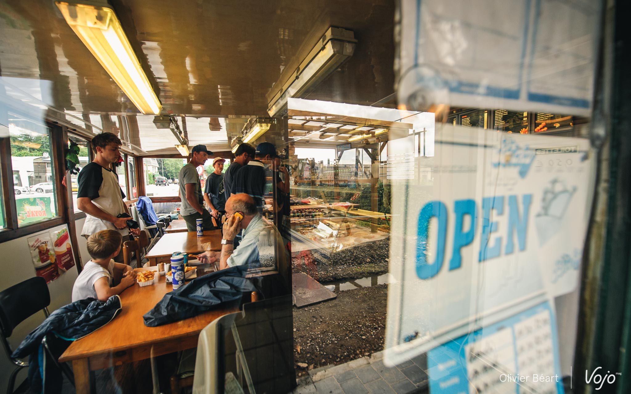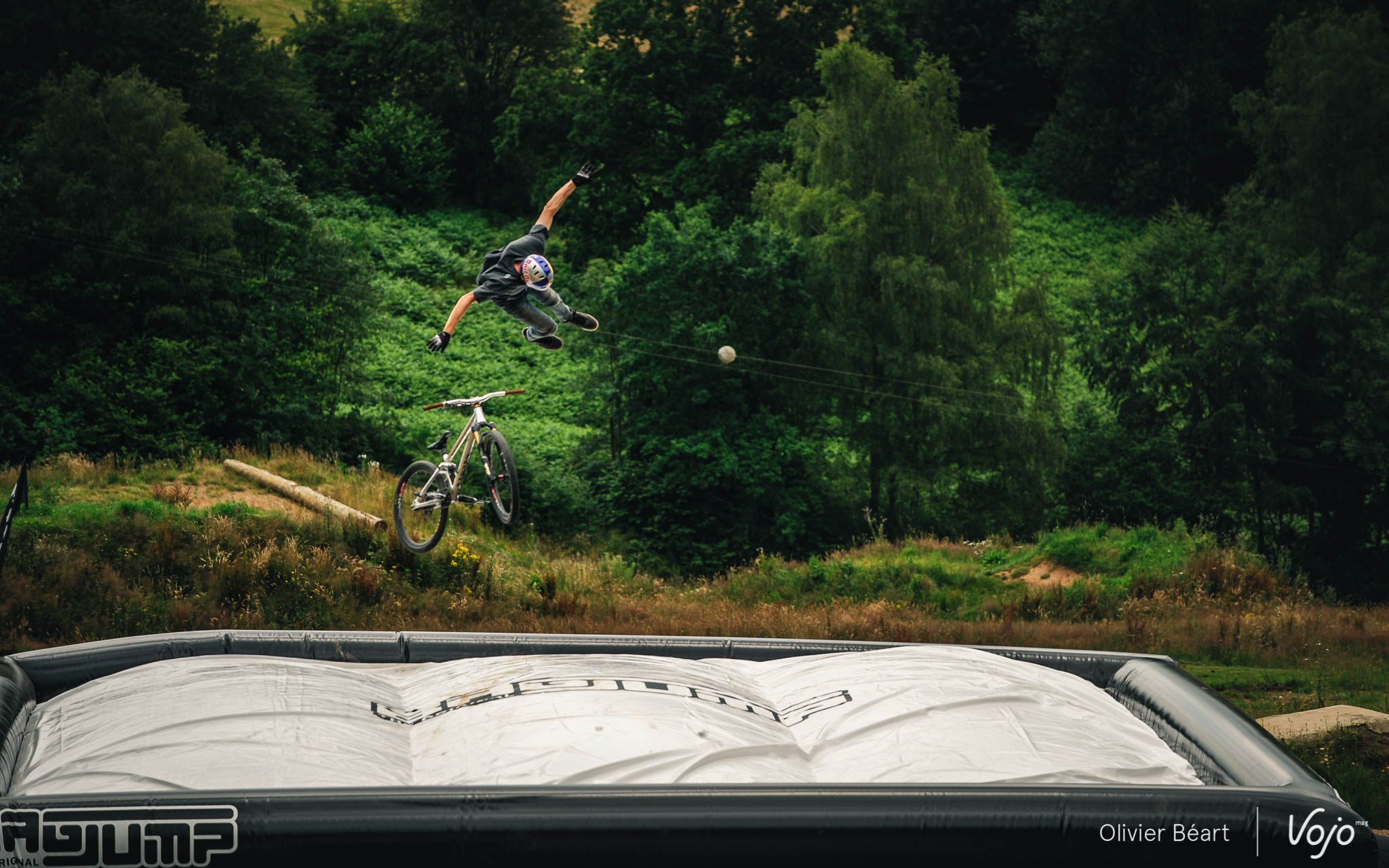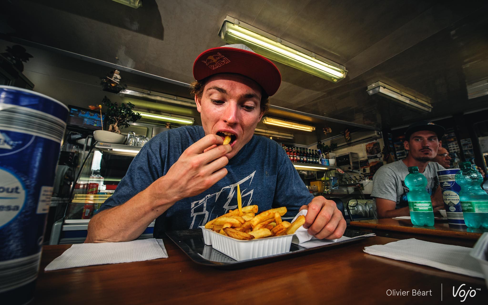 Non, pas du tout. Là, tu me vois manger une frite et c’est clair que je me permets des écarts de temps en temps. Mais quelle que soit la discipline, si tu veux être bon et si tu veux en vivre, il faut être dans les 10 meilleurs. Et pour y être, je n’irai pas jusqu’à dire qu’il faut faire des sacrifices, mais il faut une vraie une discipline de vie. Oui, on sort à l’occasion, mais on est focalisés sur la discipline. On est des sportifs comme des autres, certains aspects sont peut-être moins importants qu’en XC (alimentation, endurance, périodes de récupération,…) mais même si on est plus libres sur certains points, on fait d’autres choses. Je passe 4 à 5 heures chaque jour à répéter tous mes mouvements, toutes mes figures et cela sur différentes bosses. Je fais toute ma gamme de tricks 2 à 3 fois par jour. Les descendeurs font plus de gym et de vélo de route. Ici, c’est vraiment la technique pure qui compte. Alors, comme des musiciens, on fait nos gammes. Pour tenir le rythme, il n’y a pas de secret, il faut rester sain et en bonne santé.