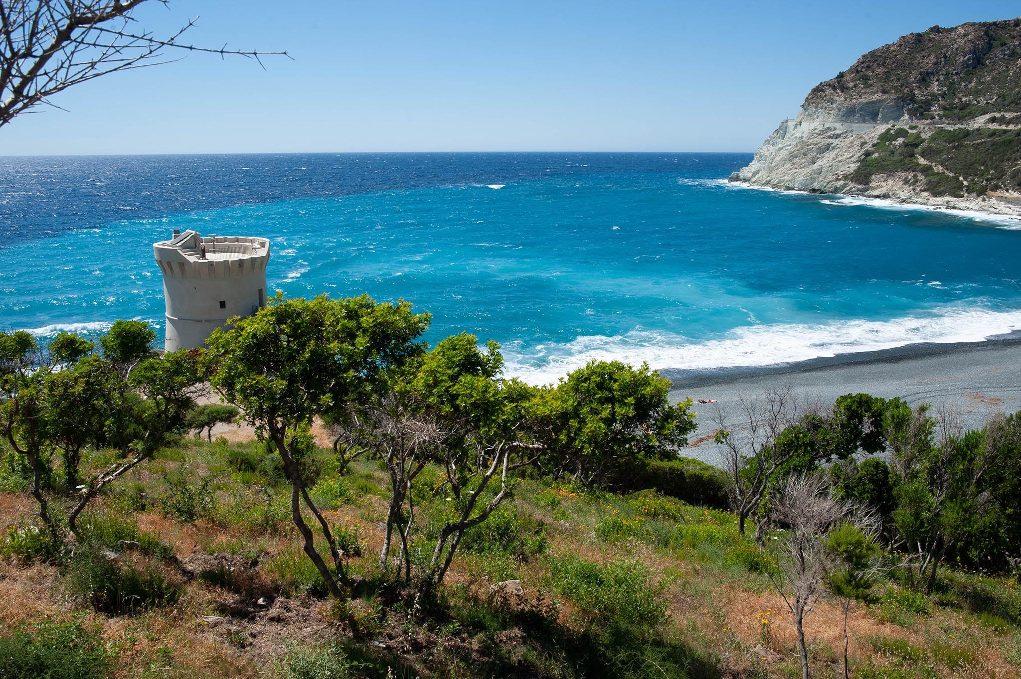 Je ne roule pas, je contemple les villages traversés et les panoramas à chaque virage. Peu importe la moyenne…. Depuis le col, une tour veille : une situation qui n’est pas le fruit du hasard. Face aux pirates des XVe et XVIe siècles, ces tours de guet génoises ceinturant le littoral corse surveillaient l’horizon de l’arrivée de toute voile barbaresque.