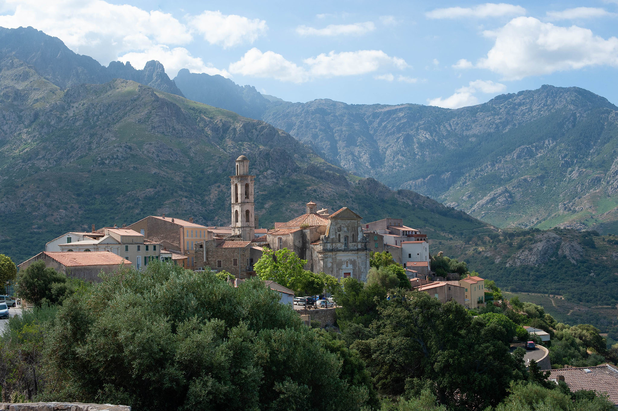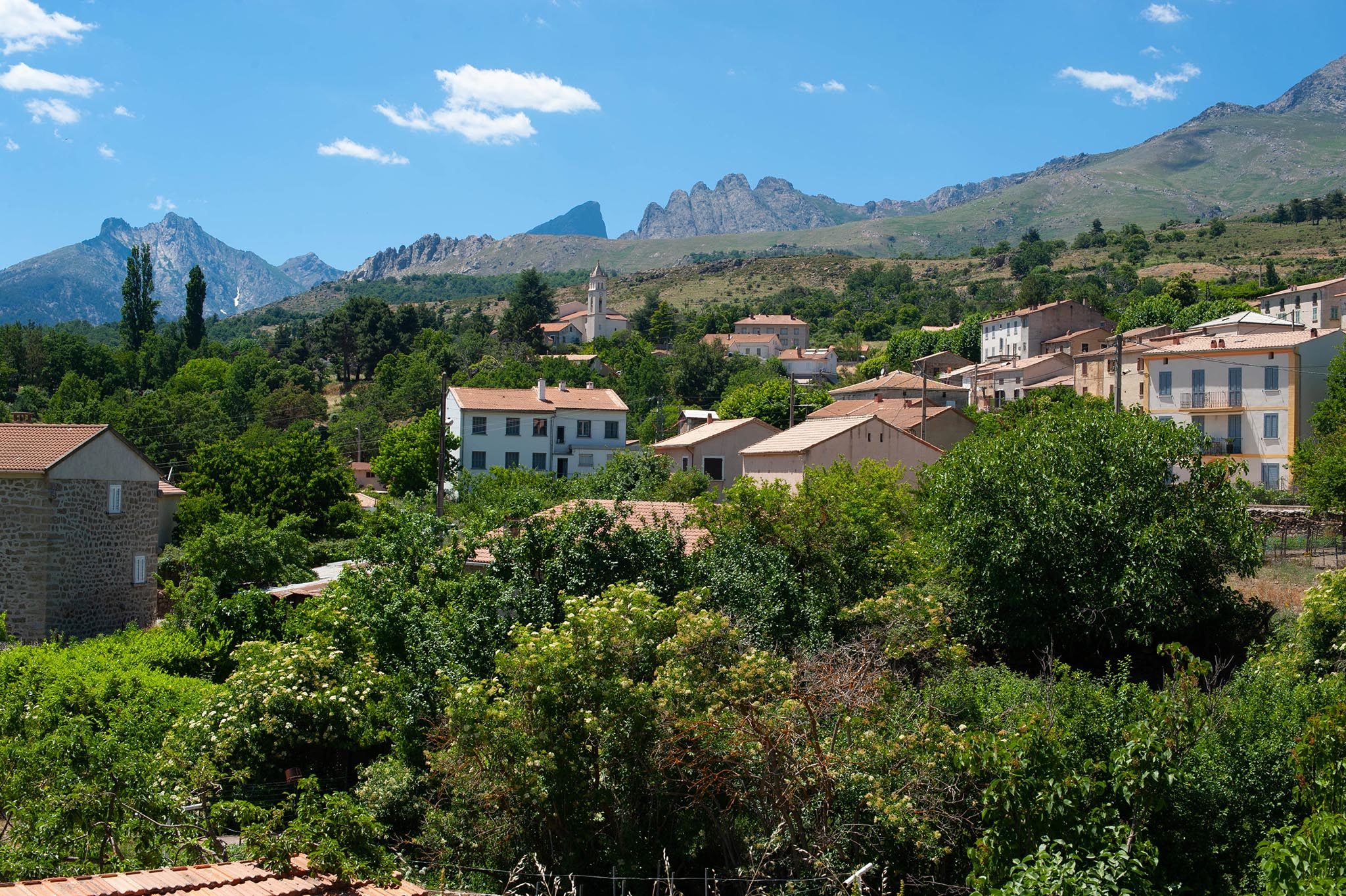 Entre Venaco et Ghisoni, l’île est un véritable mini-continent en soi. D’un paysage verdoyant, je progresse maintenant dans un territoire plus aride. En ce début de mois de juin, la chaleur est déjà accablante. Elle se ressent particulièrement dans le défilé perdu de l’Inzecca menant à Ghisoni. Le village est au pied d’un fameux col, celui de Verde. L’ascension est longue et chaque village est l’occasion de remplir les gourdes.