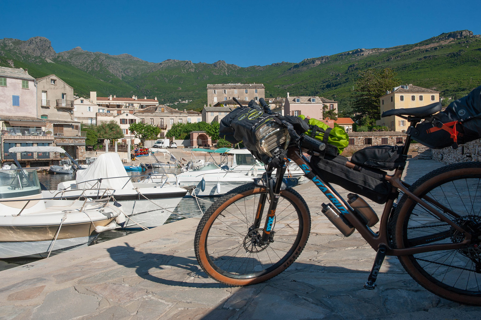 Des cales du navire, je sors en premier avec mon Santa Cruz : priorité aux usagers lents ! Sur le Pascale Paoli, j’ai pu rencontrer et sympathiser avec un autre bikepacker, César, qui prendra une autre route : dommage, l’aventure aurait pu s’effectuer à deux…