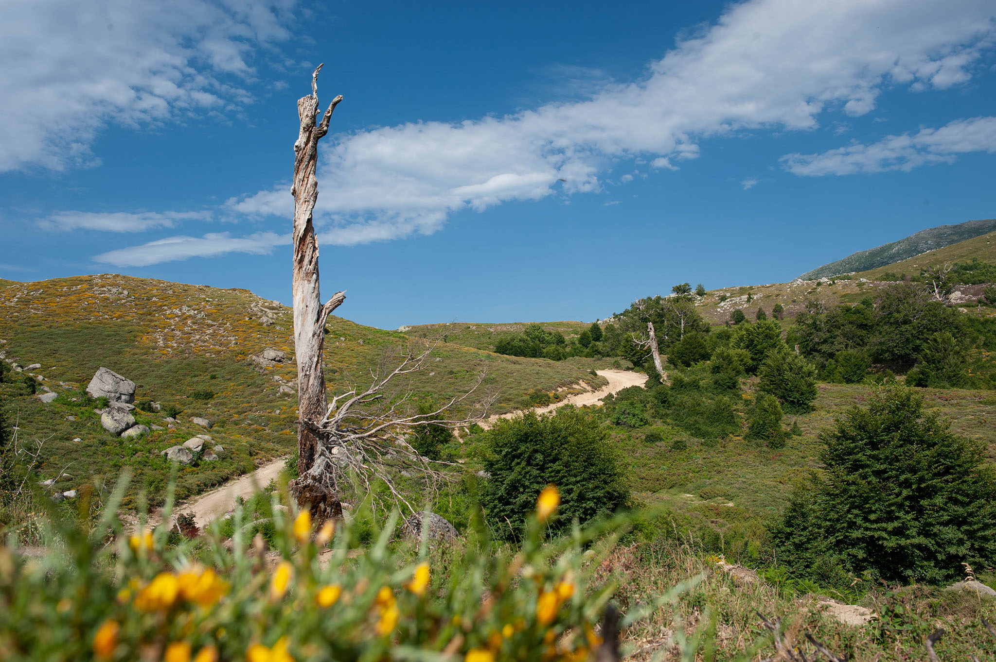 A Zicavo, je quitterai cette fois l’itinéraire de la GT20 pour m’élever plus haut, vers le plateau du Coscione. L’endroit est magique, idyllique. Et je perds tout repère. Le paysage est vaste, se confond entre le ciel, la terre et la mer.