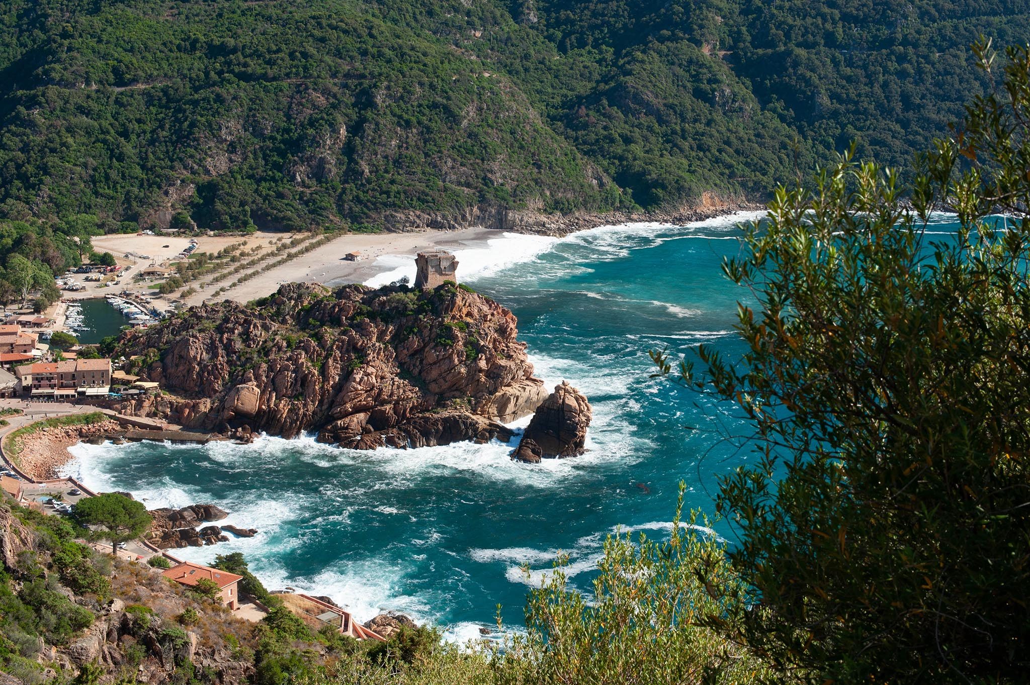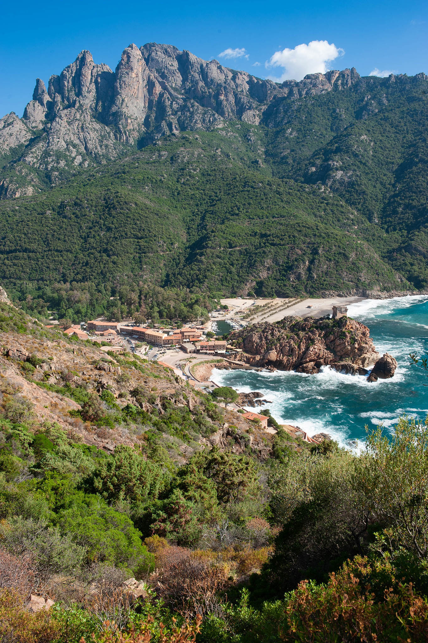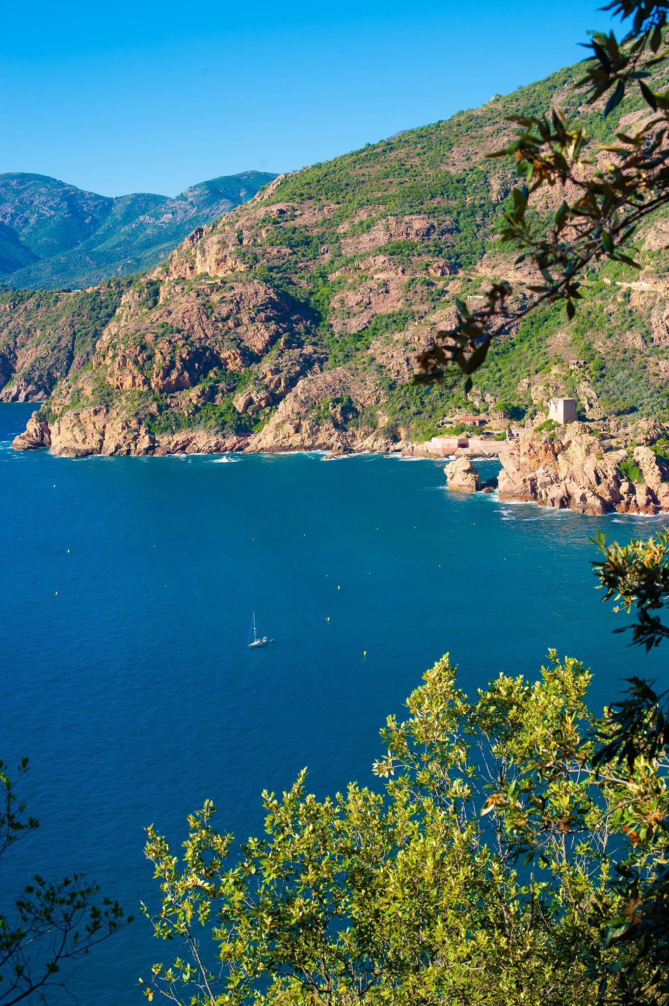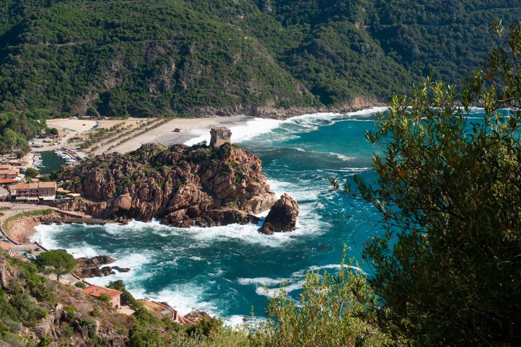 Je ne roule pas, je contemple les villages traversés et les panoramas à chaque virage. Peu importe la moyenne…. Depuis le col, une tour veille : une situation qui n’est pas le fruit du hasard. Face aux pirates des XVe et XVIe siècles, ces tours de guet génoises ceinturant le littoral corse surveillaient l’horizon de l’arrivée de toute voile barbaresque.