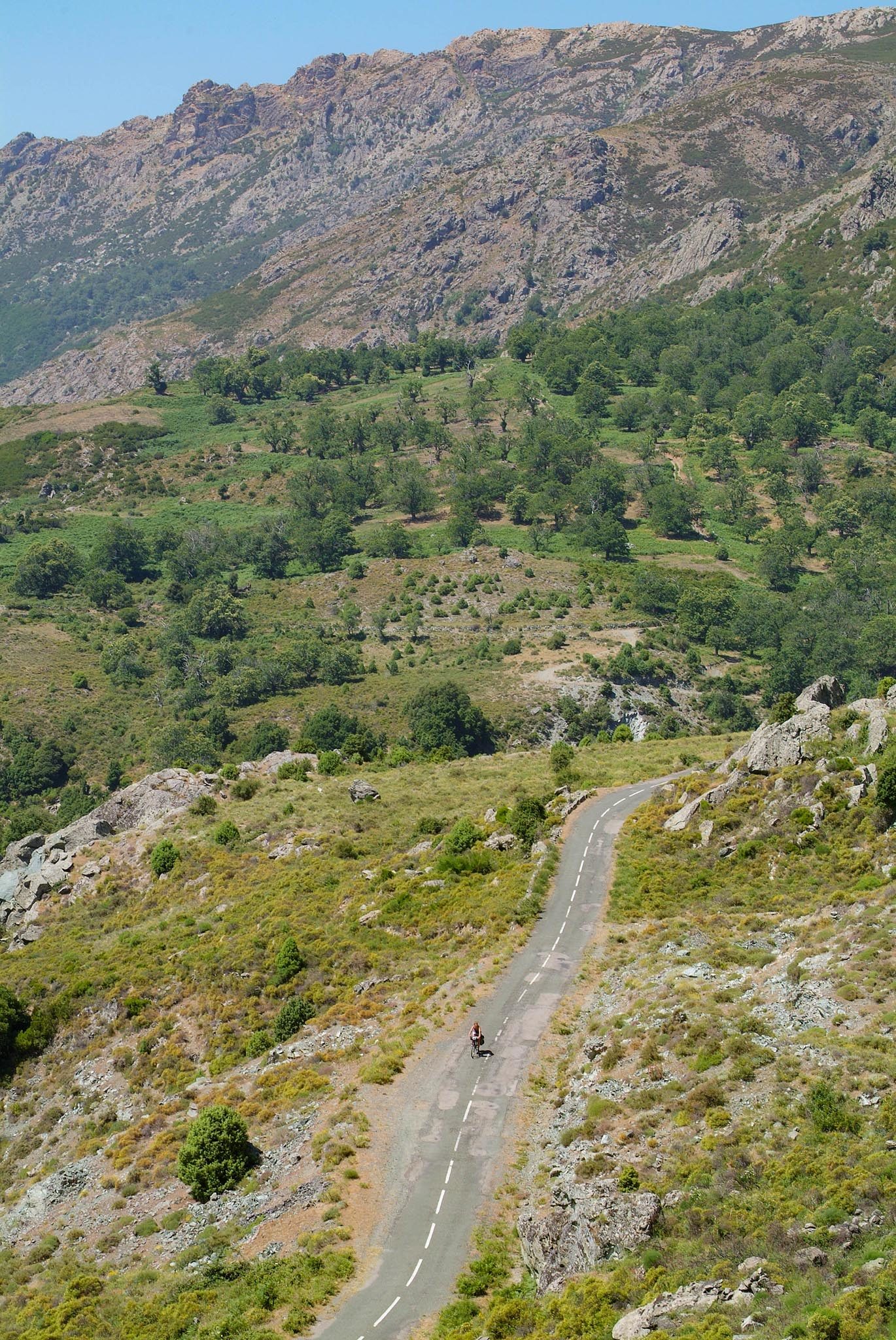 J’entre au centre de la Corse. Tout autour de moi, les sommets de l’île dépassent allègrement les 2000 mètres, avec le point culminant, le Cinto, perché à 2706 mètres d’altitude. La descente est bien entendu magnifique. Traversant une forêt de pins laricio, j’émerge dans la grande plaine d’altitude de Calacuccia. A la sortie du village, je longe un interminable ravin aride et désolé : le Golo a creusé les profondes gorges de Santa Regina. Je sors de la vallée en empruntant la D18. Le col inconnu de San Quilico est un fameux casse-patte quand la chaleur s’en mêle. Enfin, de l’autre côté, apparaît Corte. Je pourrai enfin me ravitailler en eau dans cette ville où bat le coeur de la Corse.