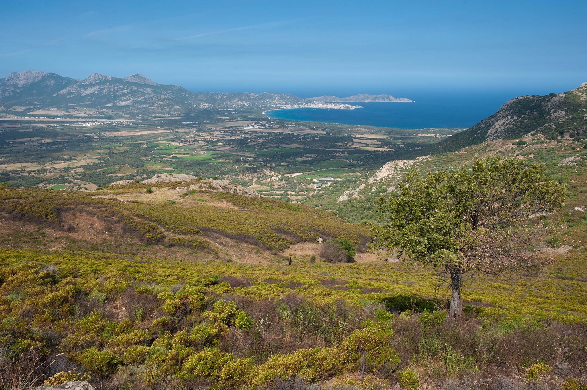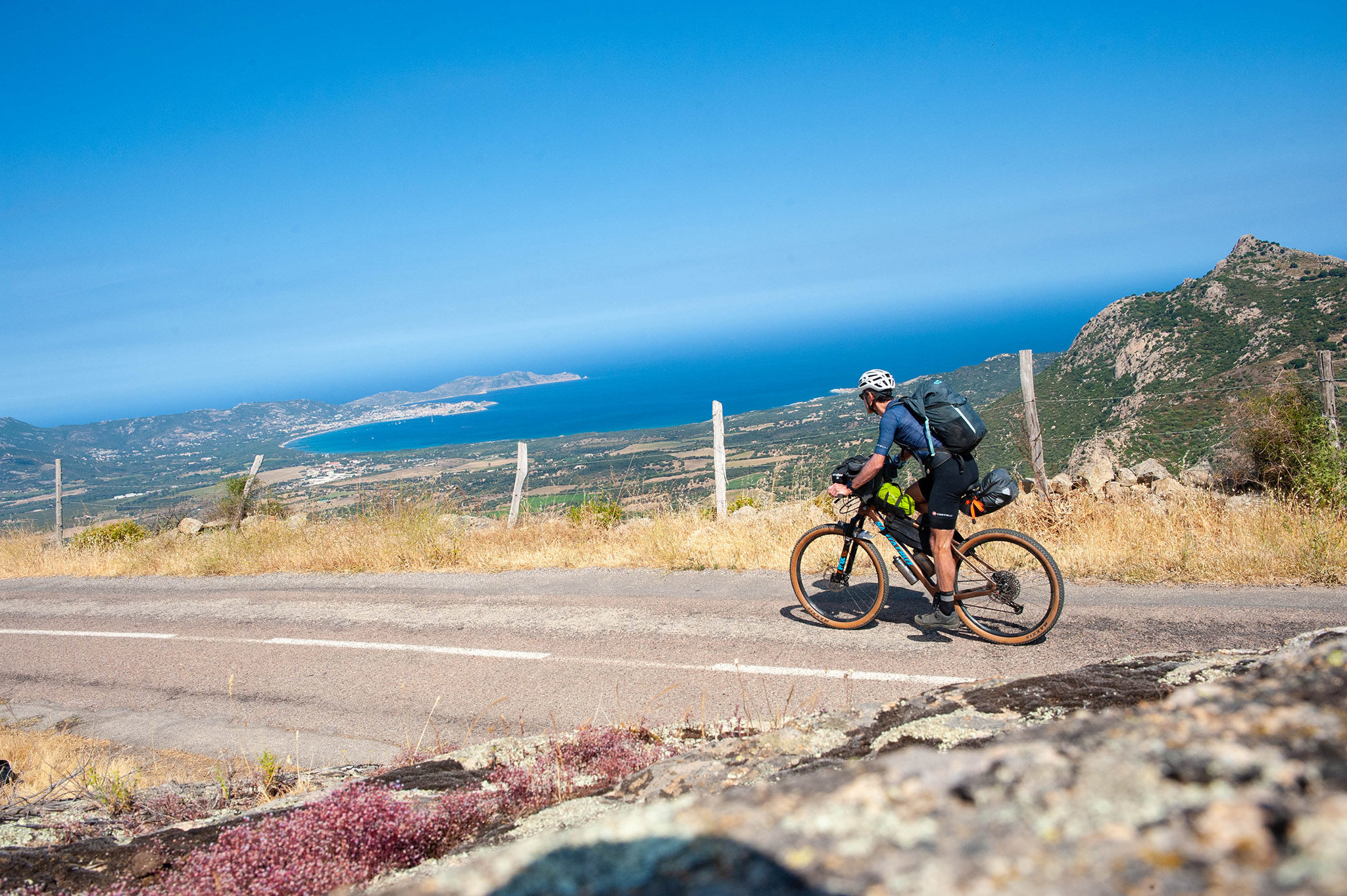 J’évolue dans un jardin d’Eden coloré de genêts, d’arbousiers, de lavande et de romarin. La route rejoint la baie de Saint-Florent et son eau turquoise : je vais y poser ma tente, fourbu après cette première longue journée sur l’île.