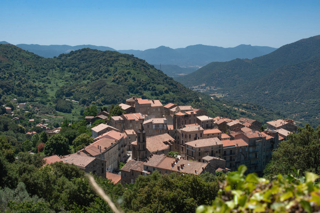 A la sortie du désert, peu après Ponte-Lecchia, c’est la porte vers le Giussani, un monde à part. Découvrir l’île à vélo permet de toucher l’âme corse qui se découvre dans cette terre oubliée. Les routes sont infinies, tournoient sans trop savoir où elles peuvent me mener, vers des champs abandonnés ou vers des villages vidés de leur population. Des hameaux qui avaient pourtant connu une certaine prospérité par l’exploitation de la châtaigne ou de l’olive, au XIXe siècle.