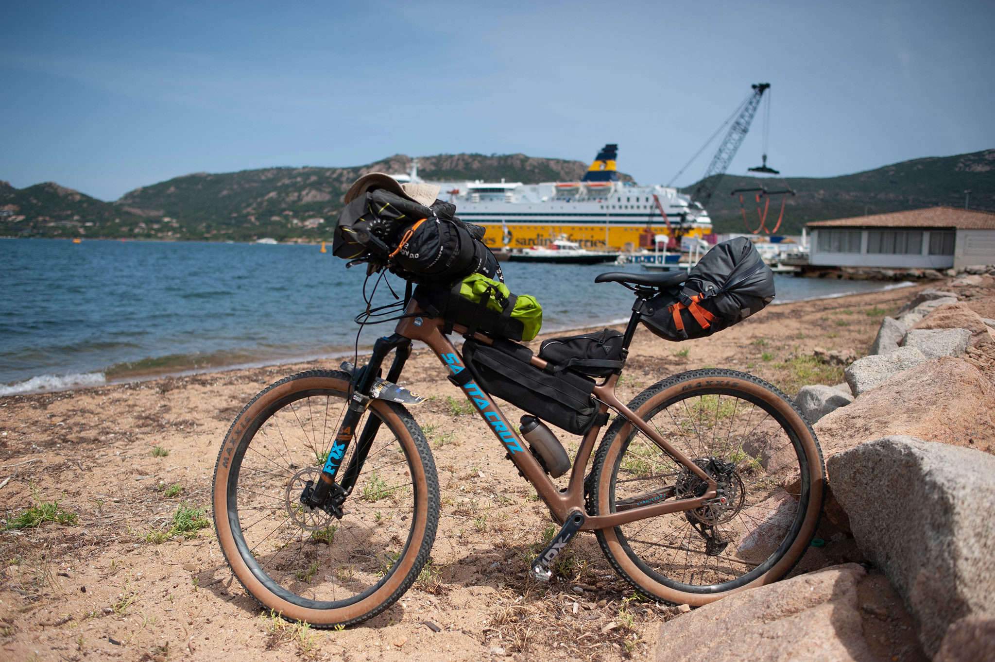 Des cales du navire, je sors en premier avec mon Santa Cruz : priorité aux usagers lents ! Sur le Pascale Paoli, j’ai pu rencontrer et sympathiser avec un autre bikepacker, César, qui prendra une autre route : dommage, l’aventure aurait pu s’effectuer à deux…