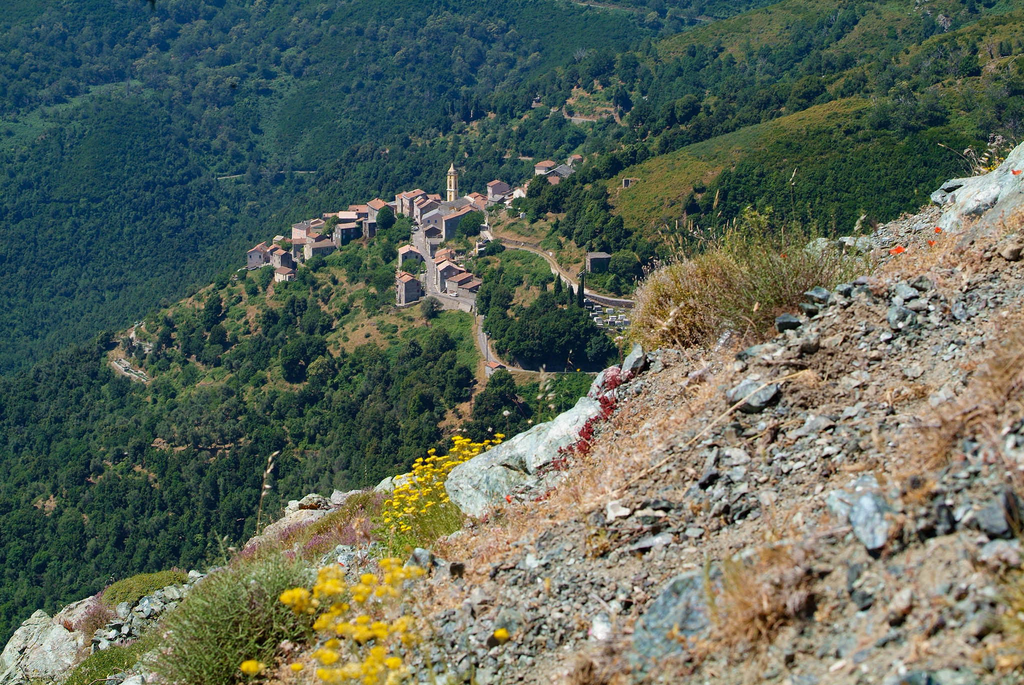 Entre Venaco et Ghisoni, l’île est un véritable mini-continent en soi. D’un paysage verdoyant, je progresse maintenant dans un territoire plus aride. En ce début de mois de juin, la chaleur est déjà accablante. Elle se ressent particulièrement dans le défilé perdu de l’Inzecca menant à Ghisoni. Le village est au pied d’un fameux col, celui de Verde. L’ascension est longue et chaque village est l’occasion de remplir les gourdes.