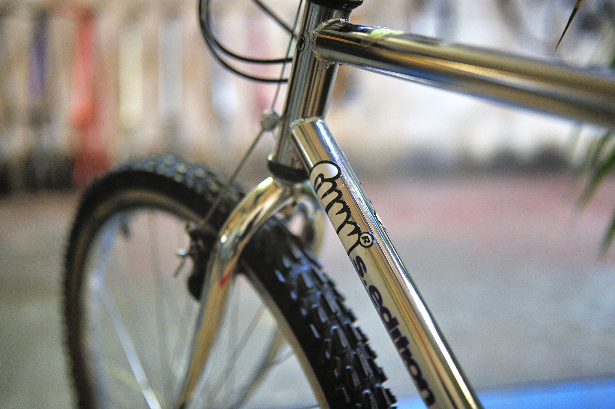 Gilles me présente une des ses plus belles restaurations, un Sunn chromé, de la grande époque de la firme de Saint-Gaudens. Il me donne envie d’enfourcher un de ces VTT qui me faisaient autrefois rêver. Sa ligne, simple et racée est étonnement moderne, mais quelle classe il s’en dégage… Seule la position sur le bike pourrait faire frémir un enduriste…