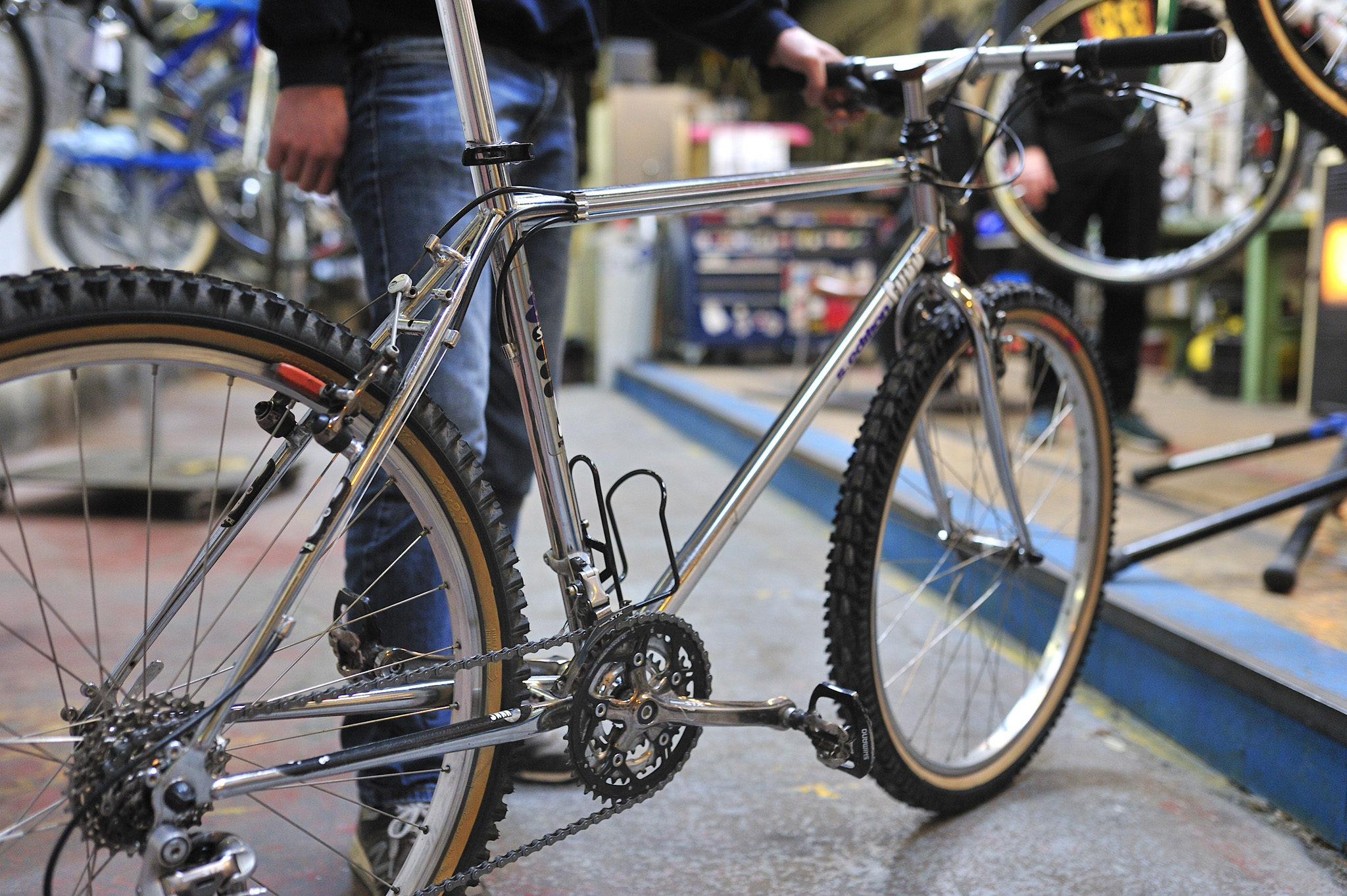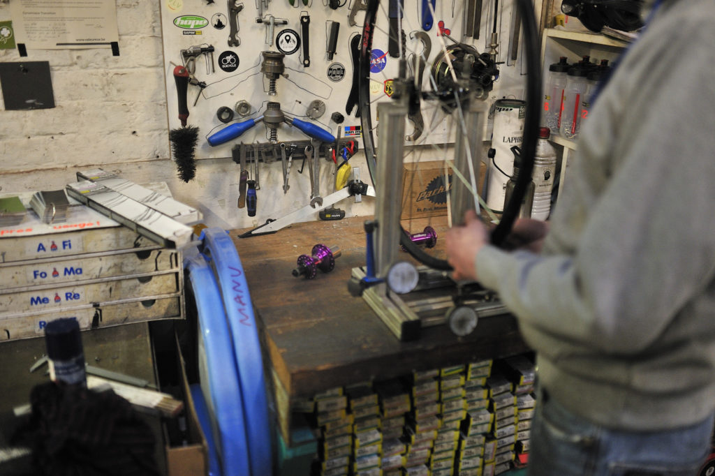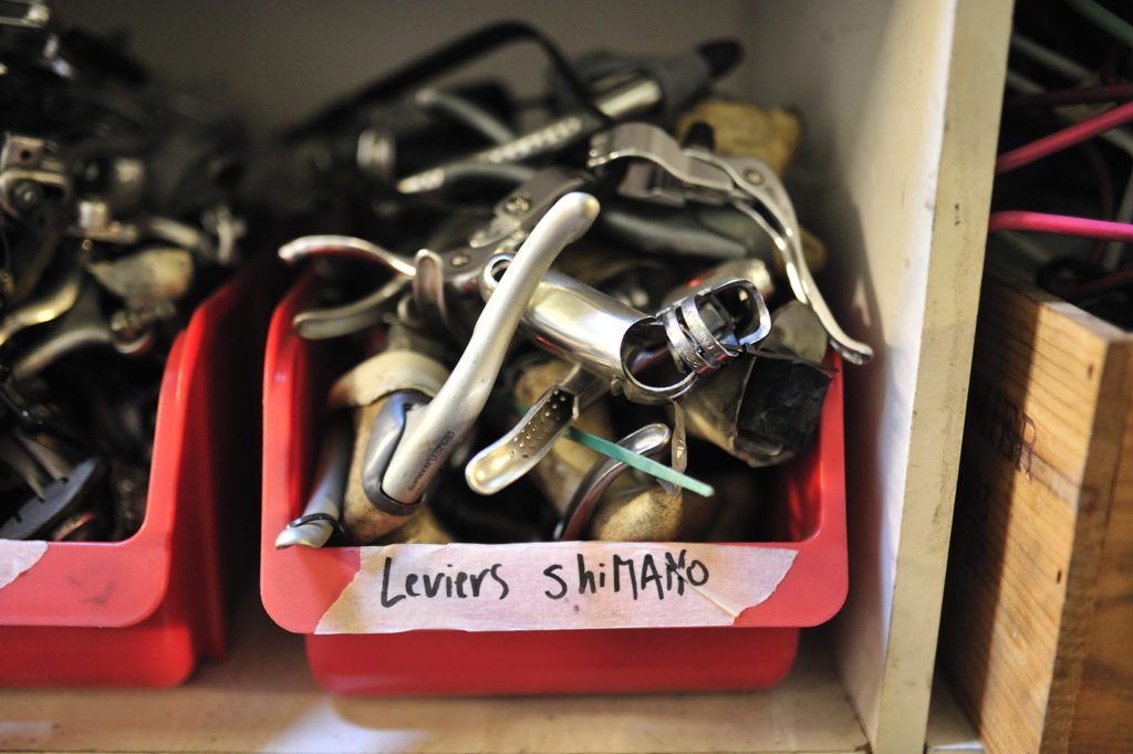 Je ne suis pas entré dans un magasin quelconque mais dans une fabrique de rêve. Amoureux du vélo et du VTT, je touche les vieux dérailleurs Campagnolo Record ou Shimano XTR de première génération, les pédaliers Stronglight, les moyeux Miche…