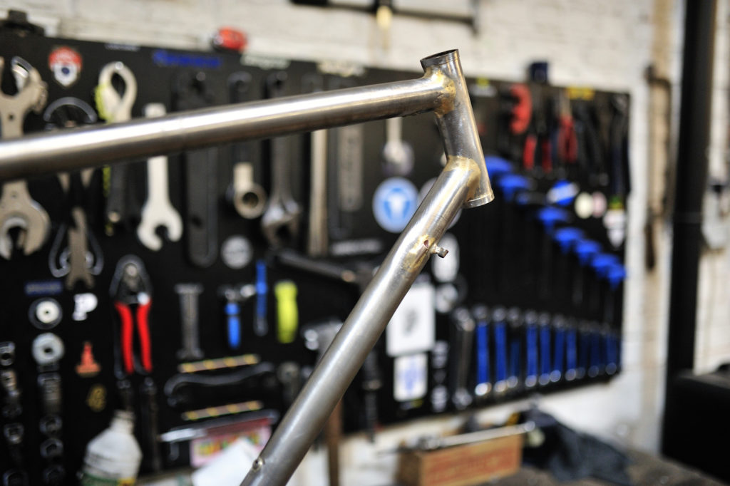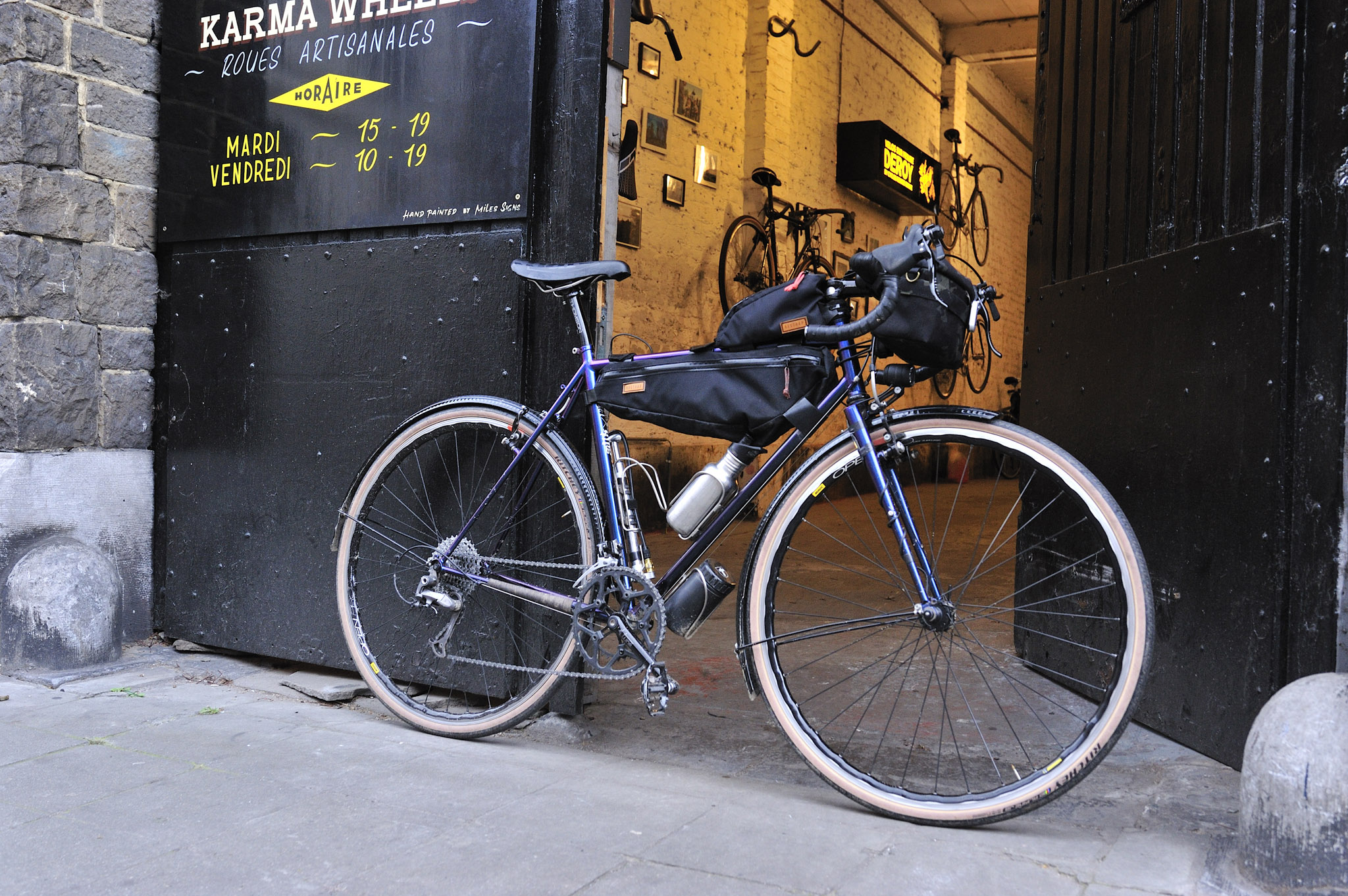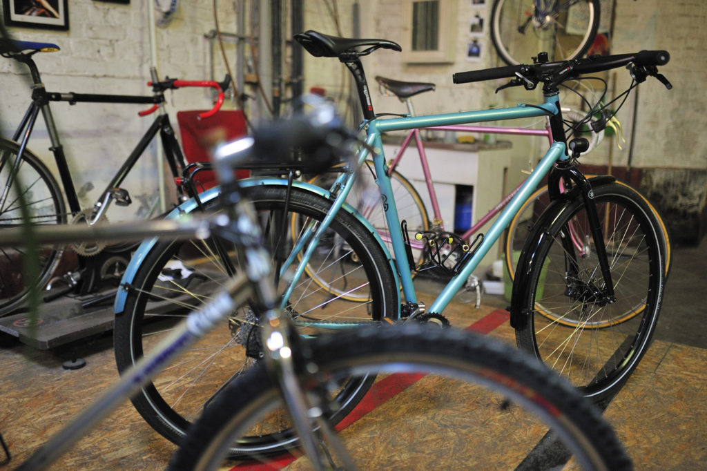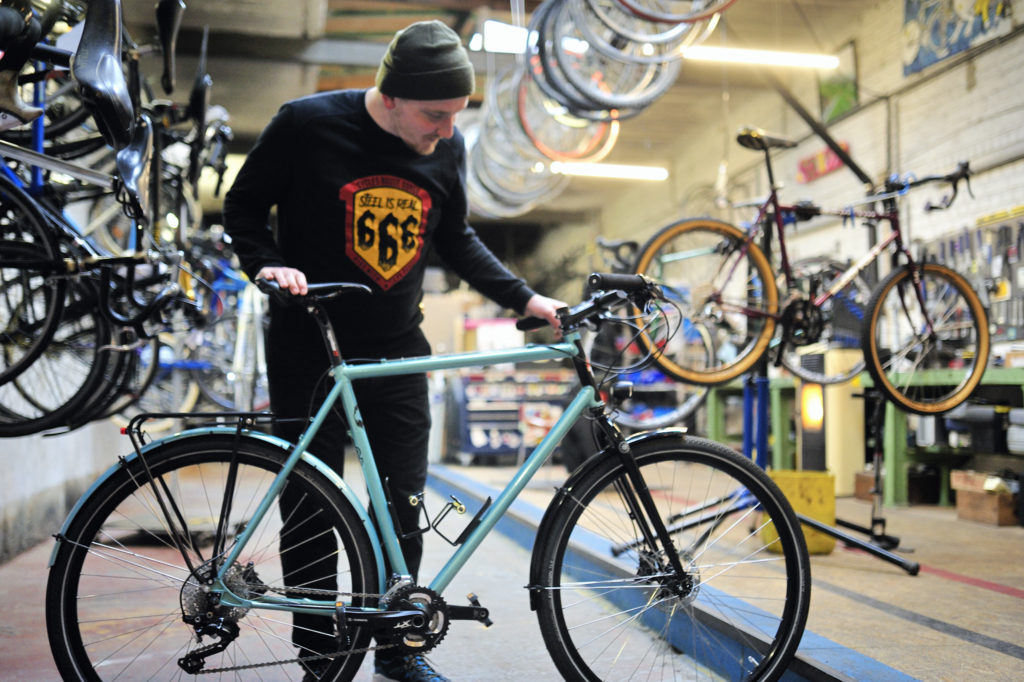 L’imagination n’a pas de limite : Yves a expérimenté, à base d’un cadre quelconque, un magnifique bike pour faire des courses au marché… Alors que Thomas soude sur le cadre des oeillets pour porte-paquets ou garde-boues : le Bikepacking et le voyage à vélo sont, par nature, une des raisons d’être de la Cyclerie. « Pour nous, le vélo est avant tout un moyen de transport, que ce soit pour se déplacer au quotidien ou pour voyager… » Gilles me montre par ailleurs de belles sacoches anglaises Restrap que la Cyclerie distribue.