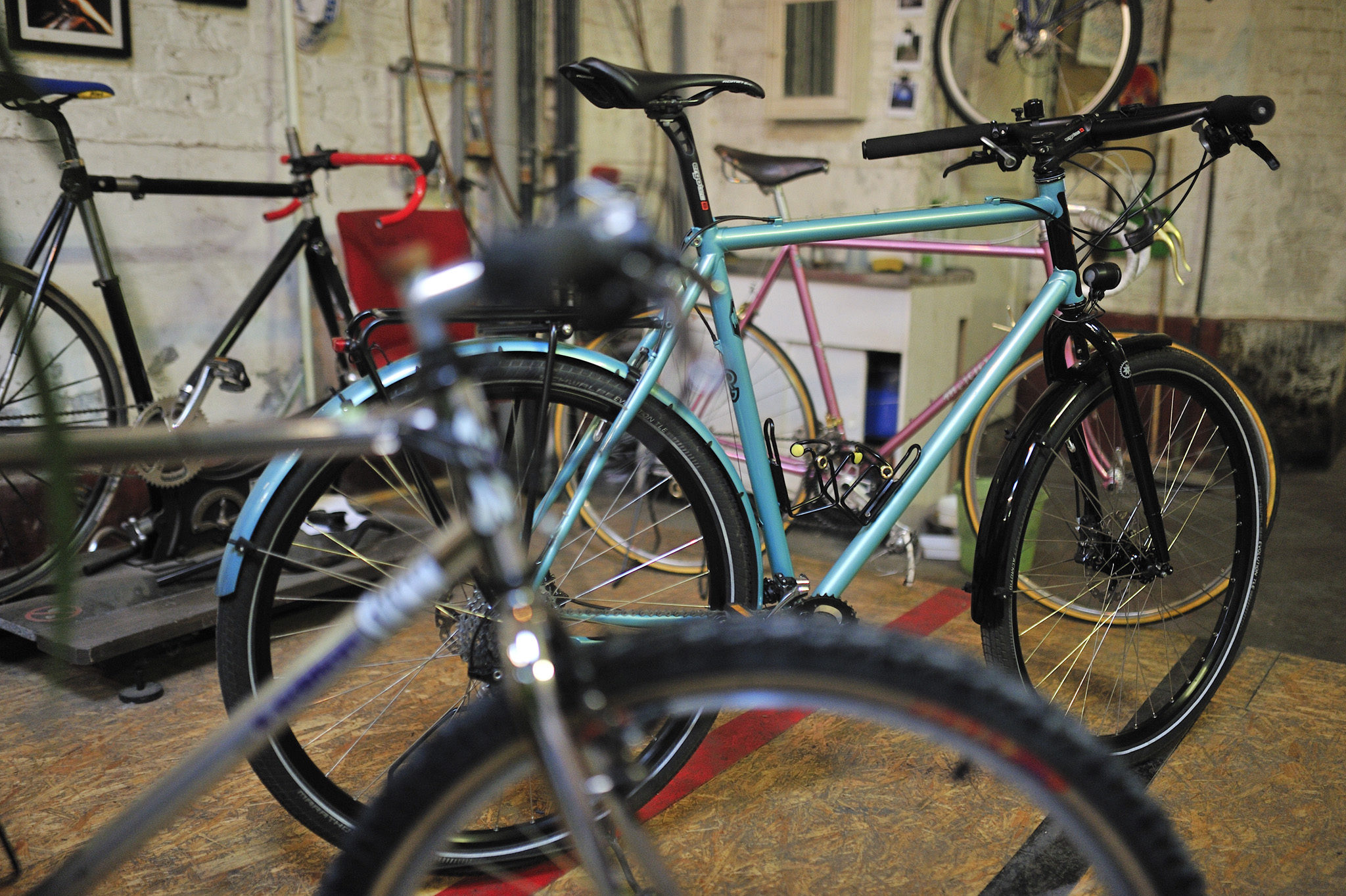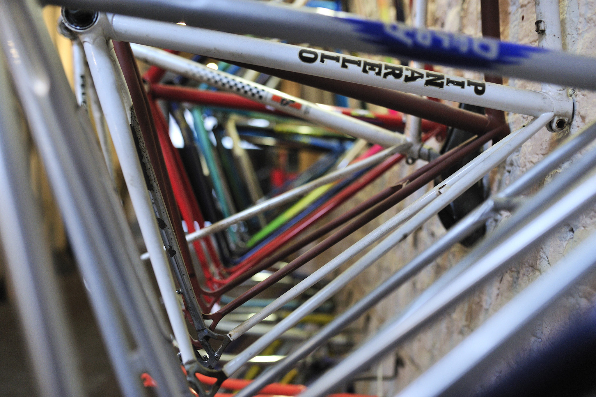 Gios, Pinarello : des noms de légende qui tapissent les murs de l’atelier.