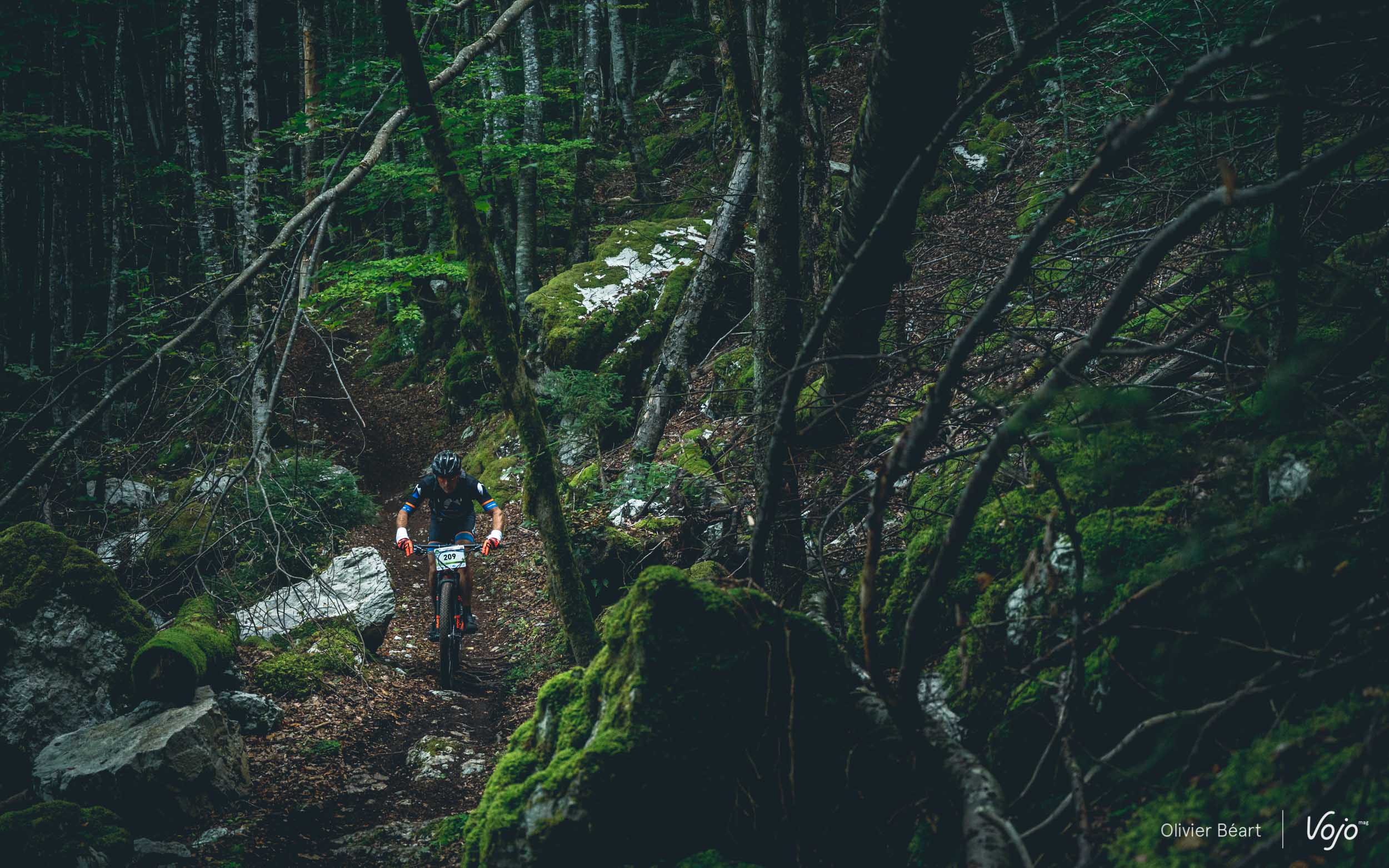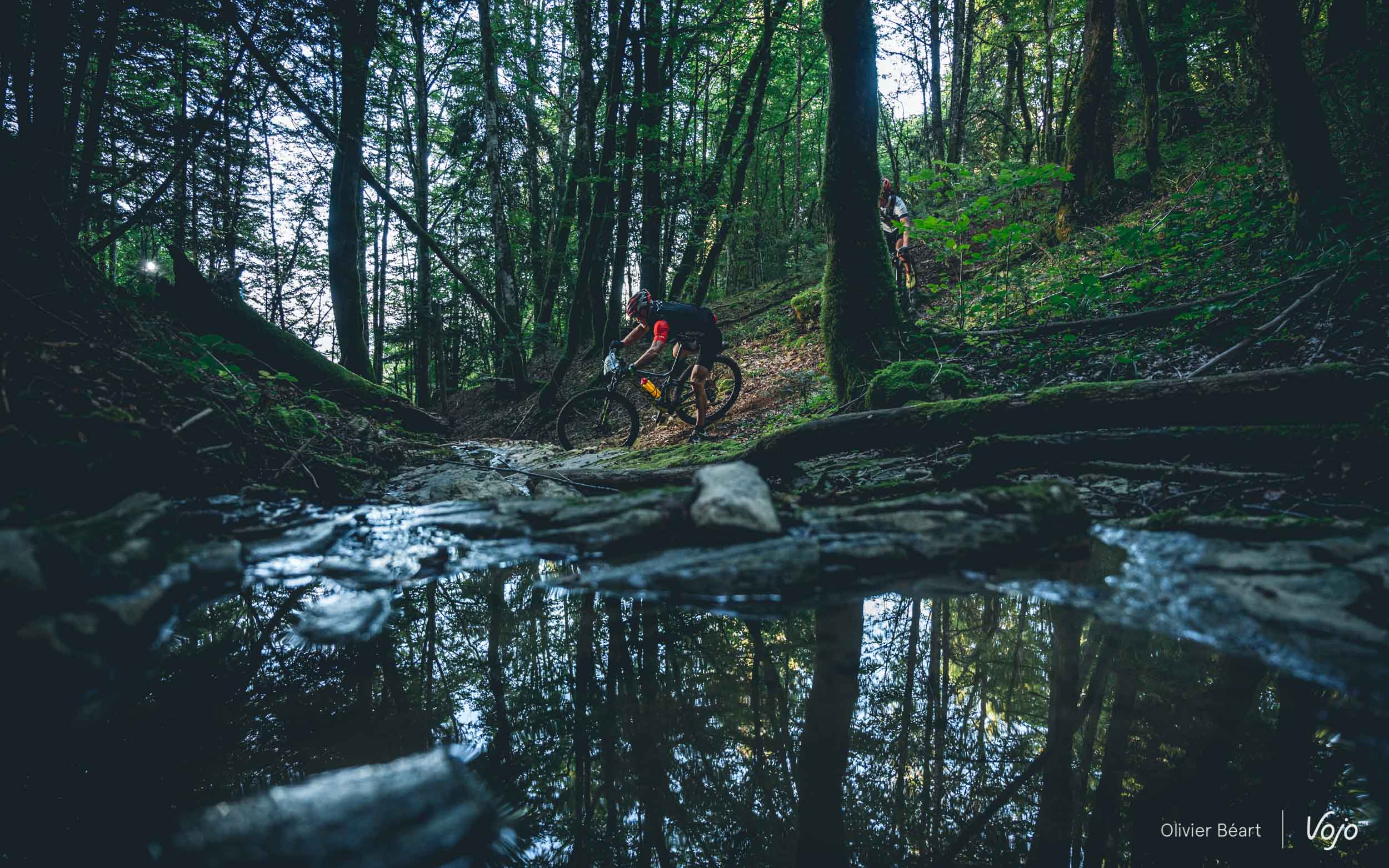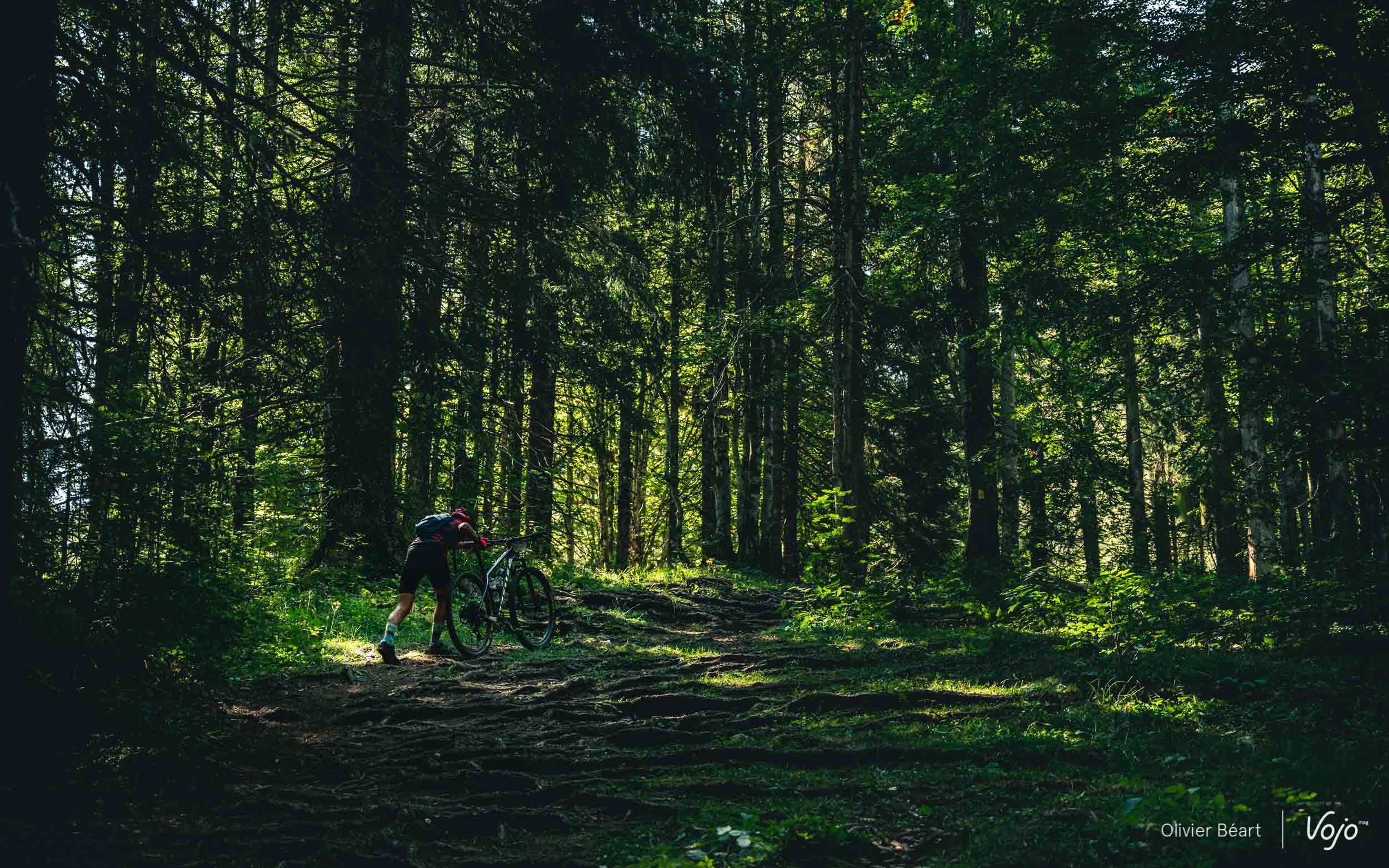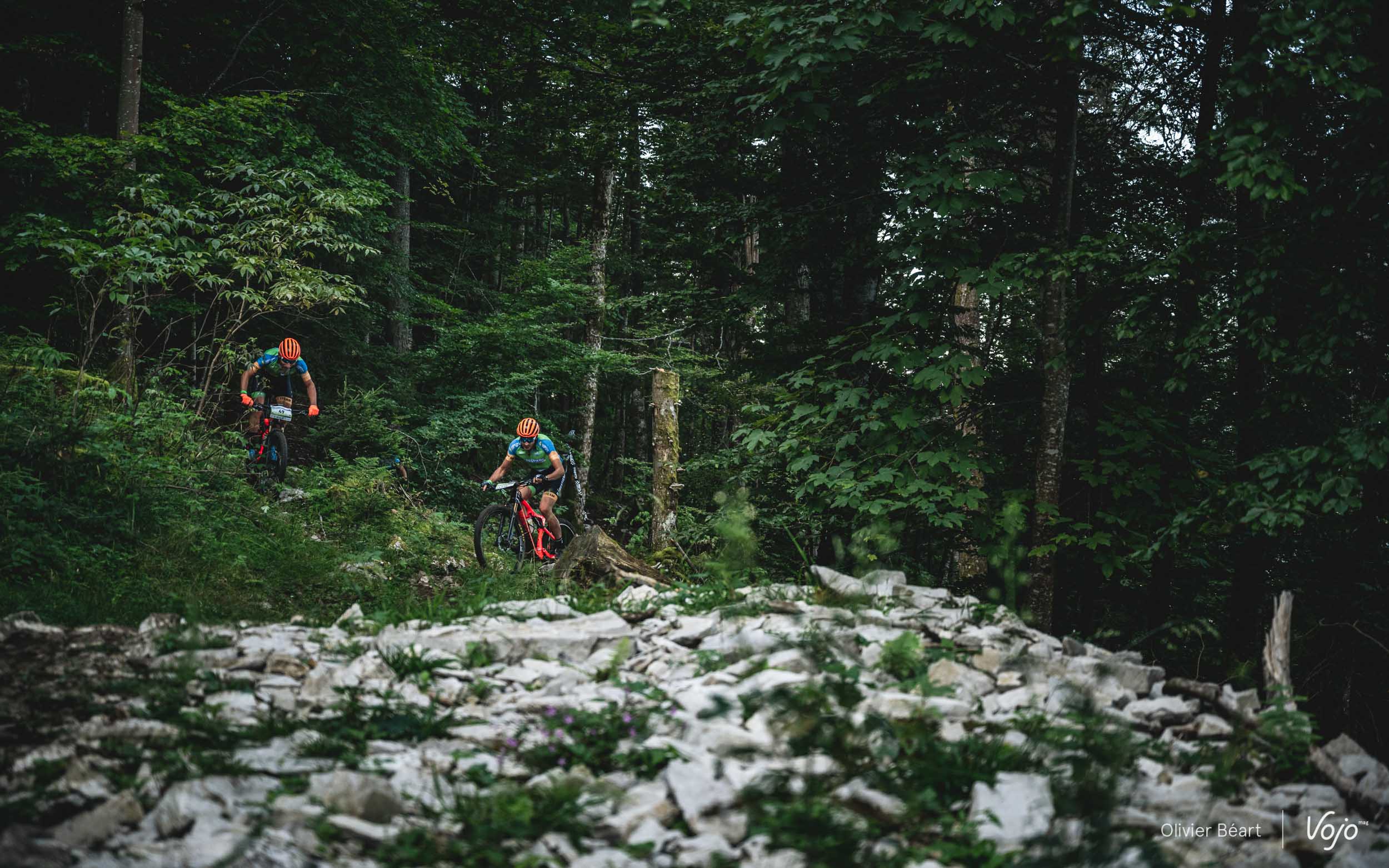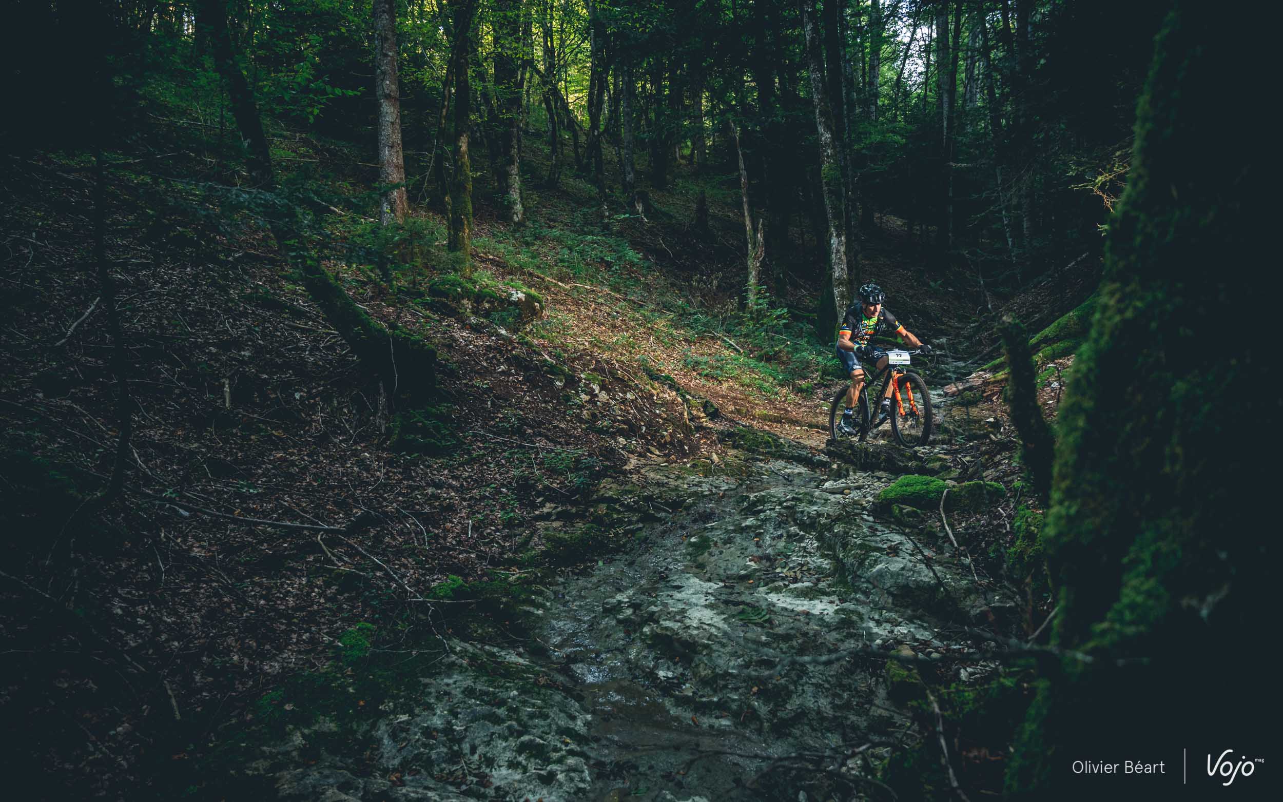 On commence par un petit singletrack sans trop de pente mais très joueur, où les deux équipiers du team La Forestière-Rosti se chambrent et s’amusent à se doubler en prenant des lignes un peu différentes.