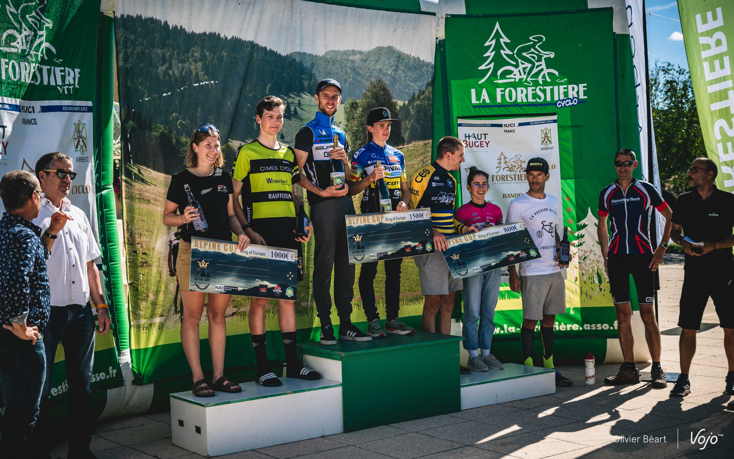 Troisième de la course du jour, Estelle Morel remporte le général de l’Alpine Cup, dont vous voyez ici le podium final masculin et féminin.