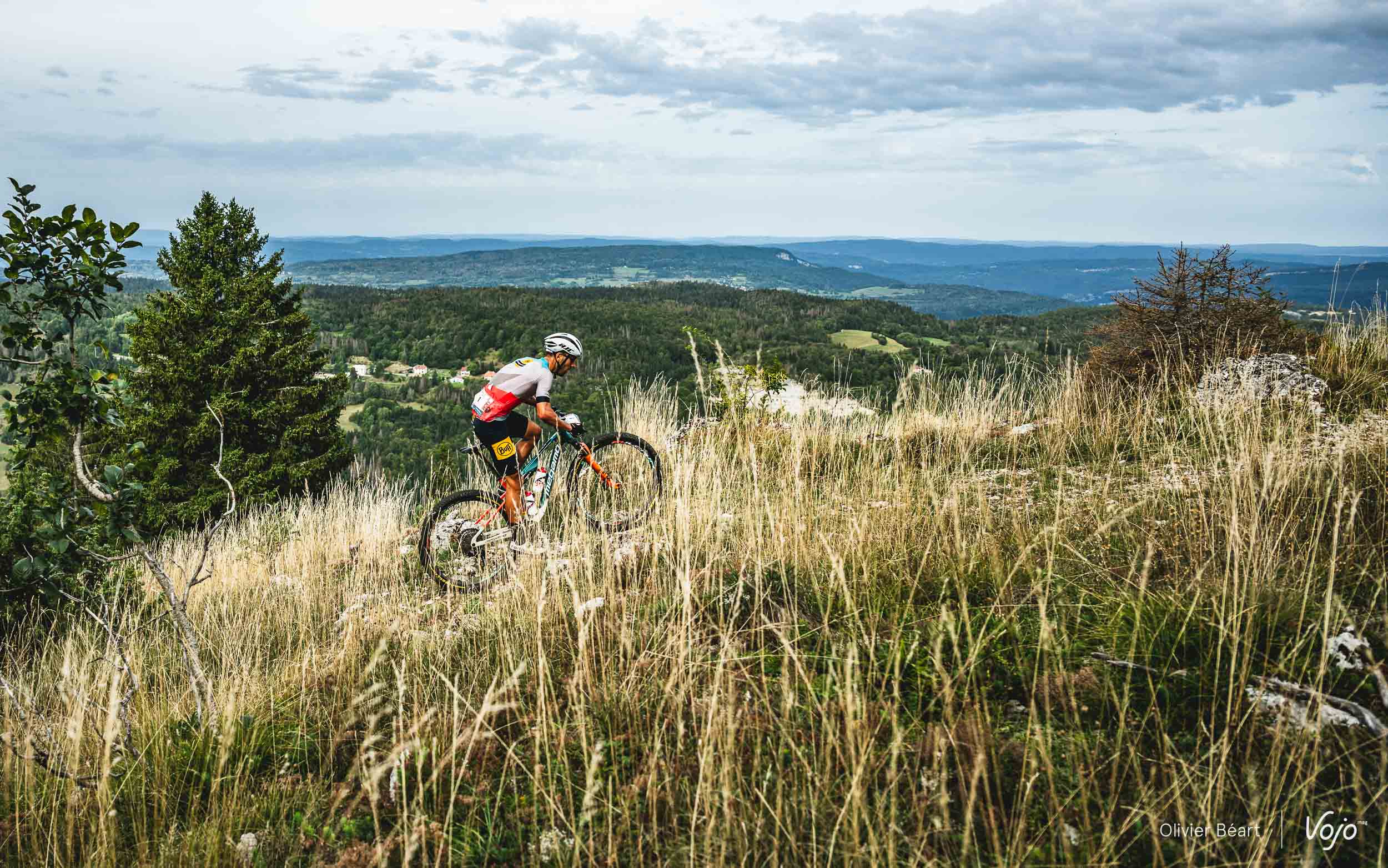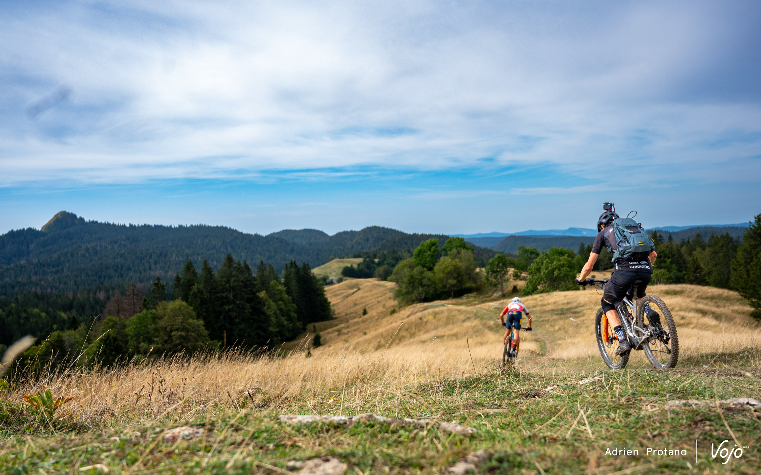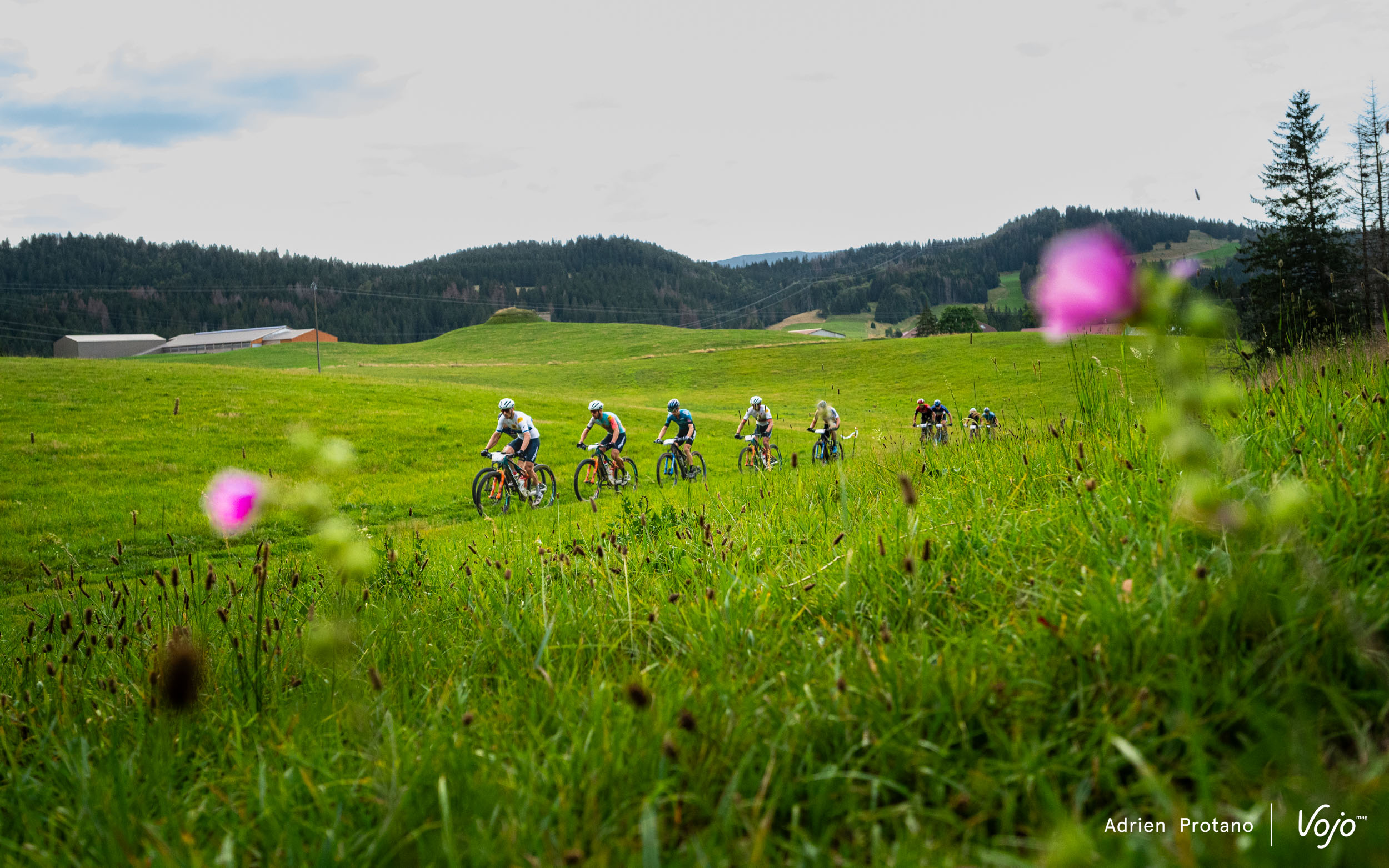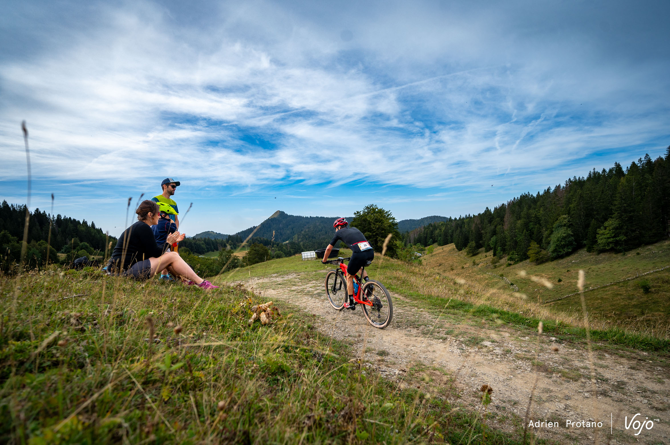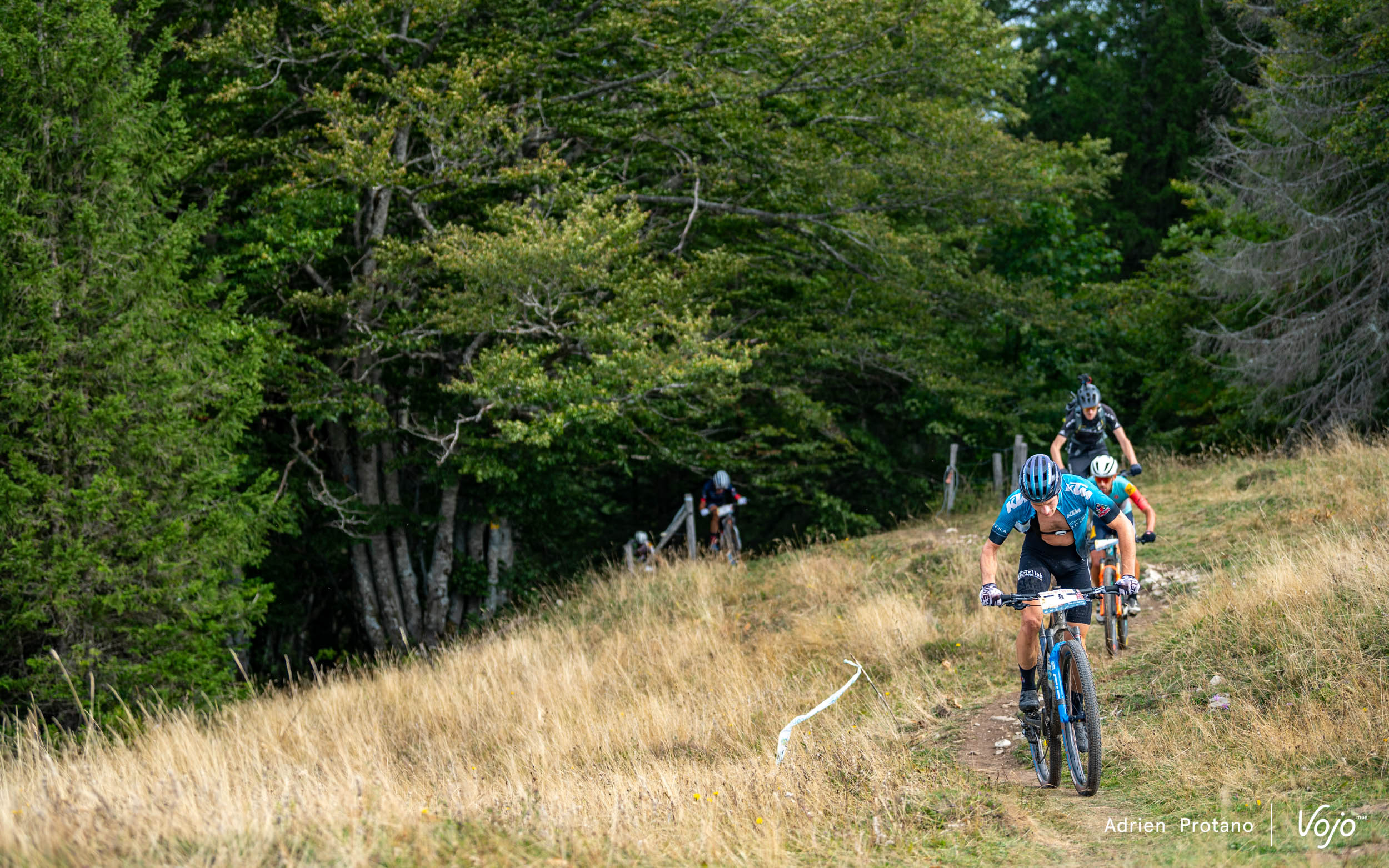 Impossible de suivre les meilleurs dans la descente vers St-Claude, et c’est donc au niveau du magnifique panorama de la Croix des Bouchoux que nous retrouvons la tête de course. Au terme d’une ascension longue et cassante, Hugo Drechou a réussi à se détacher en compagnie de l’Allemand Martin Frey.